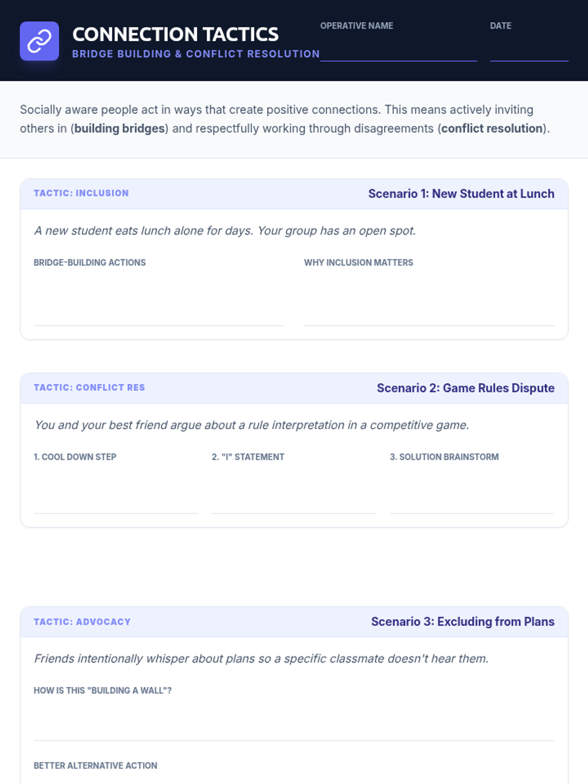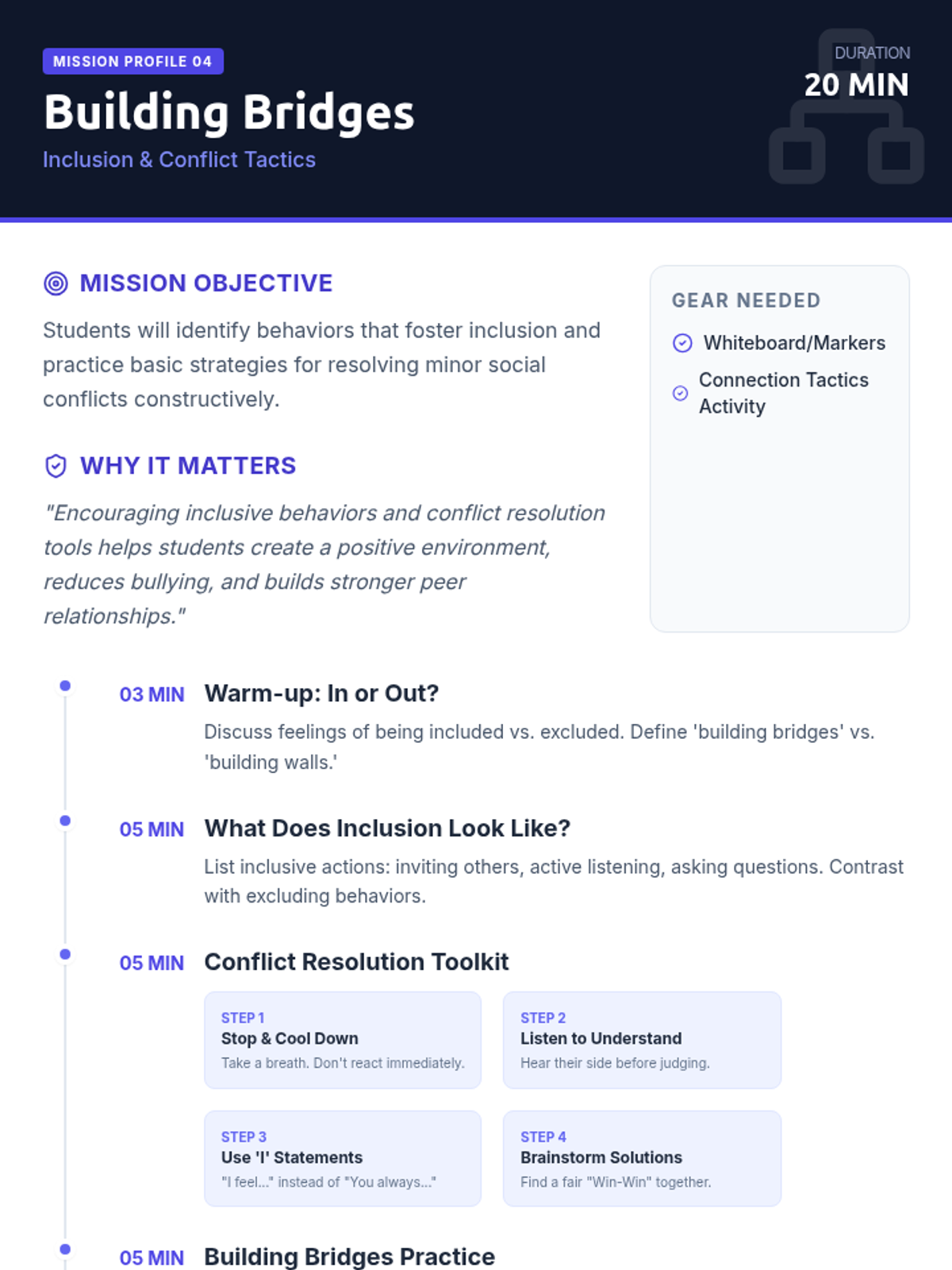 Students explore inclusive behaviors and basic conflict resolution strategies to build positive peer connections.