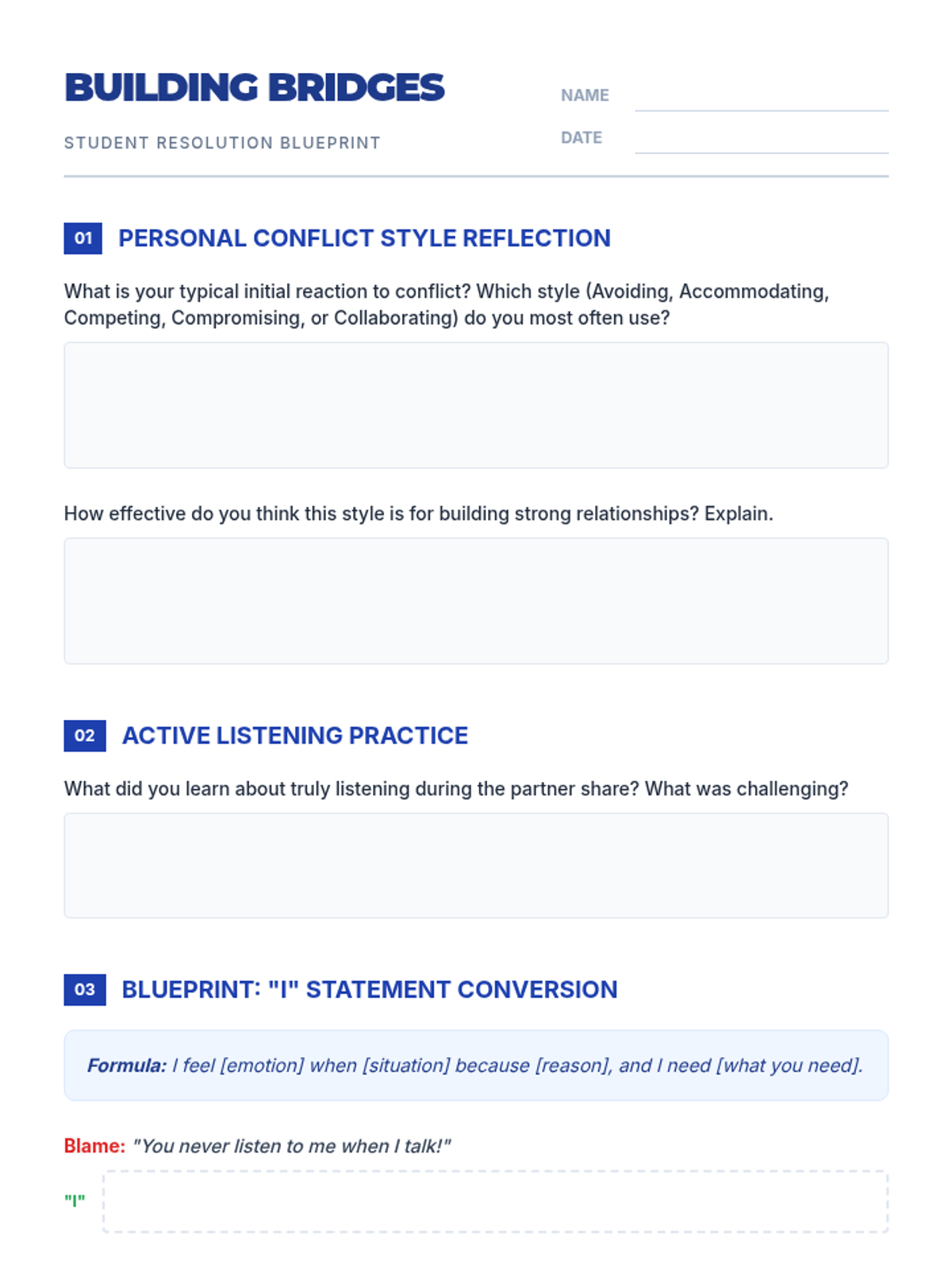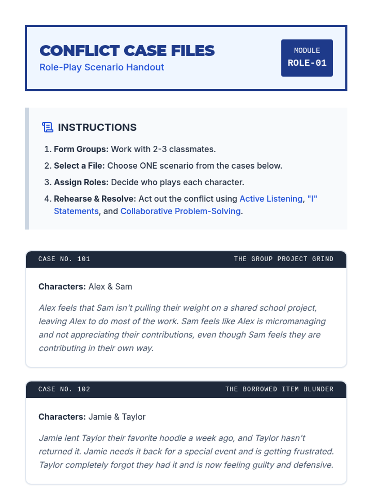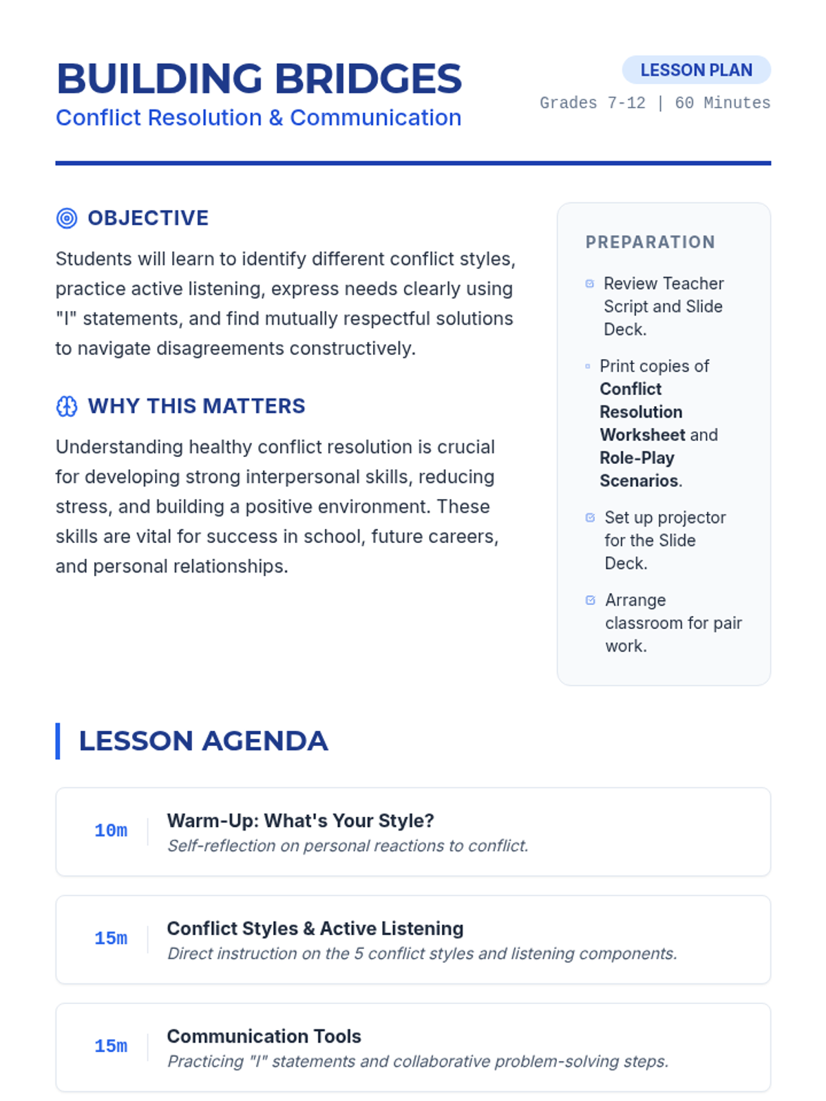 A 60-minute lesson for grades 7-12 focused on developing healthy conflict resolution skills, including active listening, 'I' statements, and collaborative problem-solving.