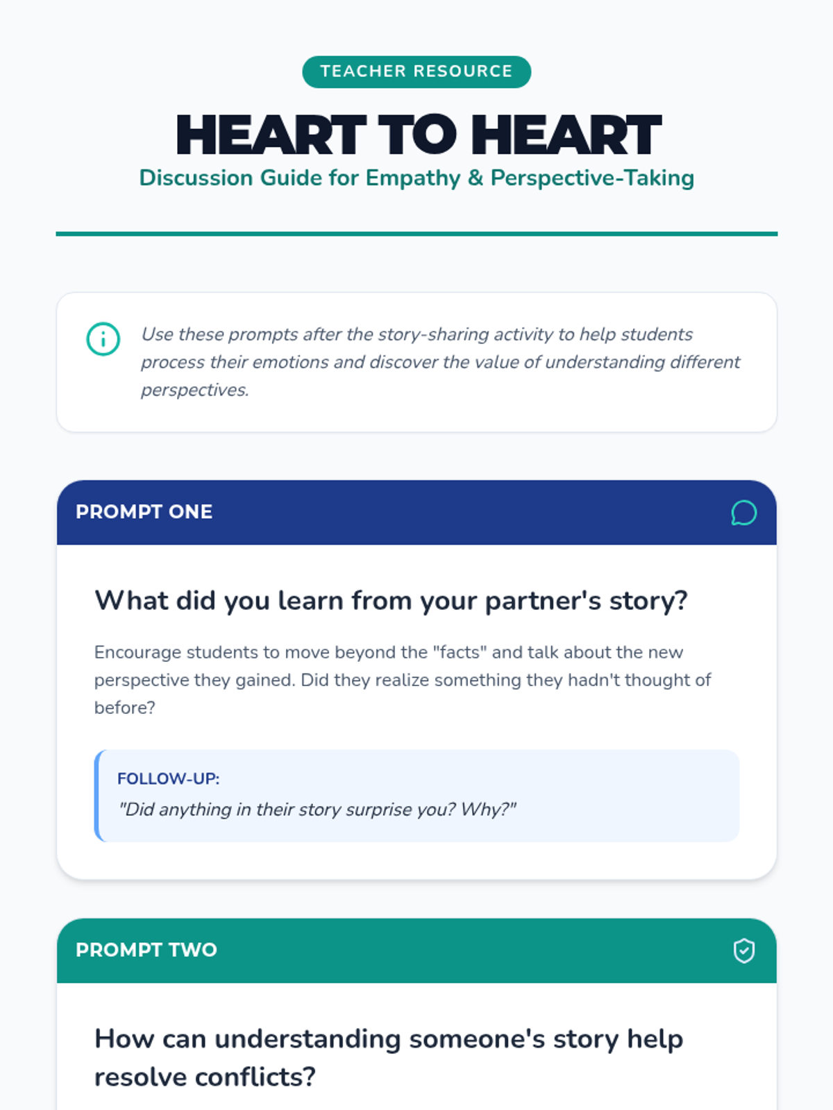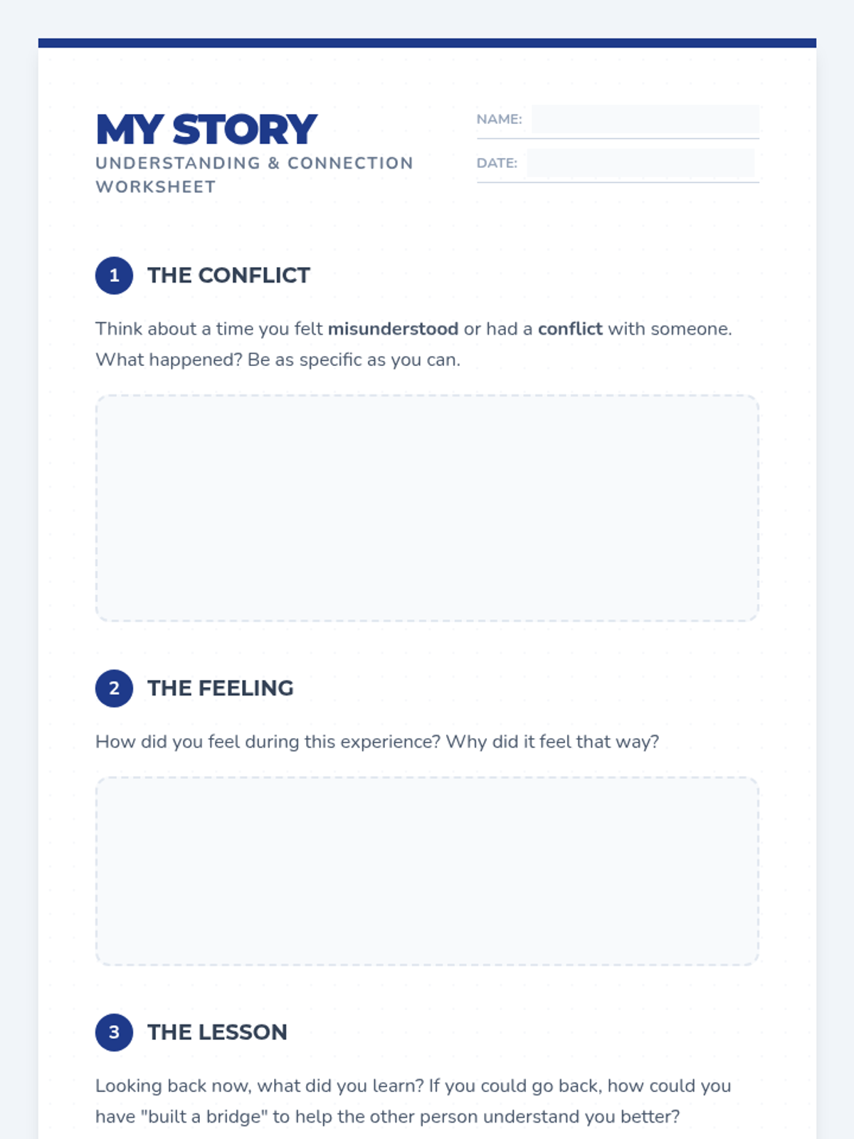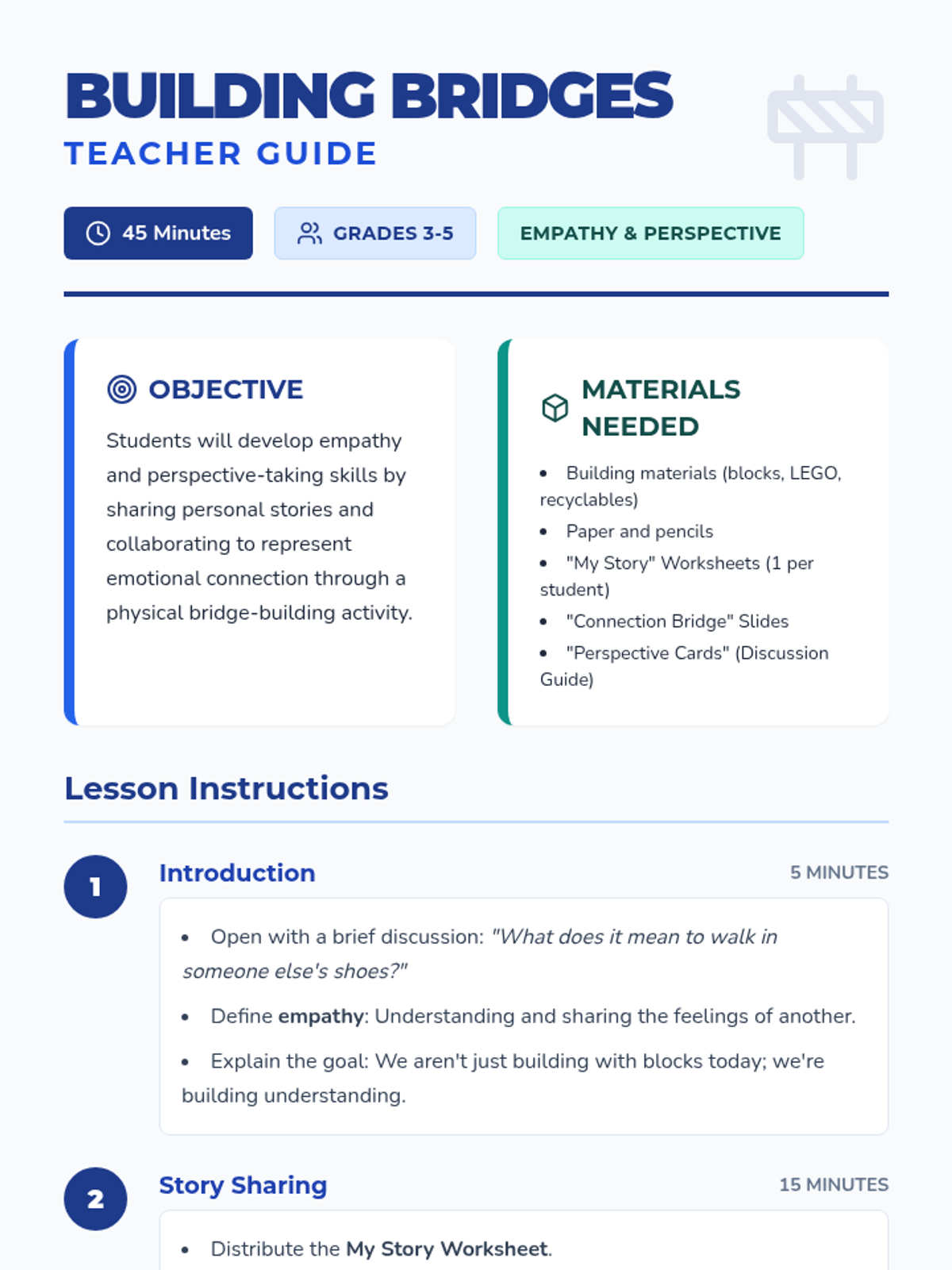 A collaborative lesson for Grades 3-5 focused on empathy and perspective-taking. Students share personal stories of being misunderstood and work together to build physical 'bridges' representing connection and mutual understanding.