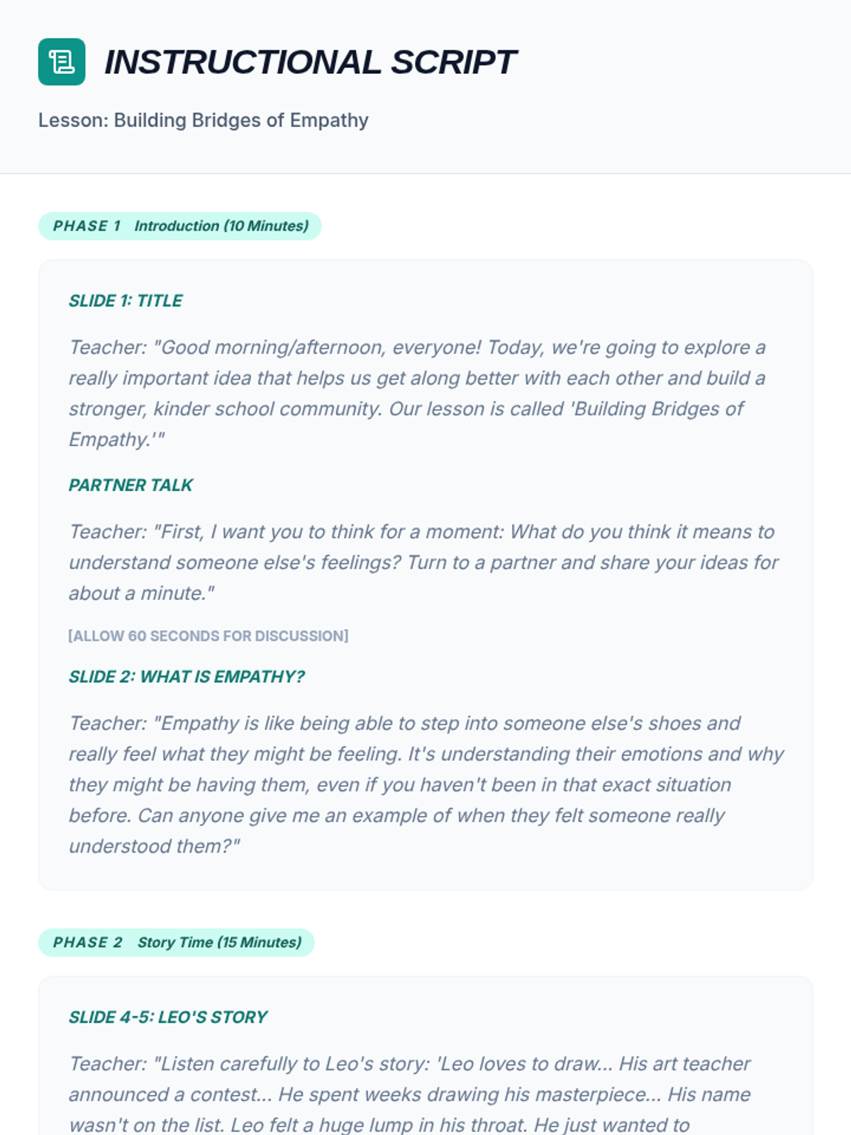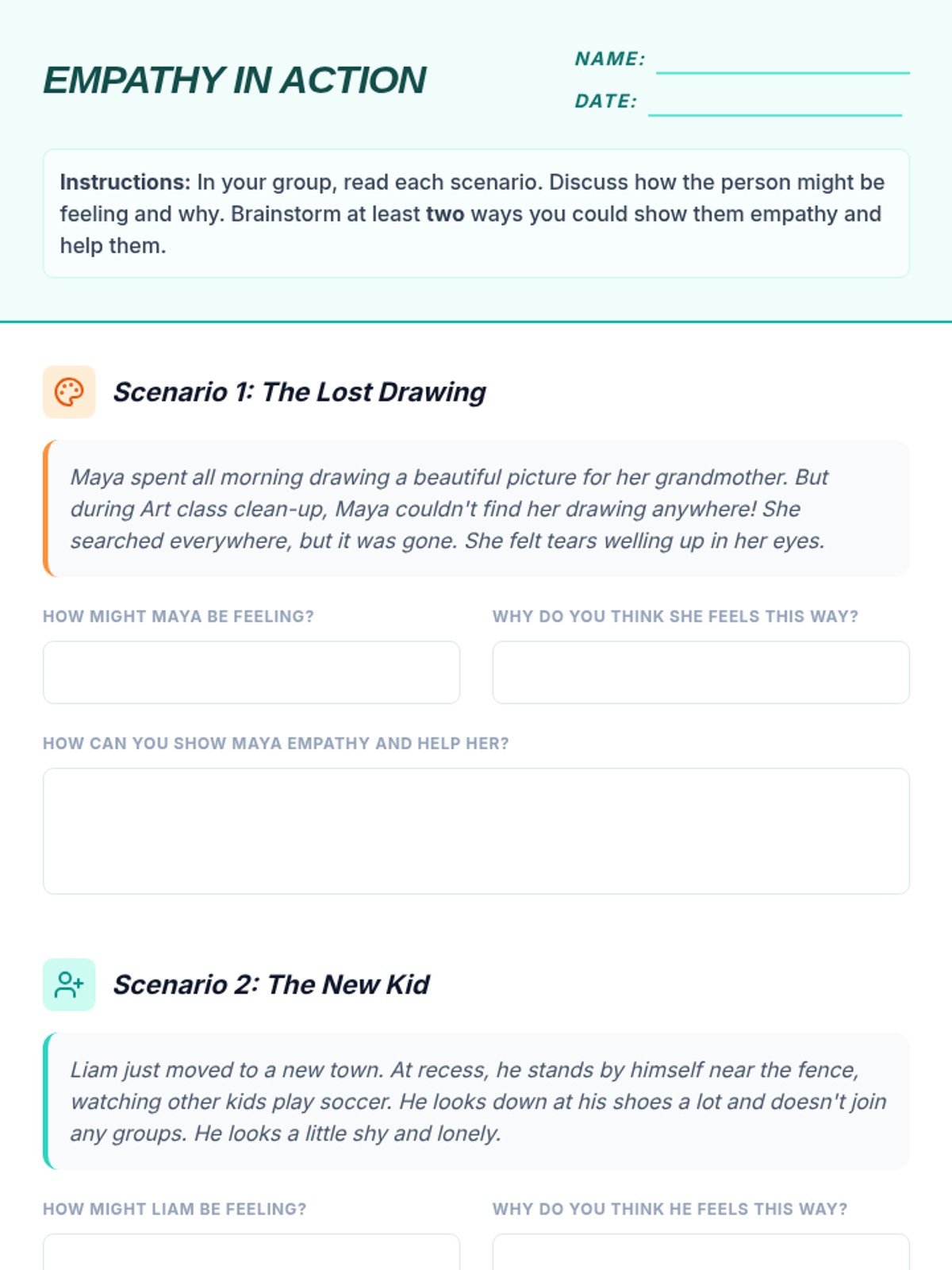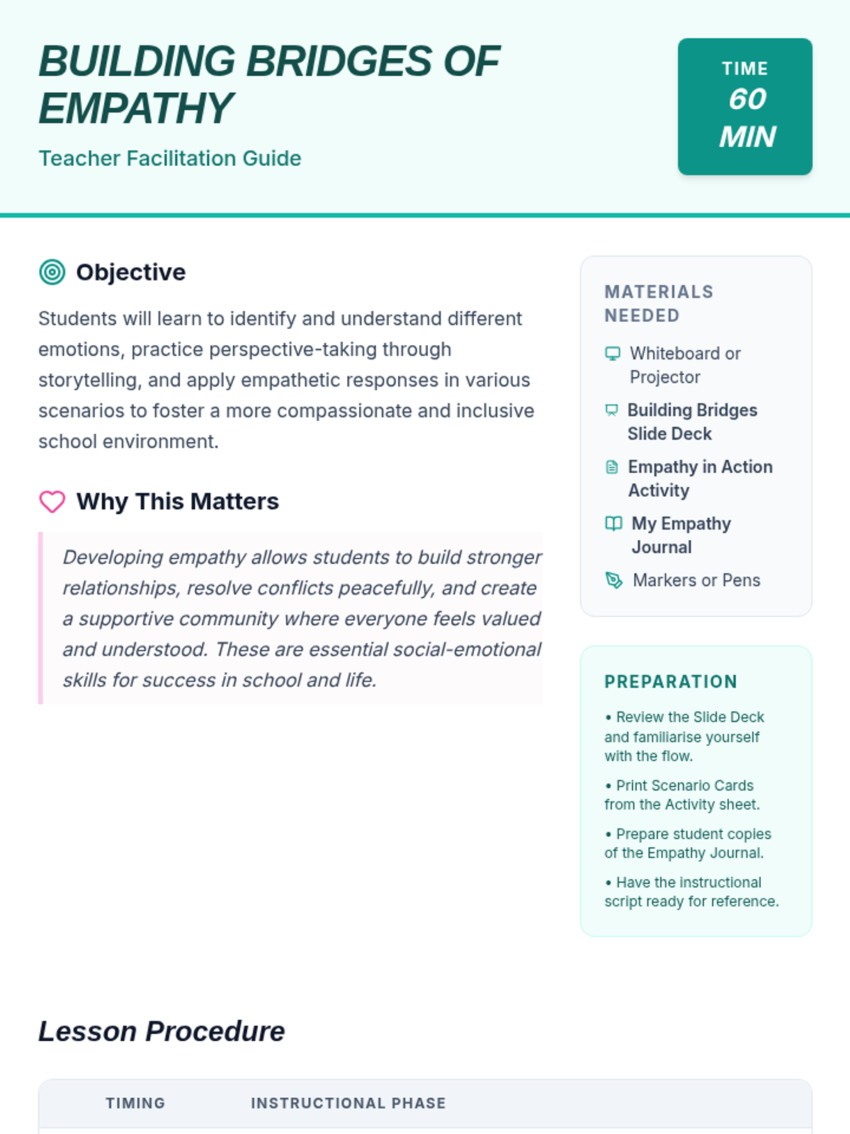 A comprehensive Social-Emotional Learning lesson focused on developing empathy through storytelling, perspective-taking, and reflective practice. Students explore what it means to 'walk in someone else's shoes' and build a more compassionate school community.
