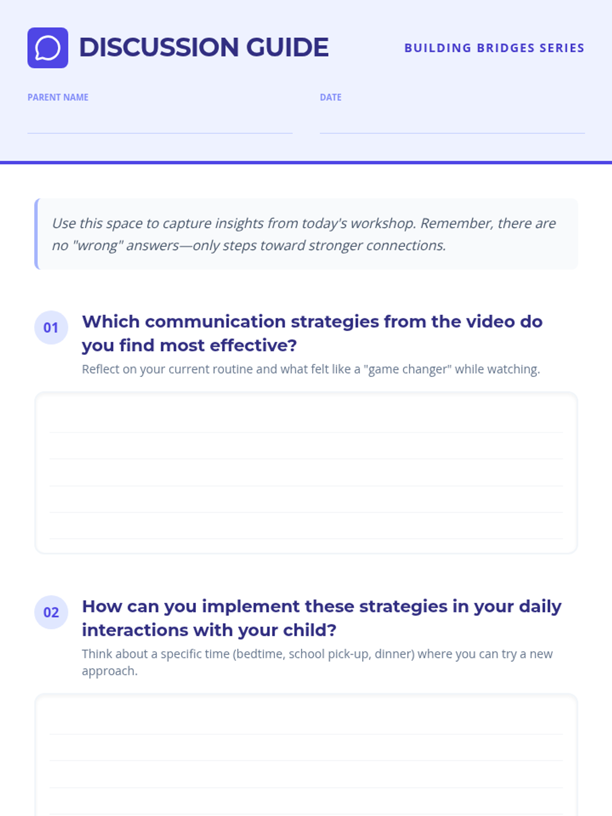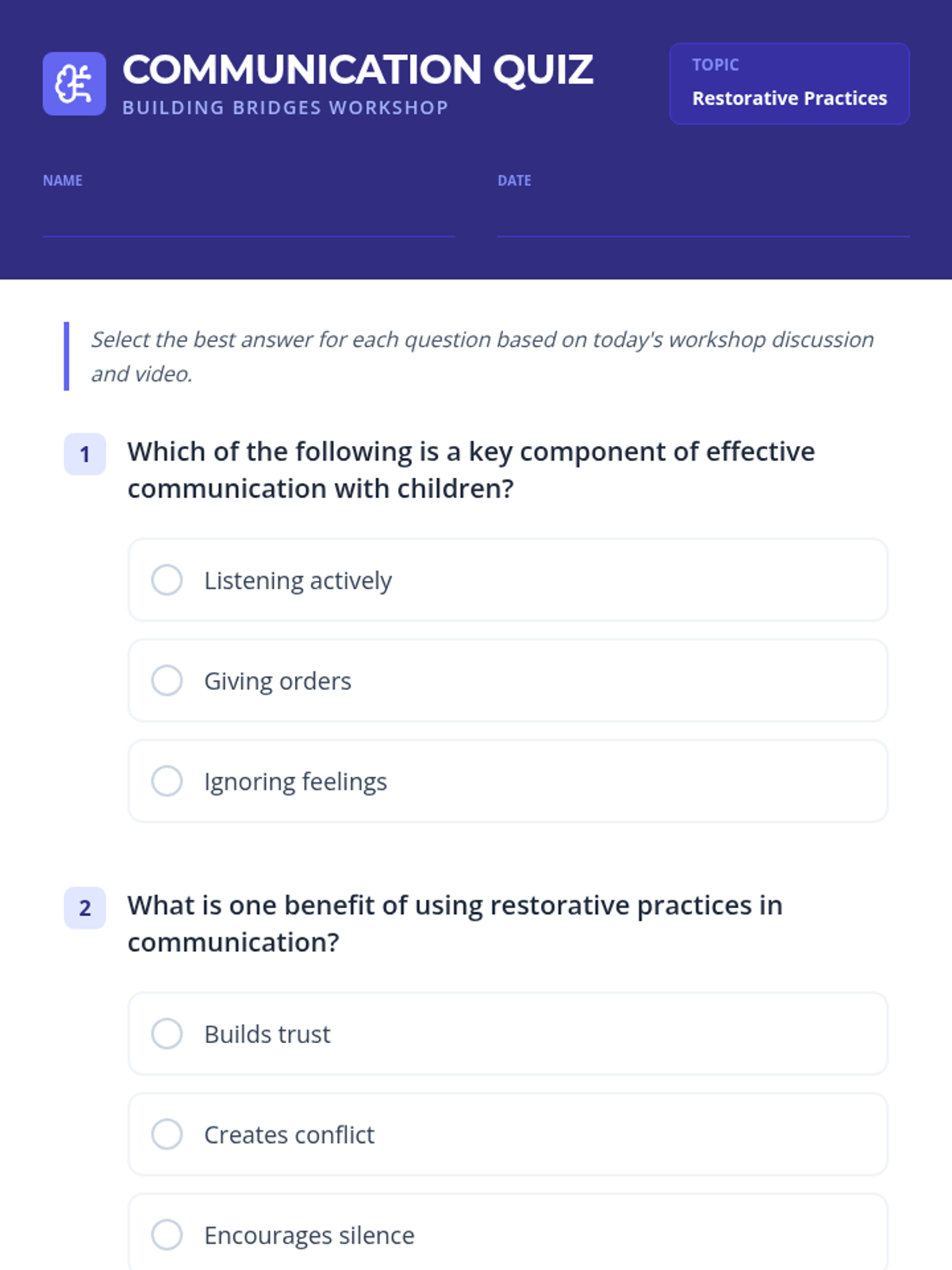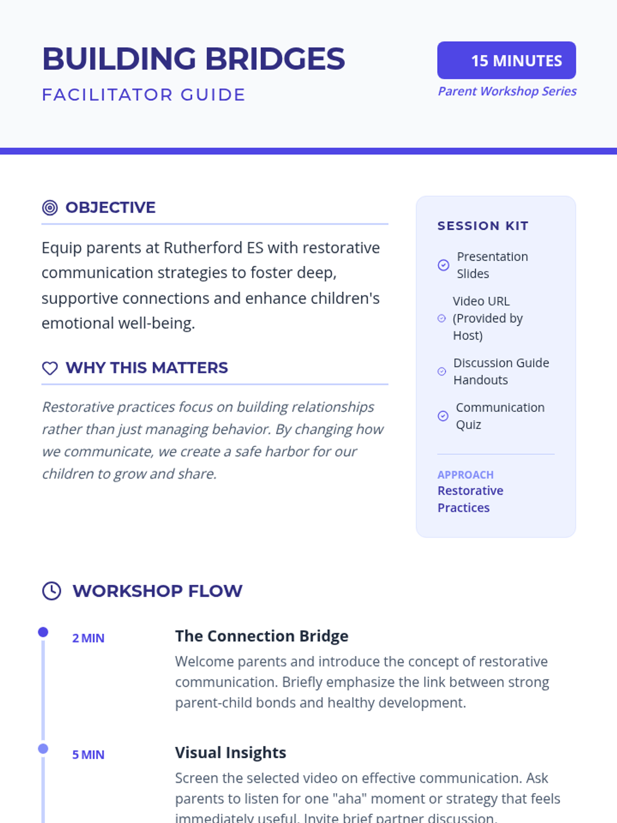 A 15-minute workshop for parents focusing on restorative communication strategies to strengthen parent-child bonds and foster a supportive home environment.