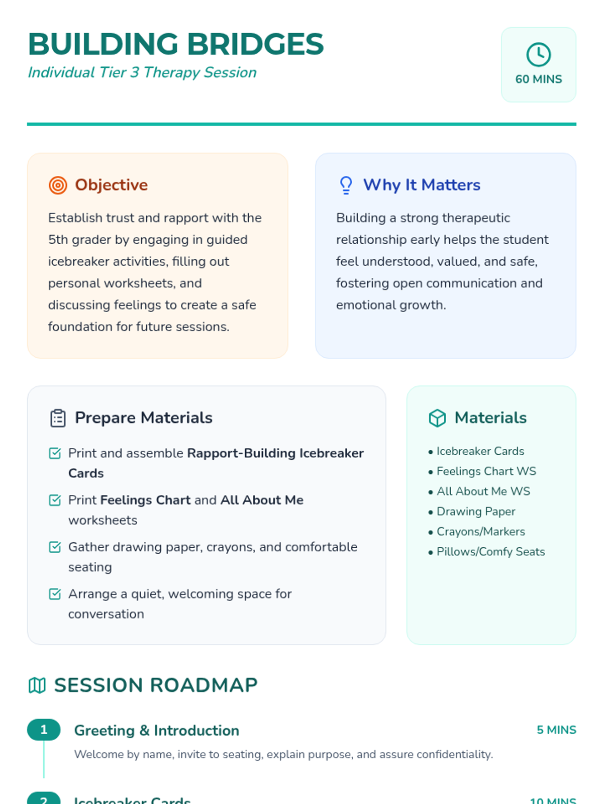 A foundational Tier 3 therapy session for 5th graders focused on establishing trust, rapport, and emotional safety through interactive activities and personal sharing.