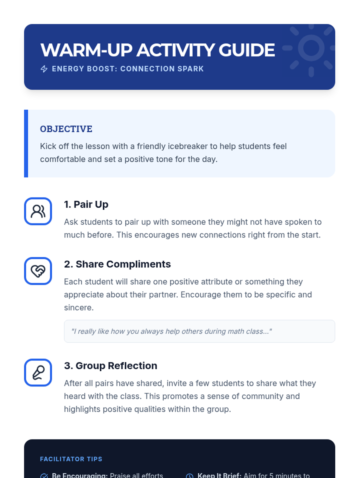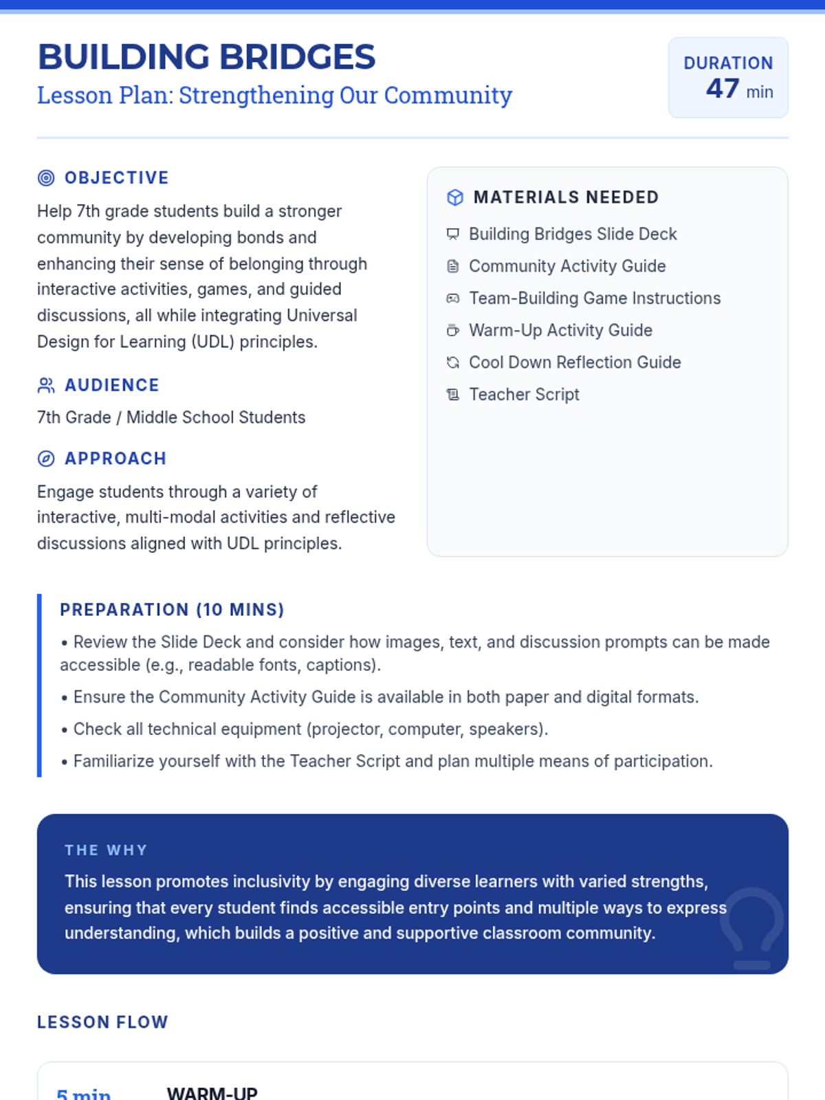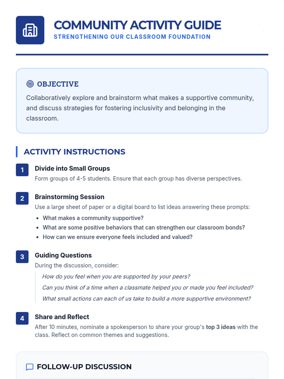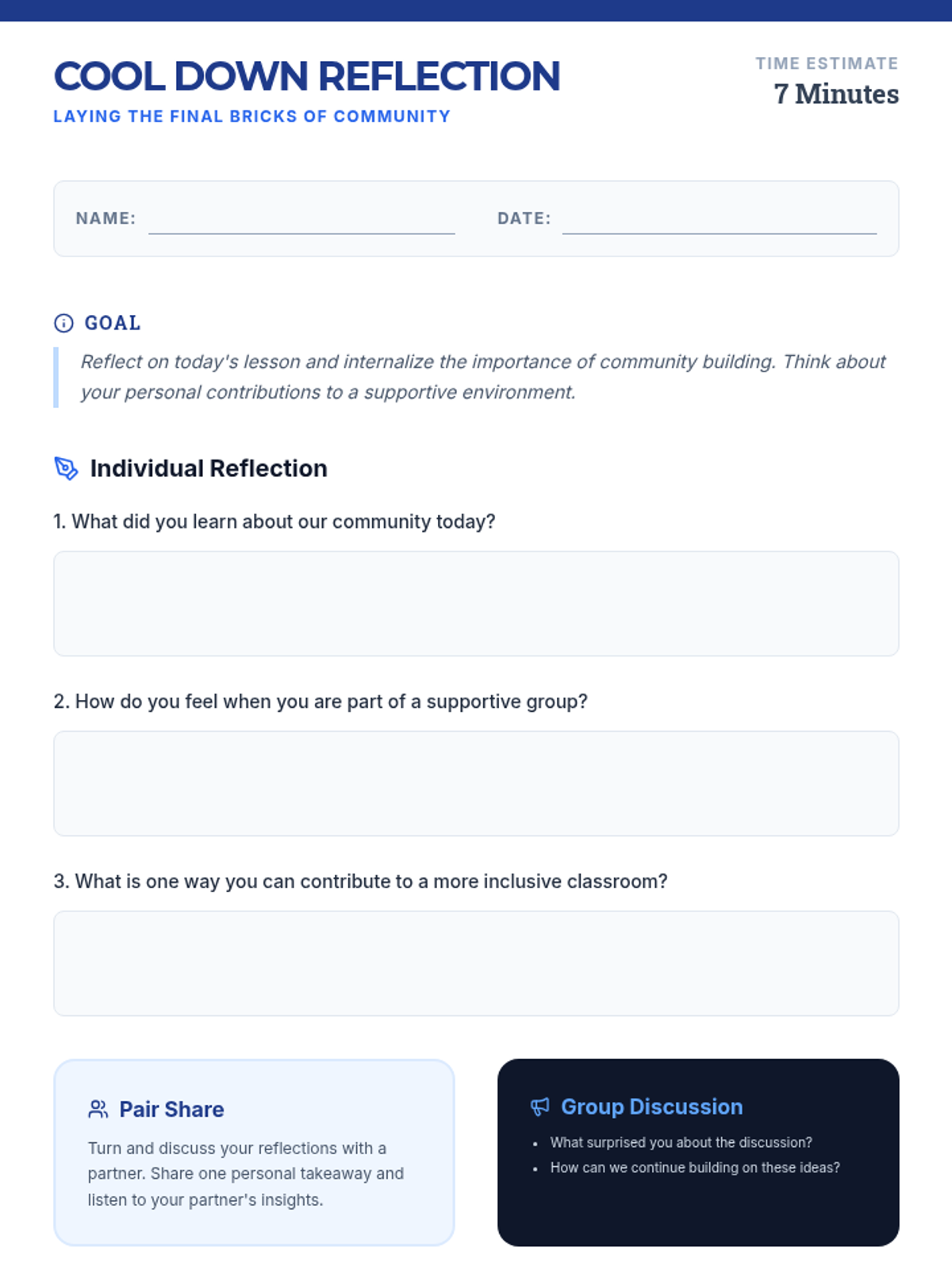 This lesson focuses on community building for 7th graders, aiming to develop stronger bonds among classmates and increase their sense of belonging through interactive activities, games, and guided discussions.