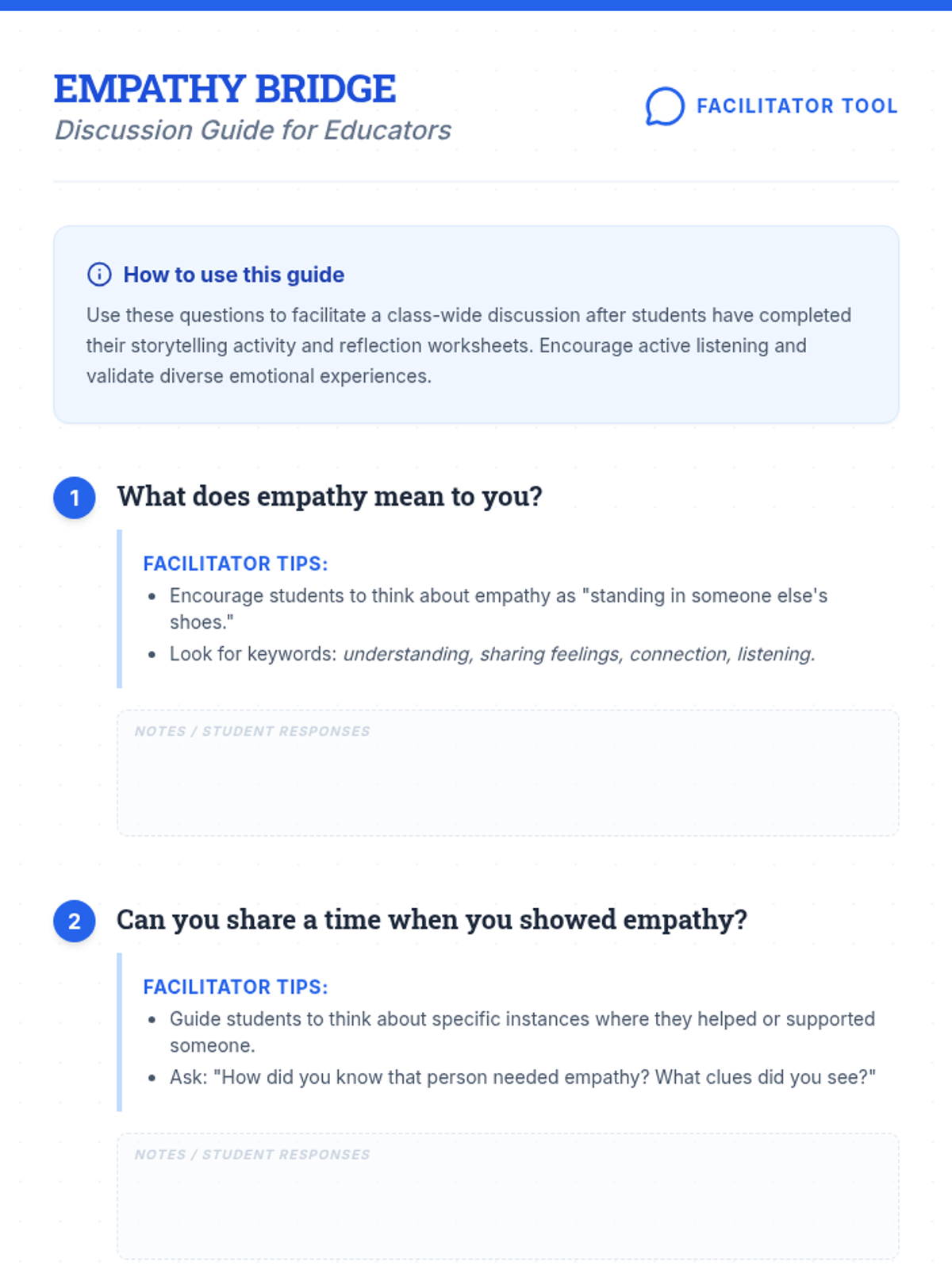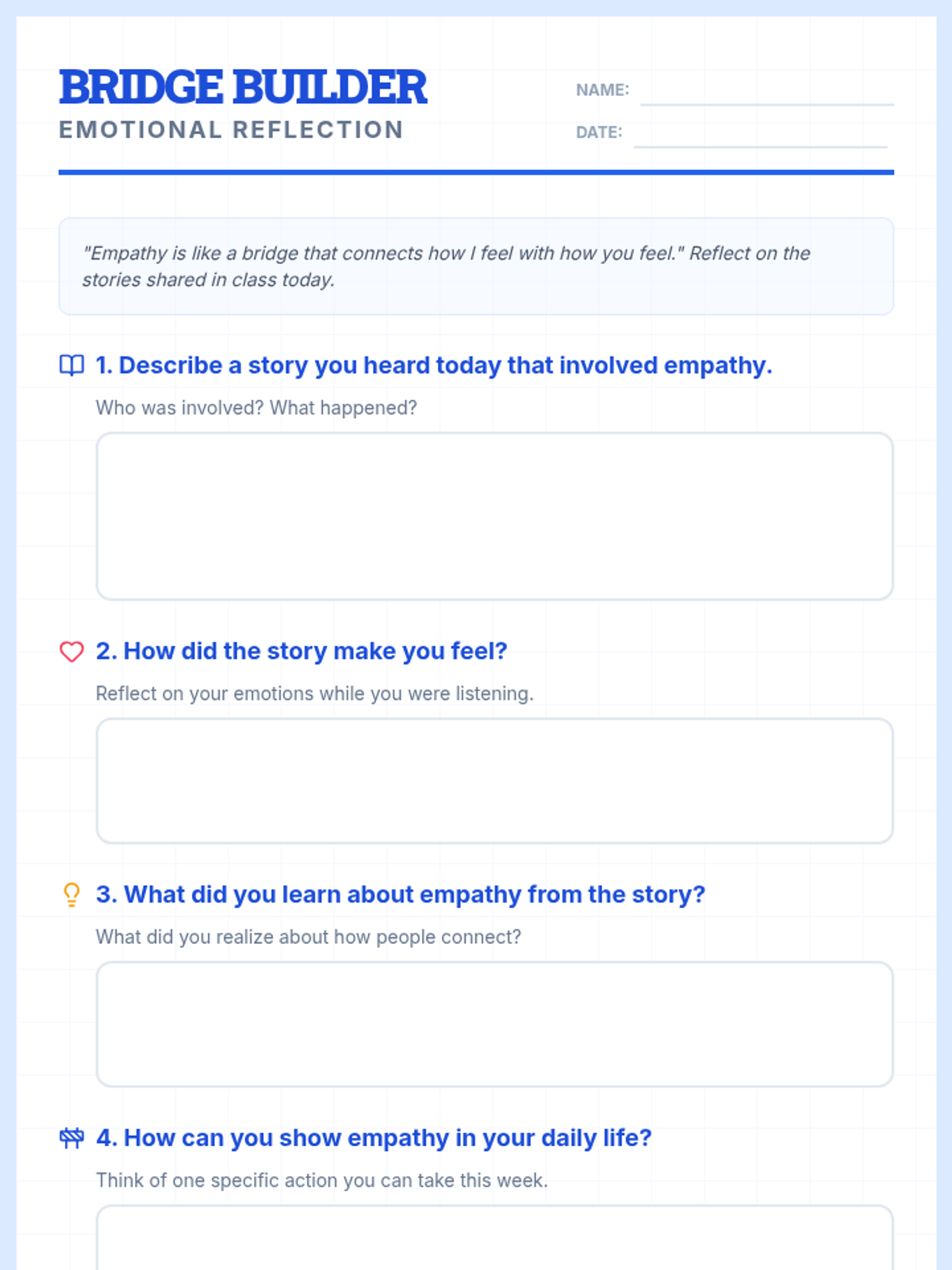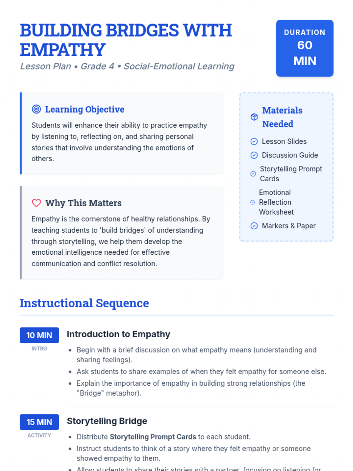 A comprehensive 4th-grade social-emotional learning lesson focused on developing empathy through storytelling, reflection, and peer discussion. Students learn to 'build bridges' of understanding with others.
