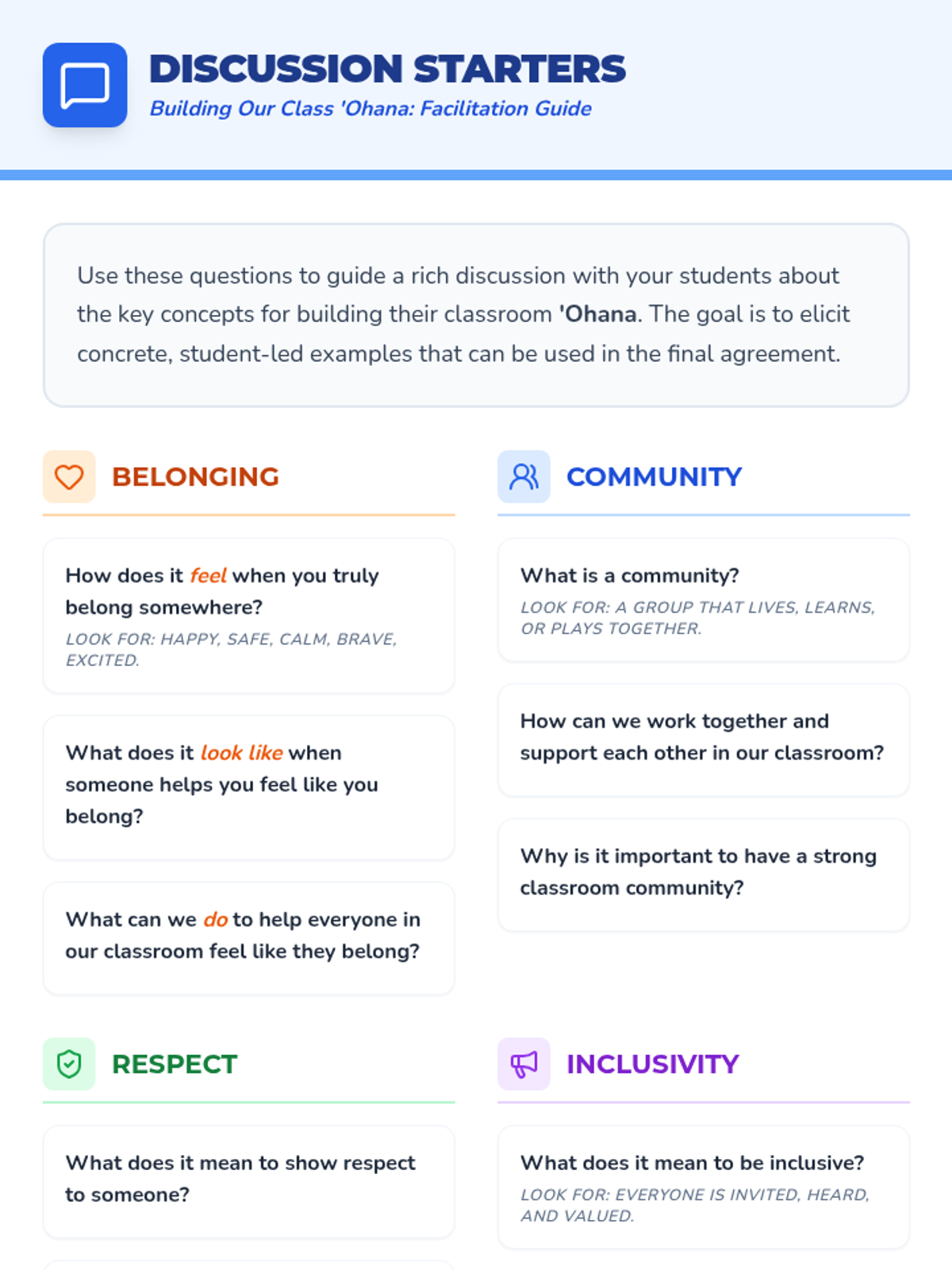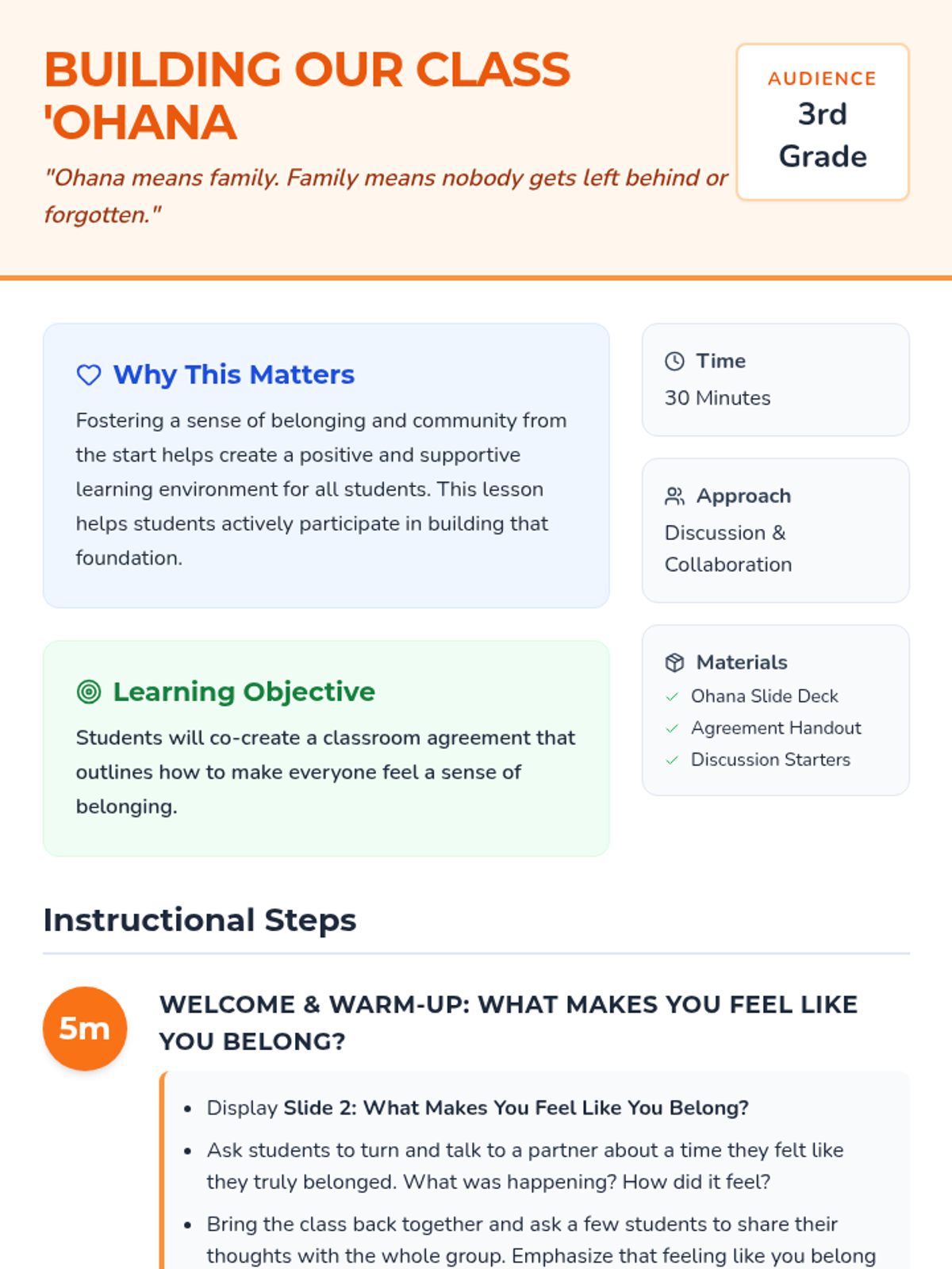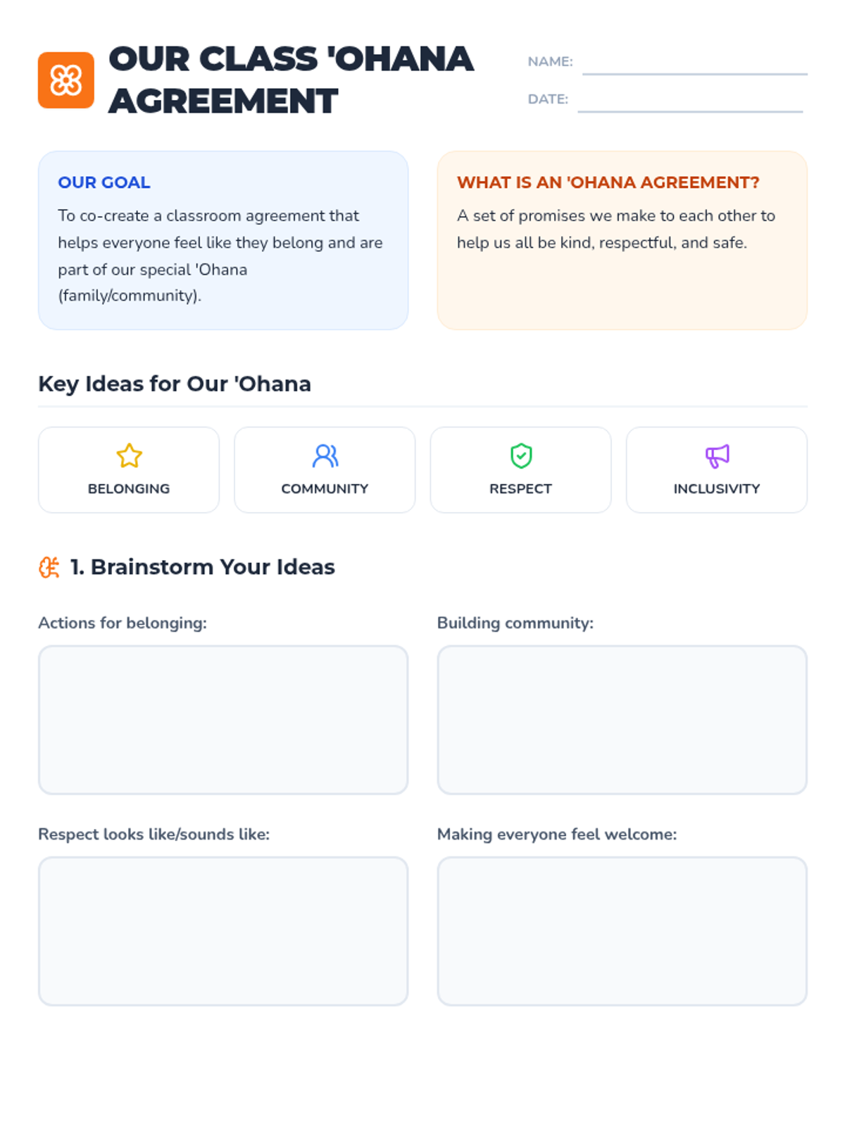 This lesson helps 3rd-grade students co-create a classroom agreement, fostering a sense of belonging and community through the Hawaiian concept of 'Ohana. Students will explore ideas of respect, inclusivity, and community to build a supportive learning environment.