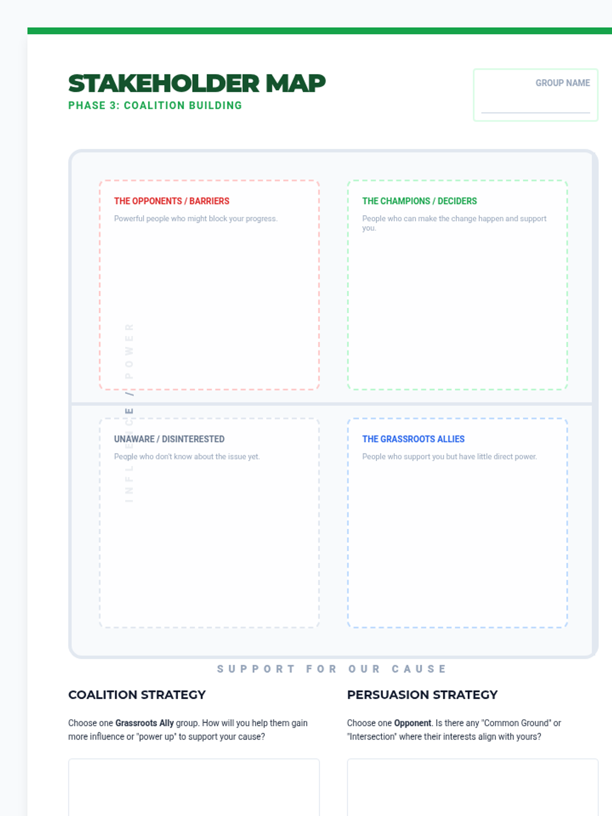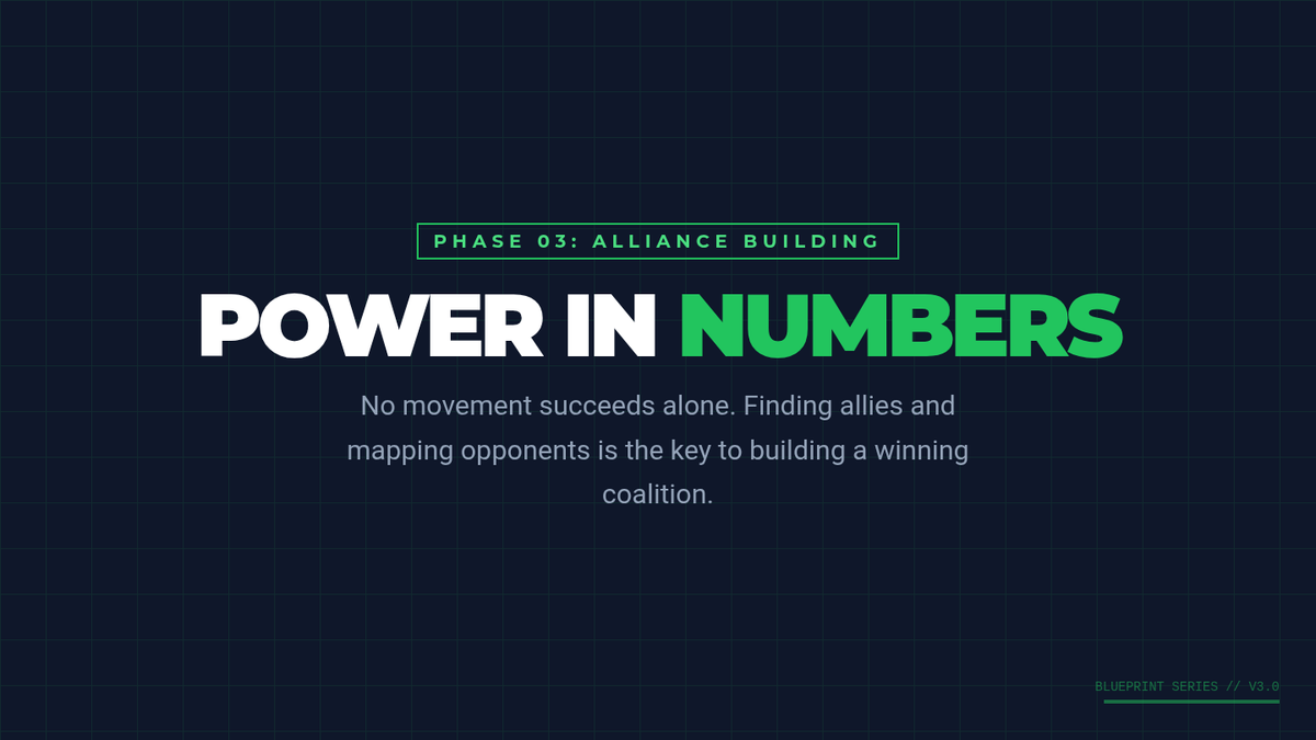 Groups identify potential allies and opponents through stakeholder mapping and develop plans to build a diverse, powerful coalition.
