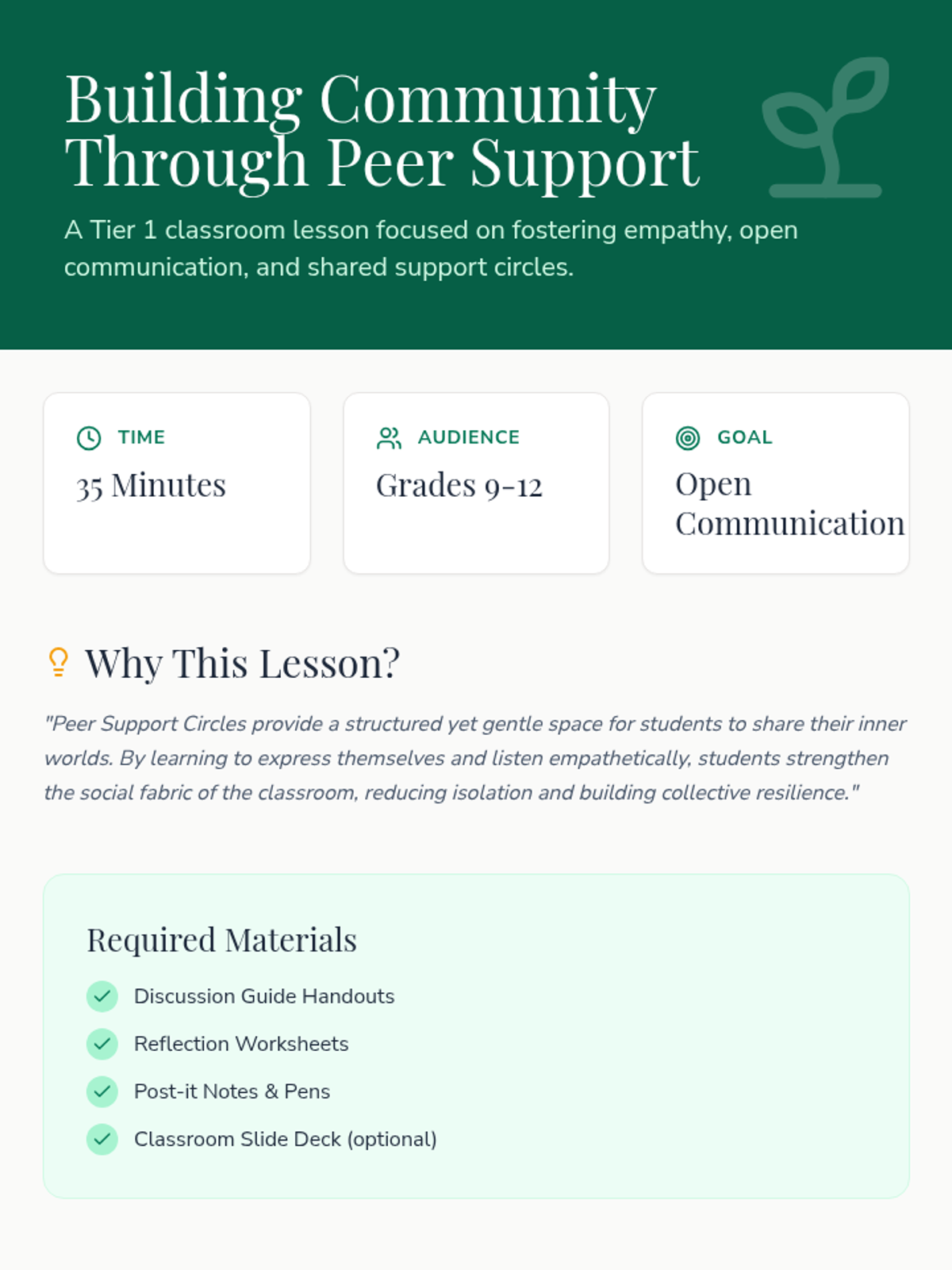 This lesson introduces high school students to Peer Support Circles, focusing on building empathy, communication, and a supportive classroom community through guided sharing.