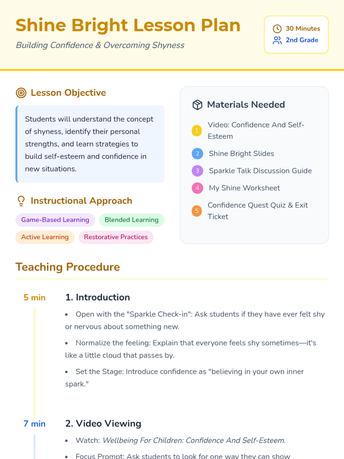 This lesson helps 2nd-grade students understand shyness and build self-esteem. Through a video, discussion, and personal reflection, students learn to identify their strengths and practice self-compassion.