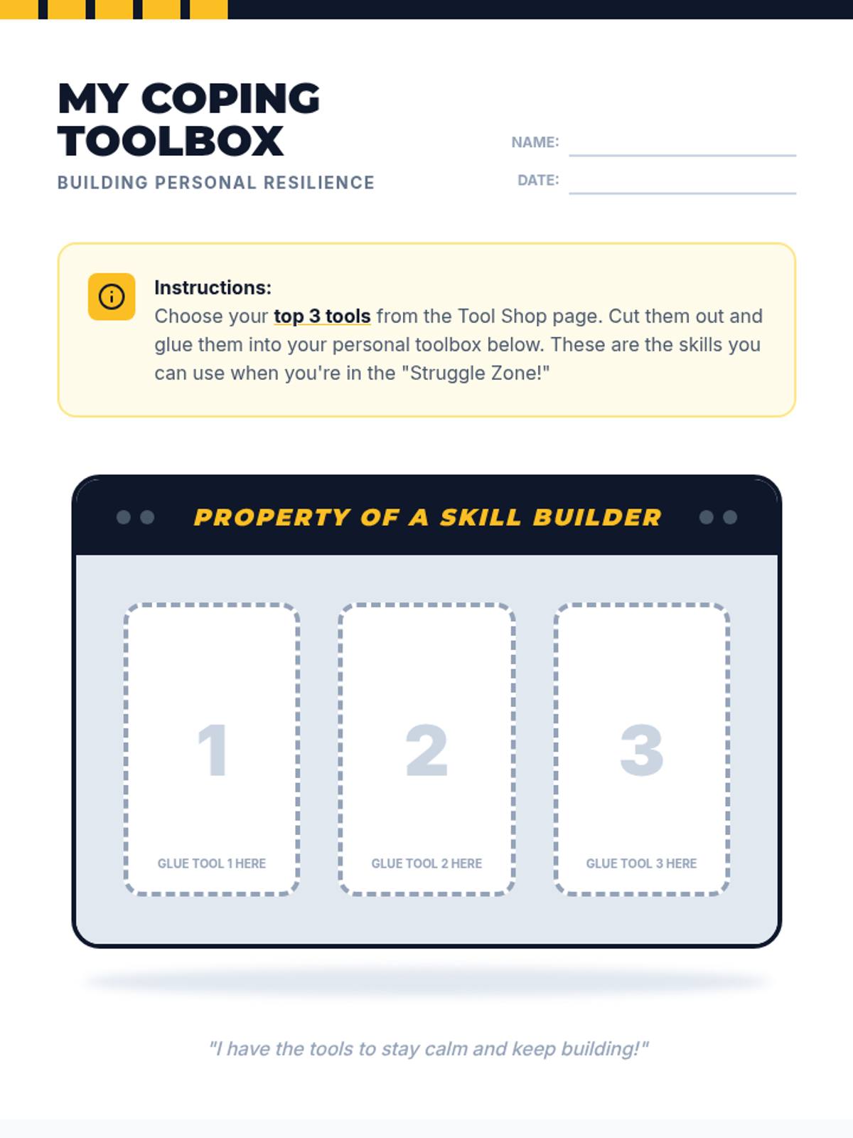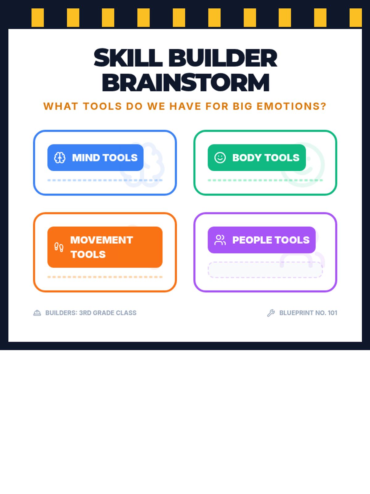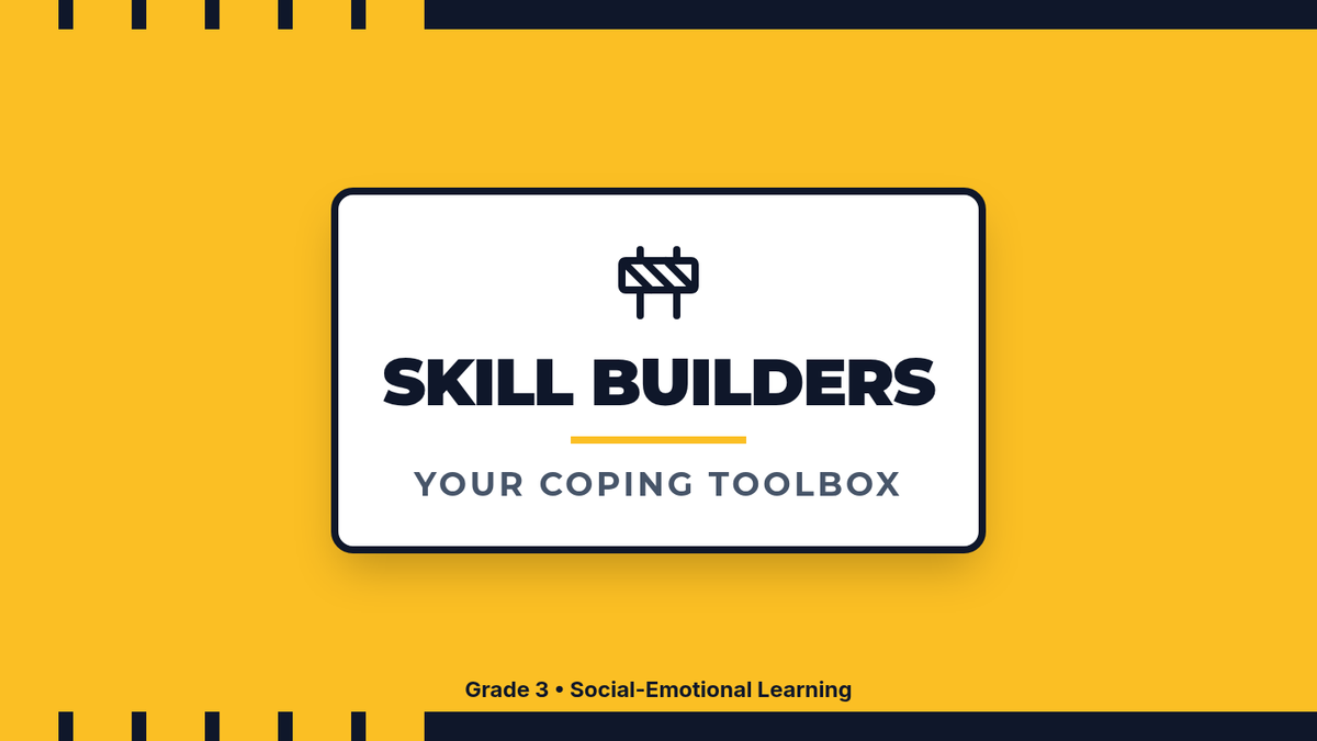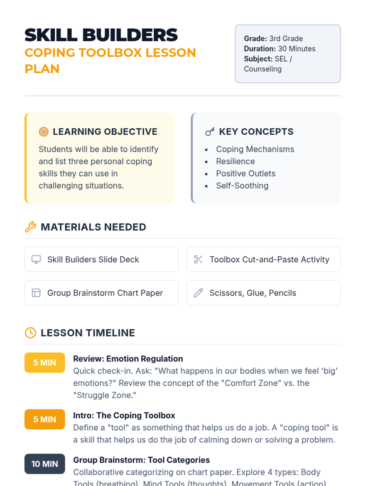 A 30-minute social-emotional learning lesson for 3rd graders focused on identifying and personalizing coping strategies through a construction-themed toolbox metaphor. Students move from understanding emotion regulation to building their own practical 'toolset' for challenging moments.