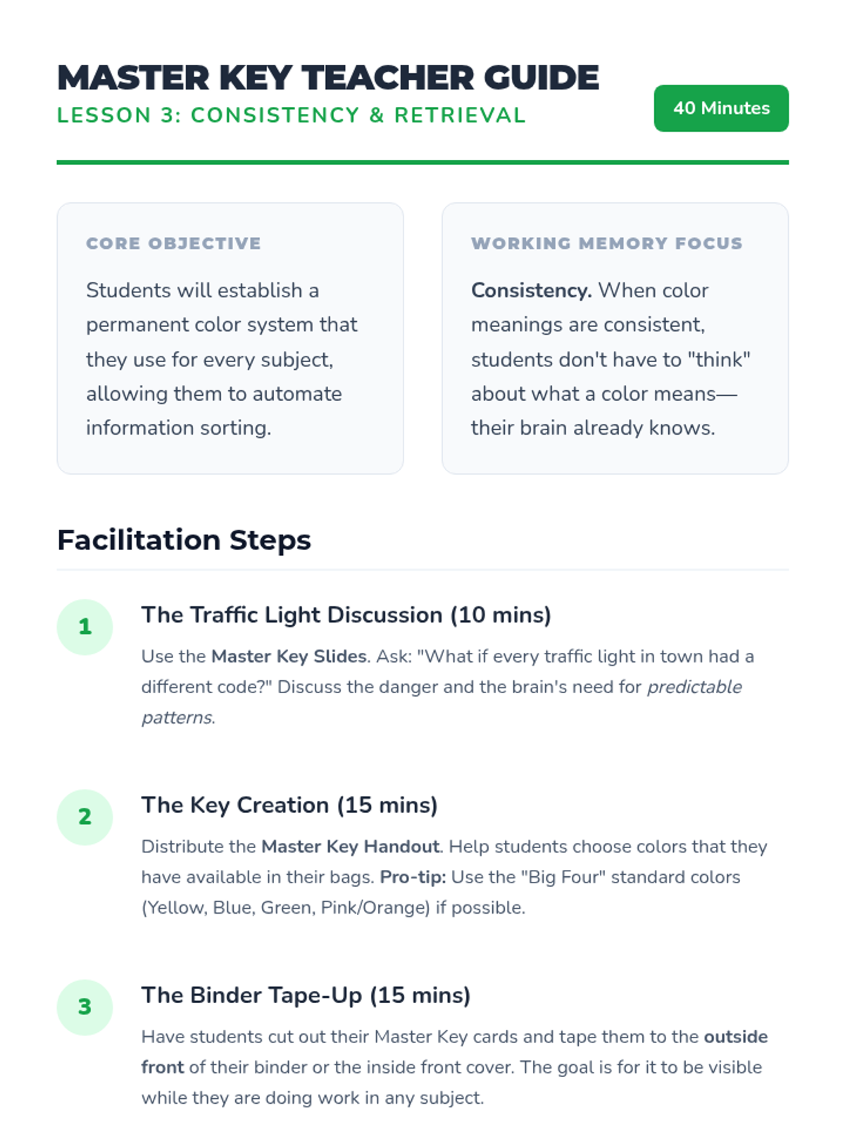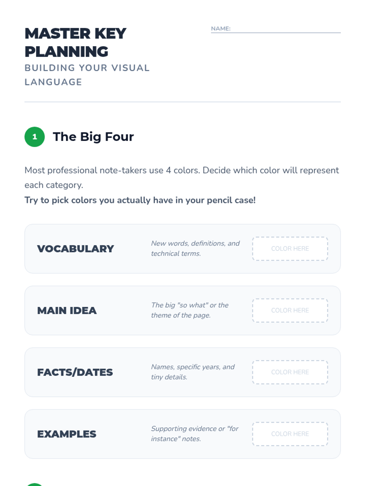 Students develop a consistent color key to use across all subjects, creating a portable reference card to automate the brain's recognition of different information types.