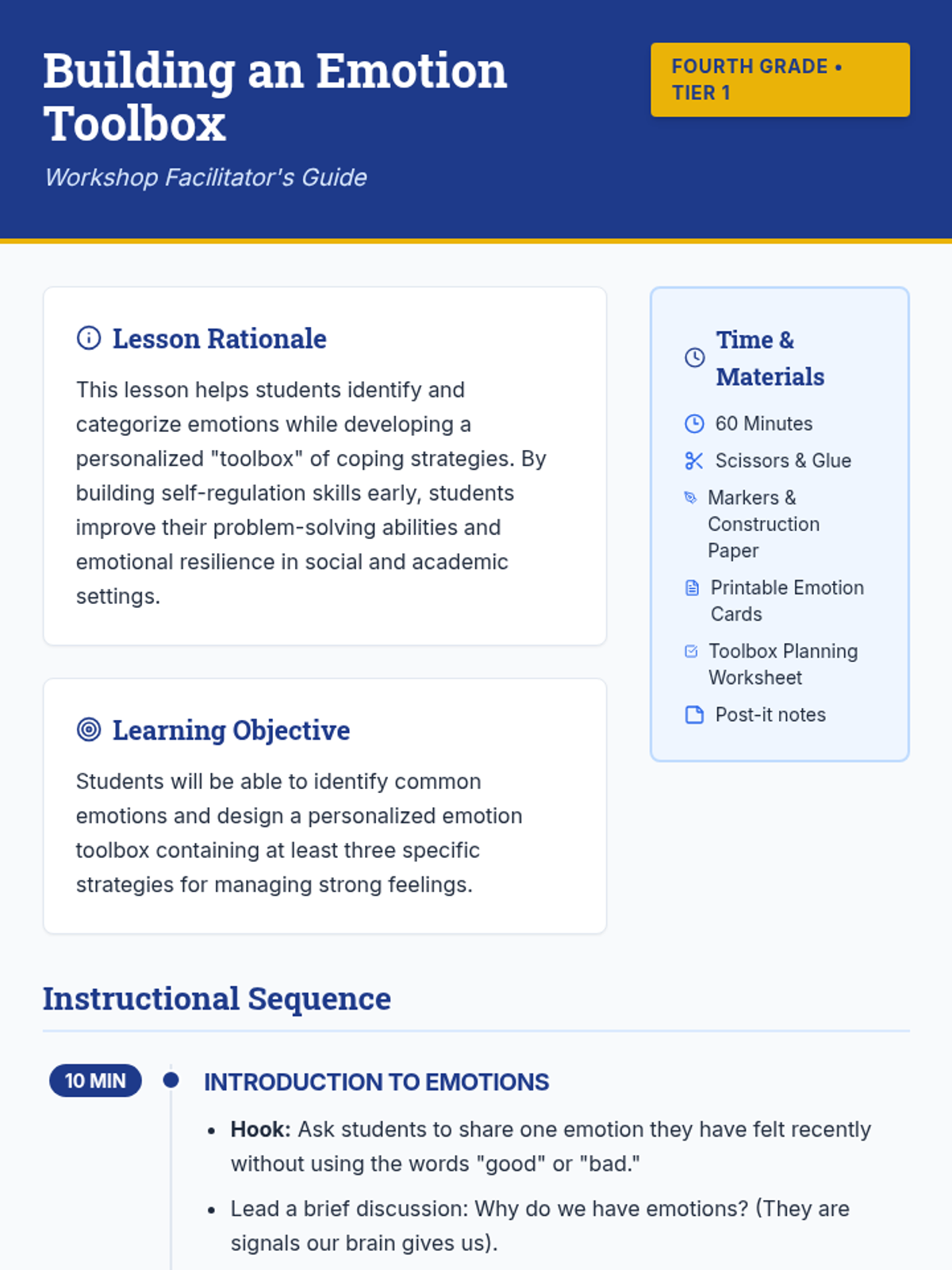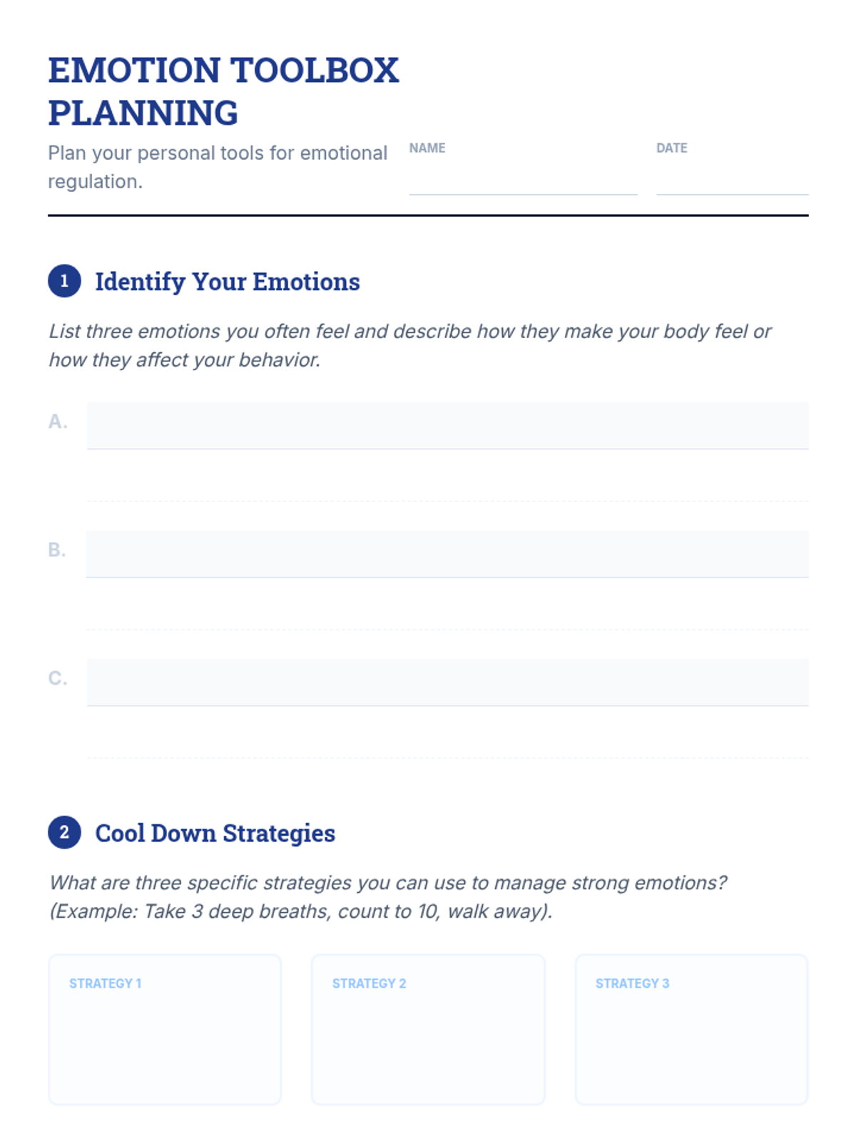 Students will learn about different emotions and how to manage them by creating a personalized emotion toolbox, promoting self-regulation and problem-solving skills.