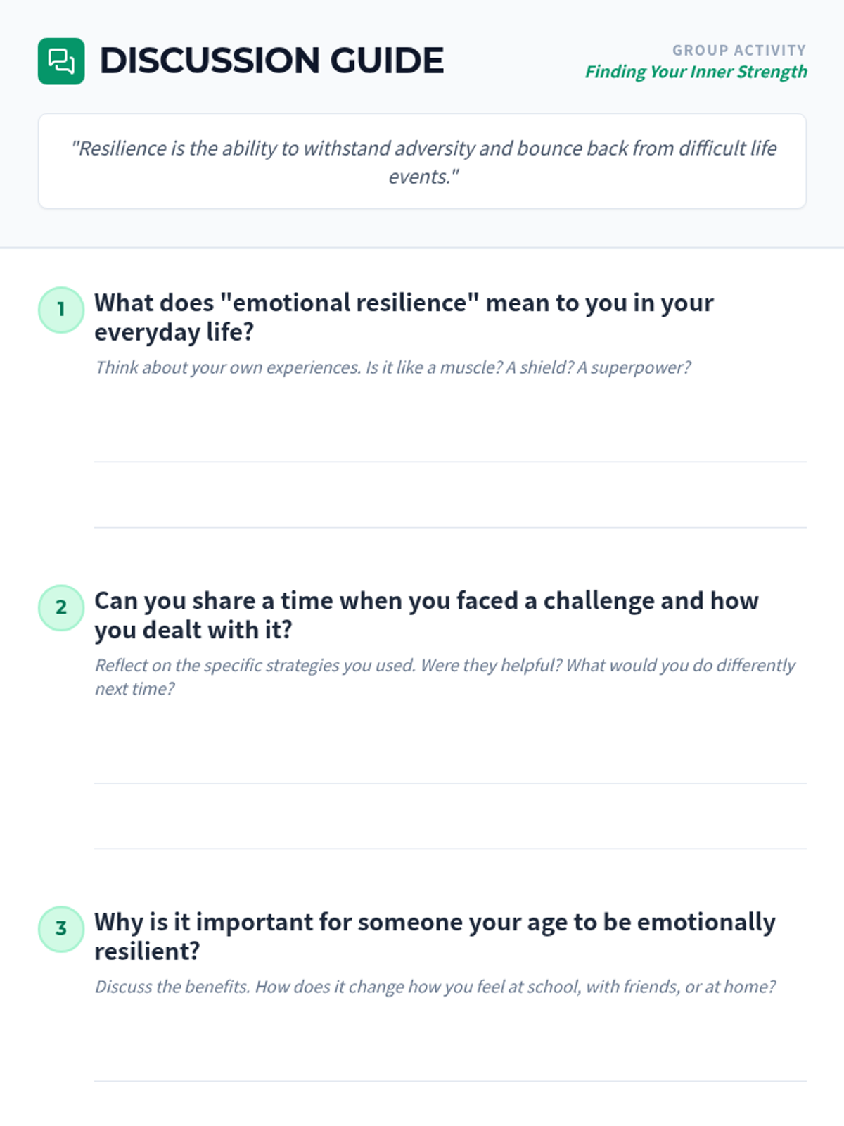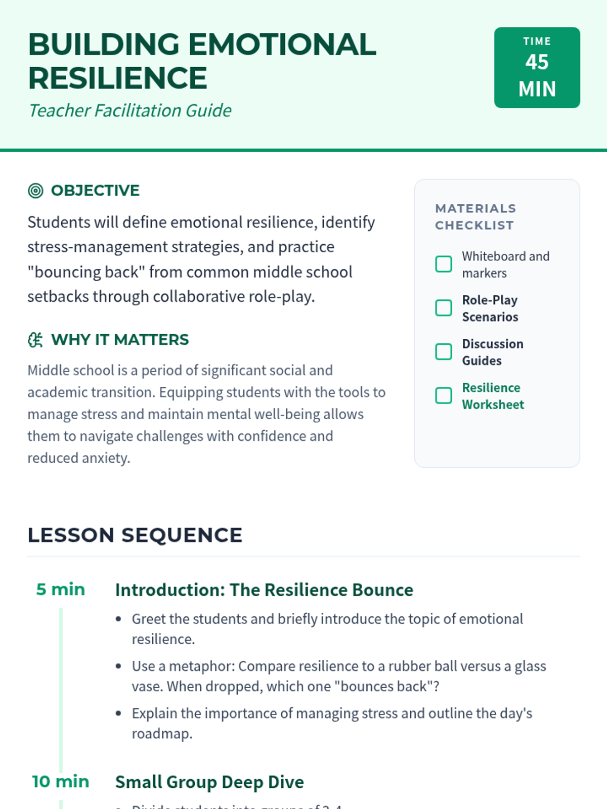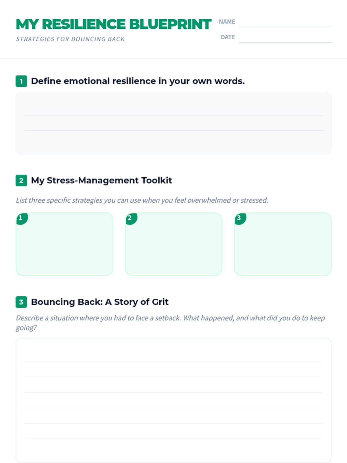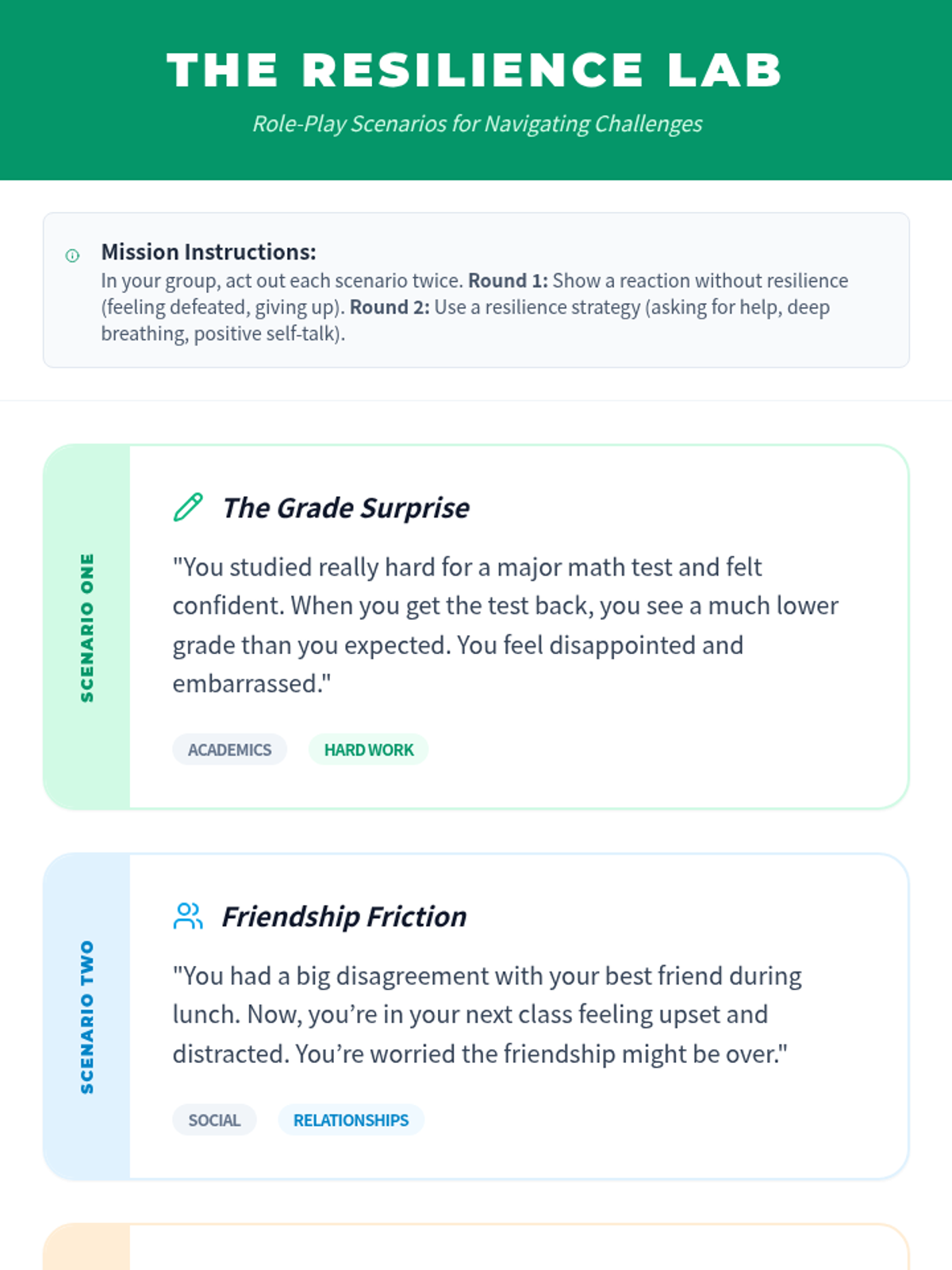 Students will learn about emotional resilience and practice strategies to manage stress and bounce back from setbacks through group discussions and role-playing activities.