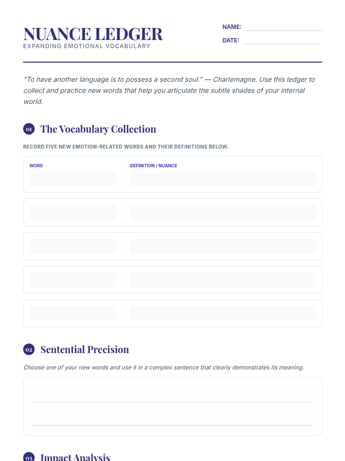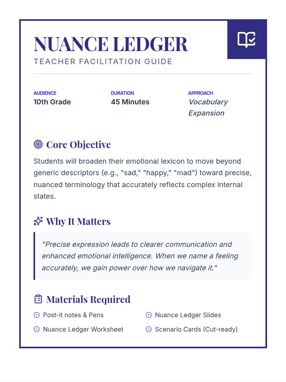 This lesson helps 10th-grade students expand their emotional vocabulary to better articulate their feelings. Through interactive activities, students will learn new emotion-related words and practice using them in various contexts to enhance communication and emotional intelligence.