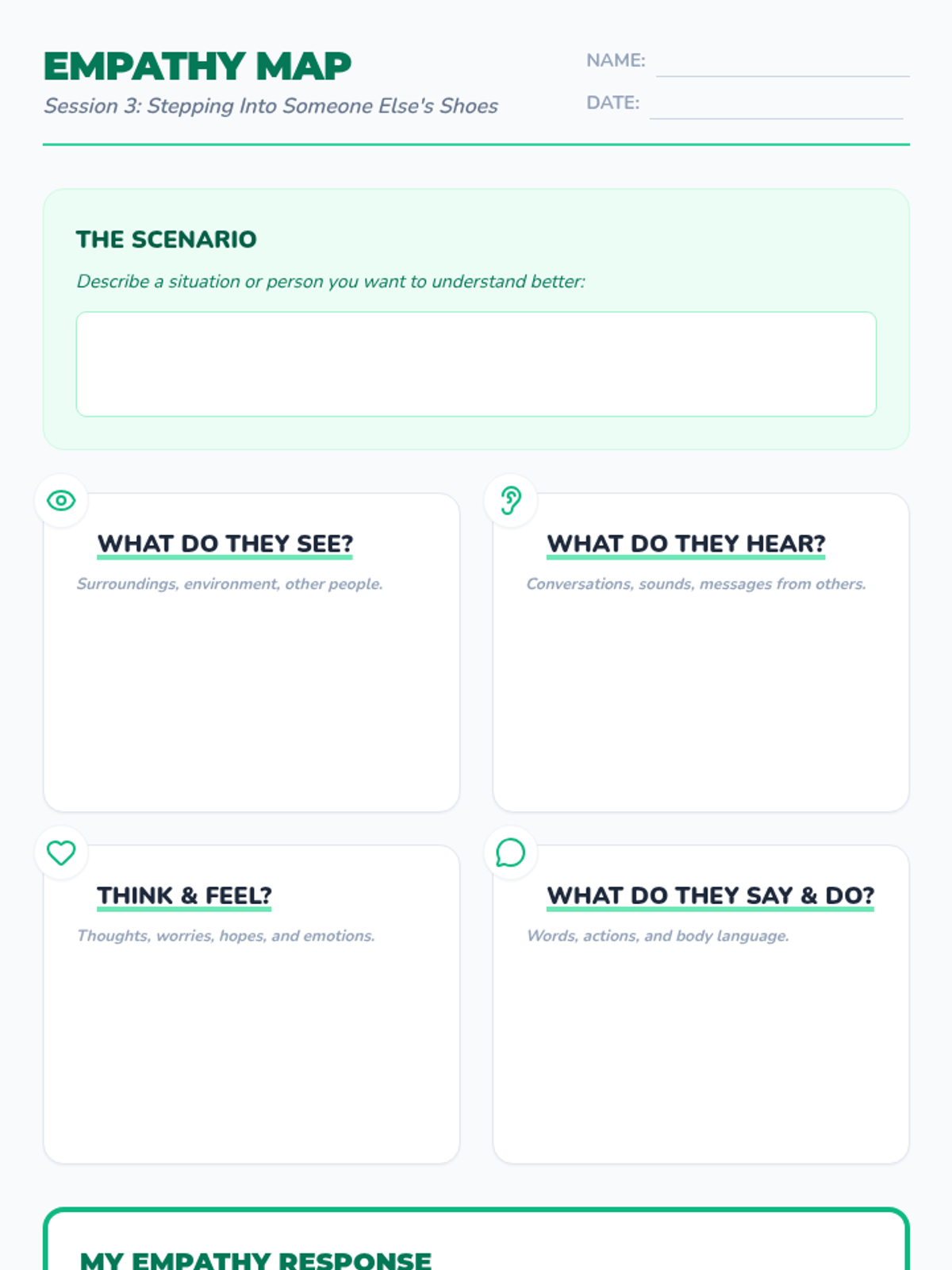 Define empathy and practice understanding others' perspectives through empathy mapping and roleplay.