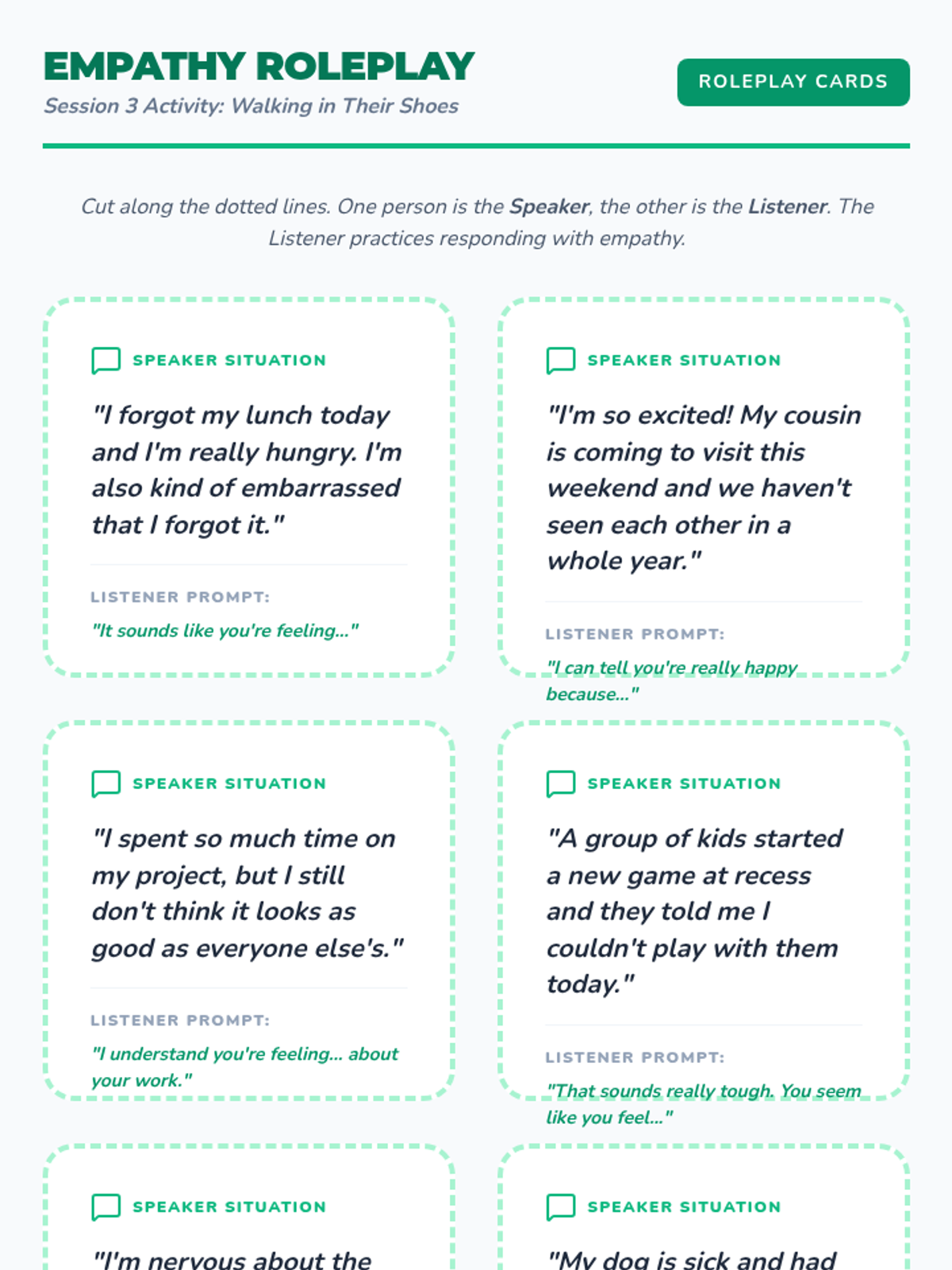 Focuses on empathy as the ability to see from another's perspective and understand their emotional state. Students practice the 'Emotional X-Ray' to look beneath surface behaviors to the feelings and needs underneath.