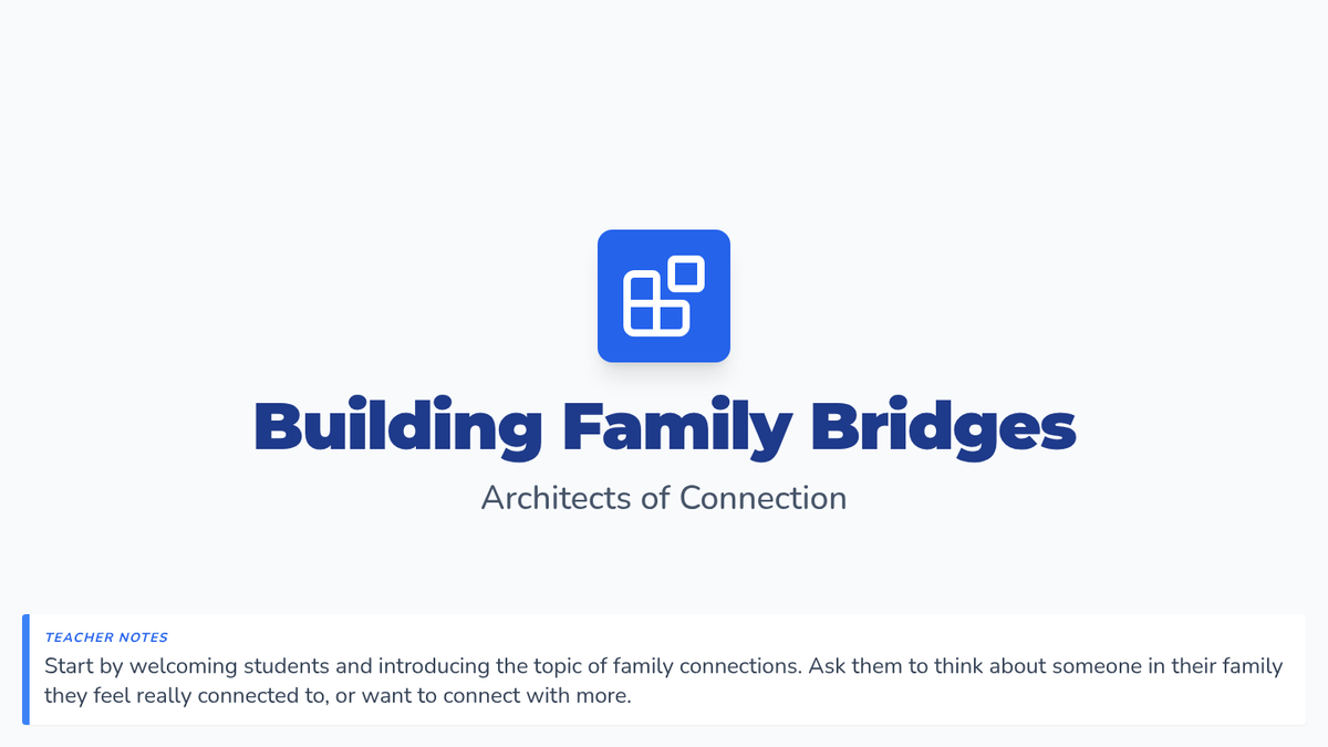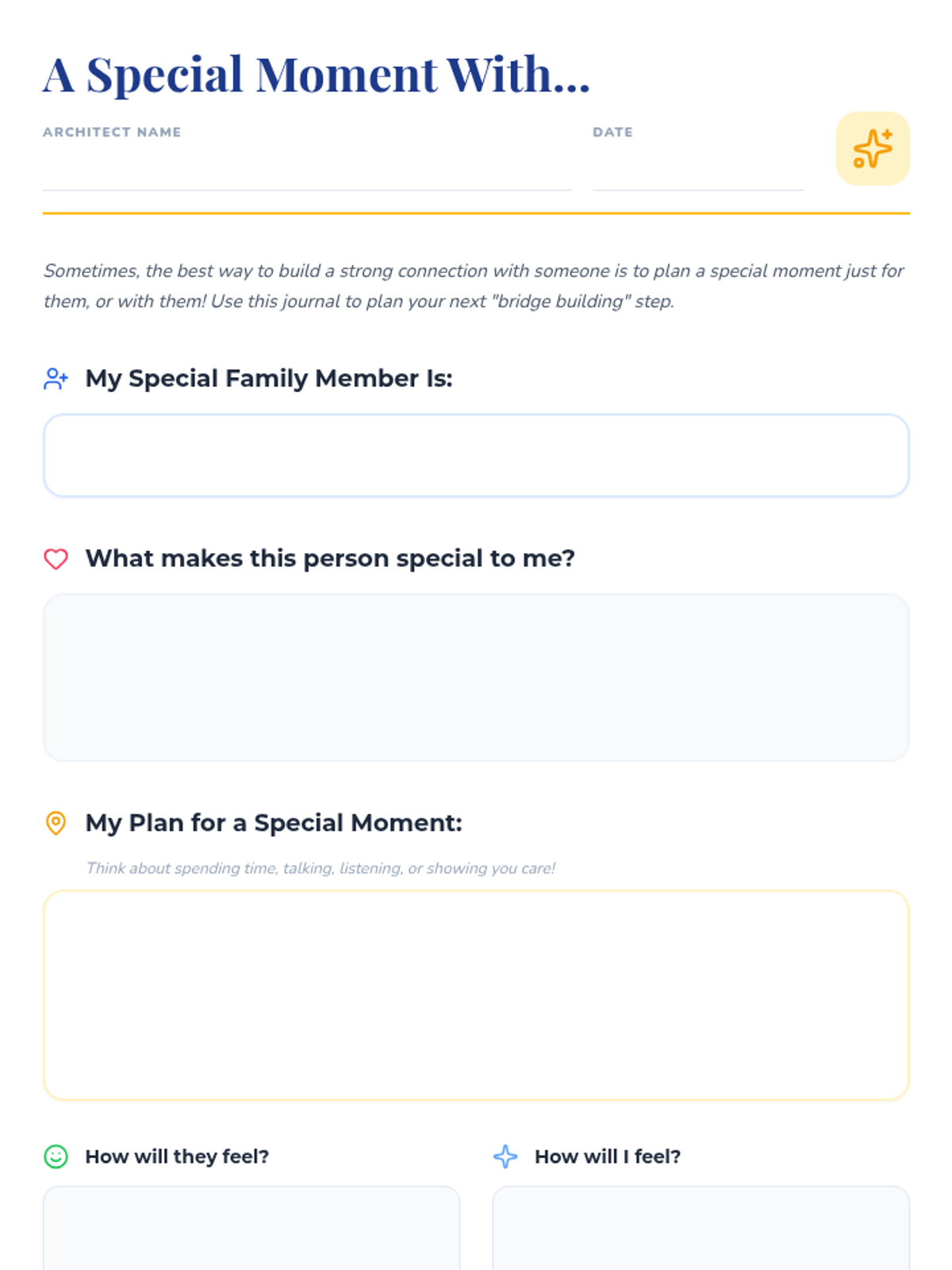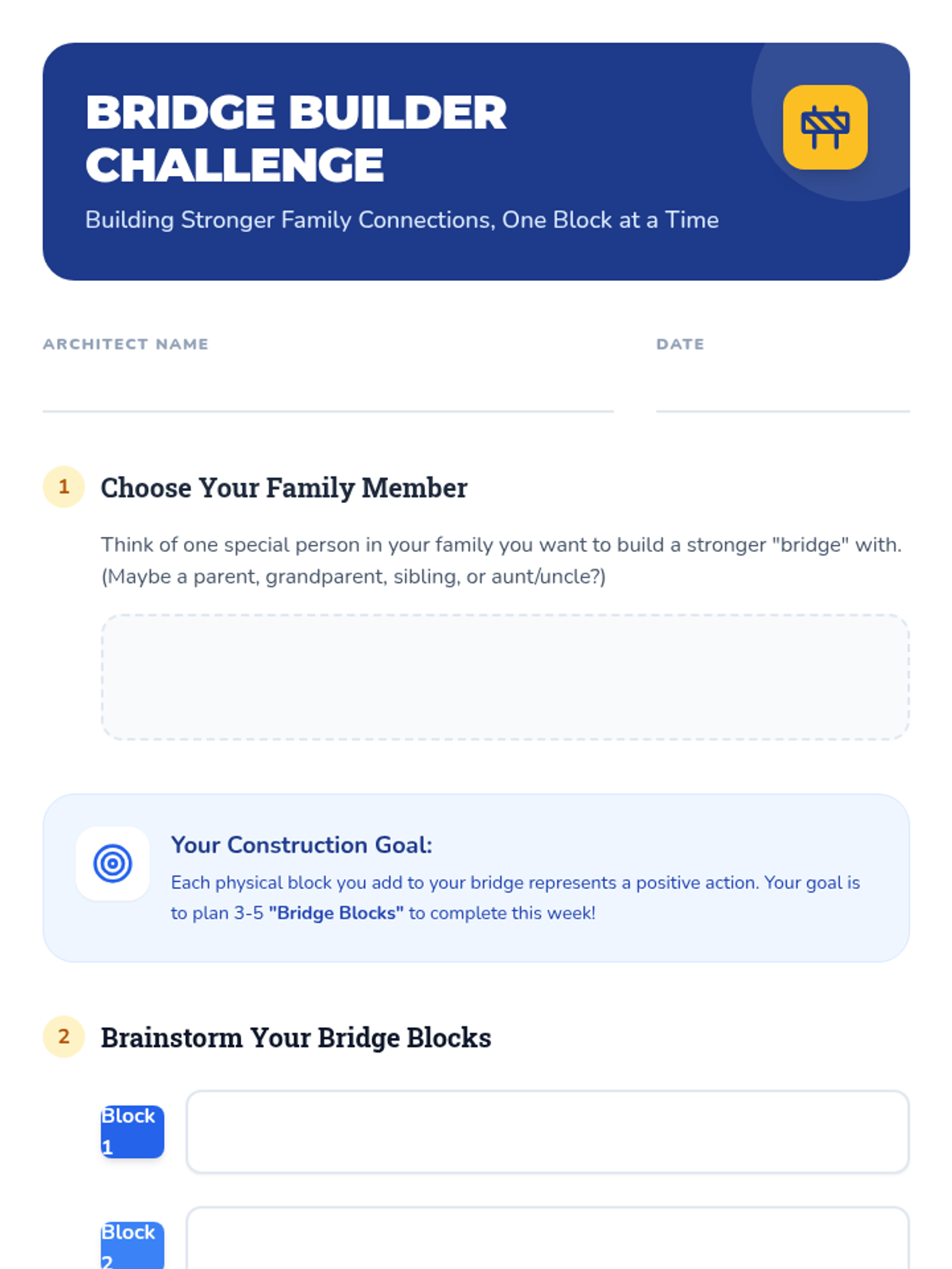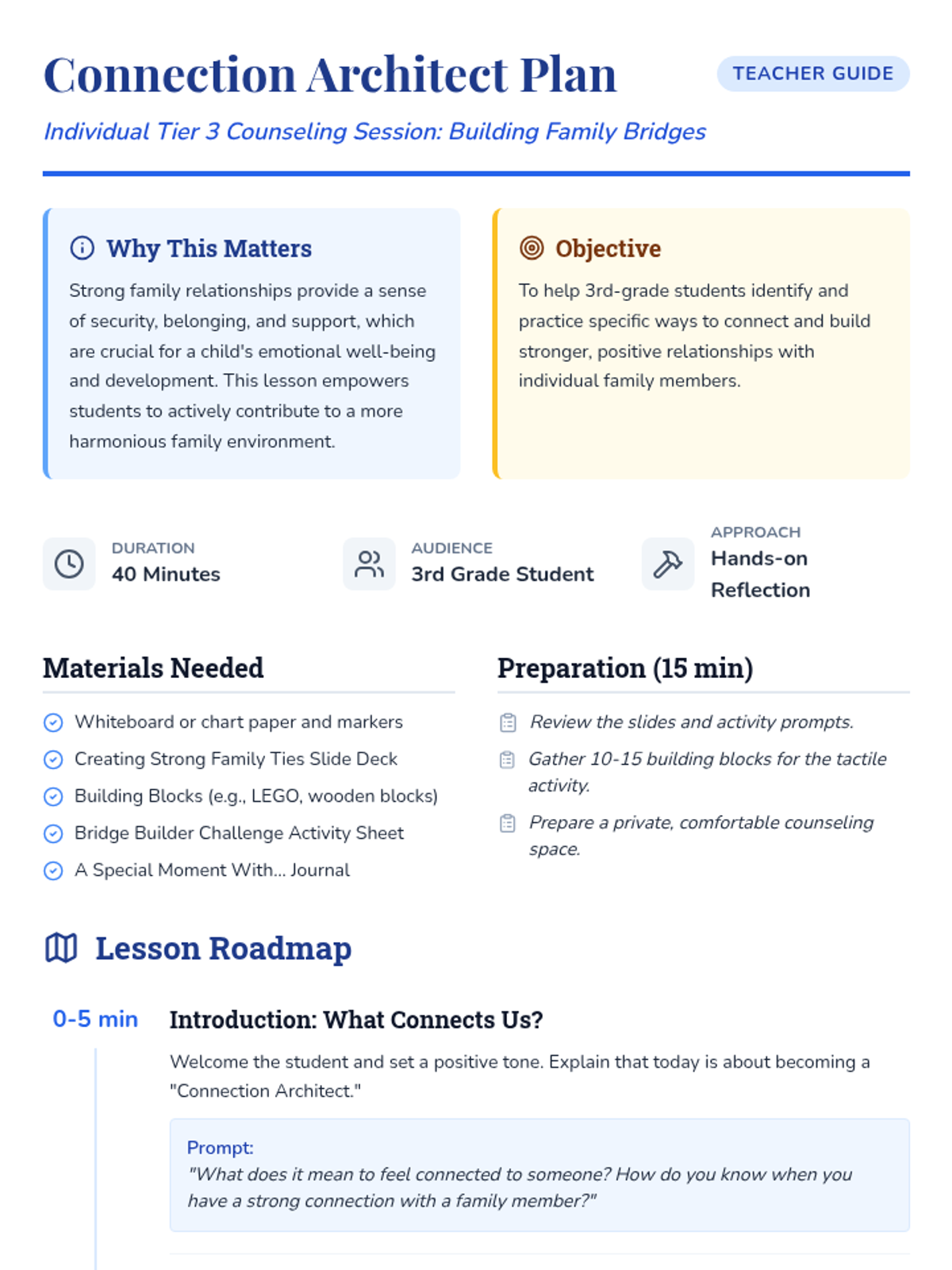 A Tier 3 individual counseling lesson for 3rd grade students focused on identifying and practicing specific ways to build stronger, positive relationships with individual family members through the 'bridge building' metaphor.