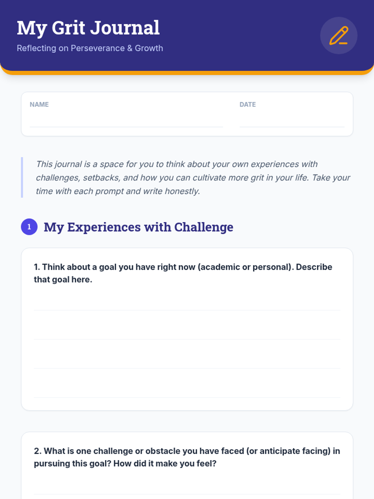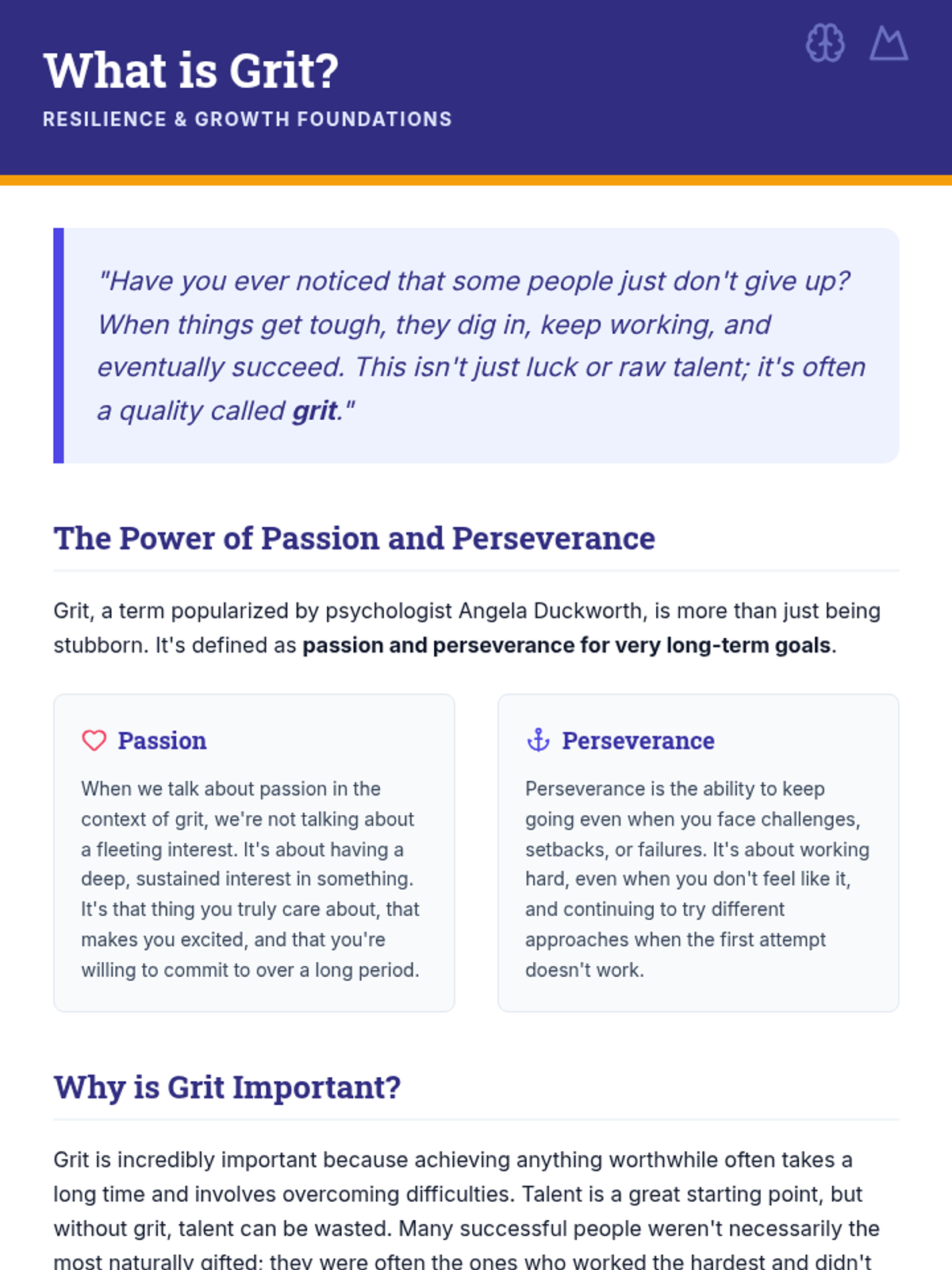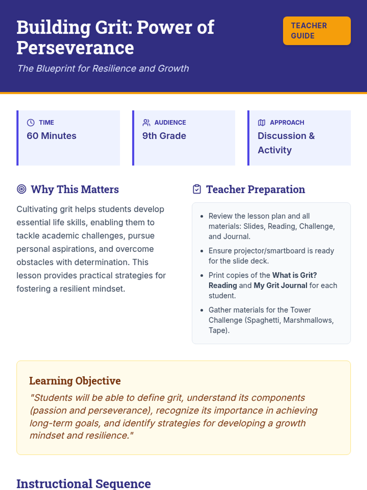 This lesson explores the concept of grit—the combination of passion and perseverance—and its importance in achieving long-term goals. Through inspiring stories, reflective exercises, and challenge-based activities, 9th-grade students will learn to embrace challenges and develop a growth mindset.