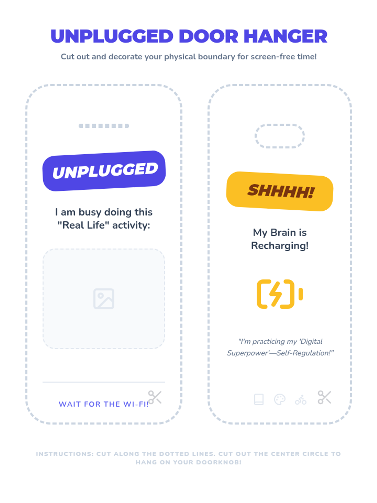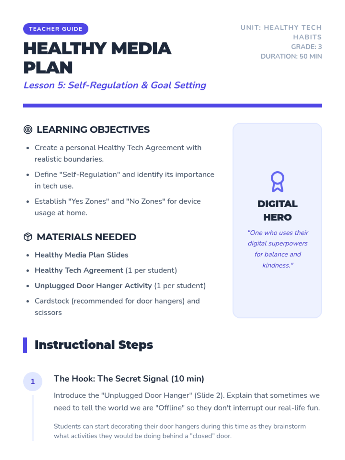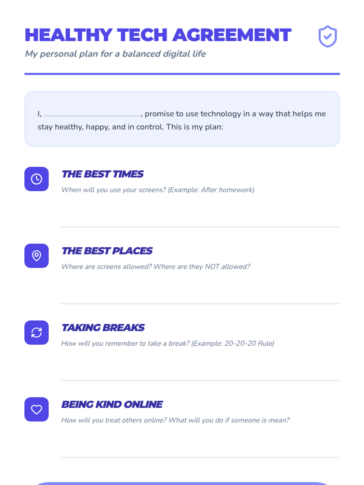 Students draft a personal agreement regarding when and where they will use devices (e.g., no screens at dinner). They discuss these boundaries as a way to stay in control of their technology.