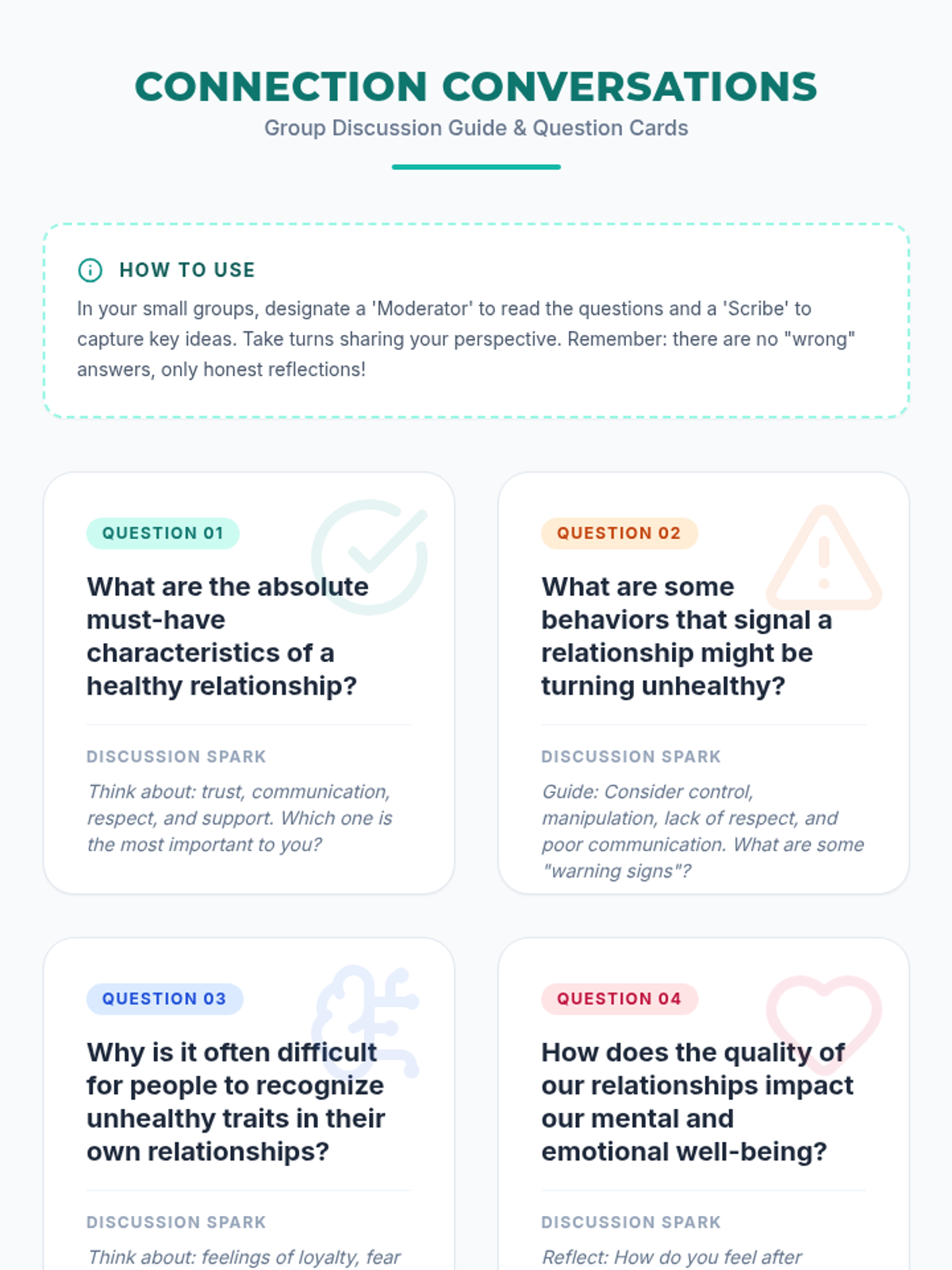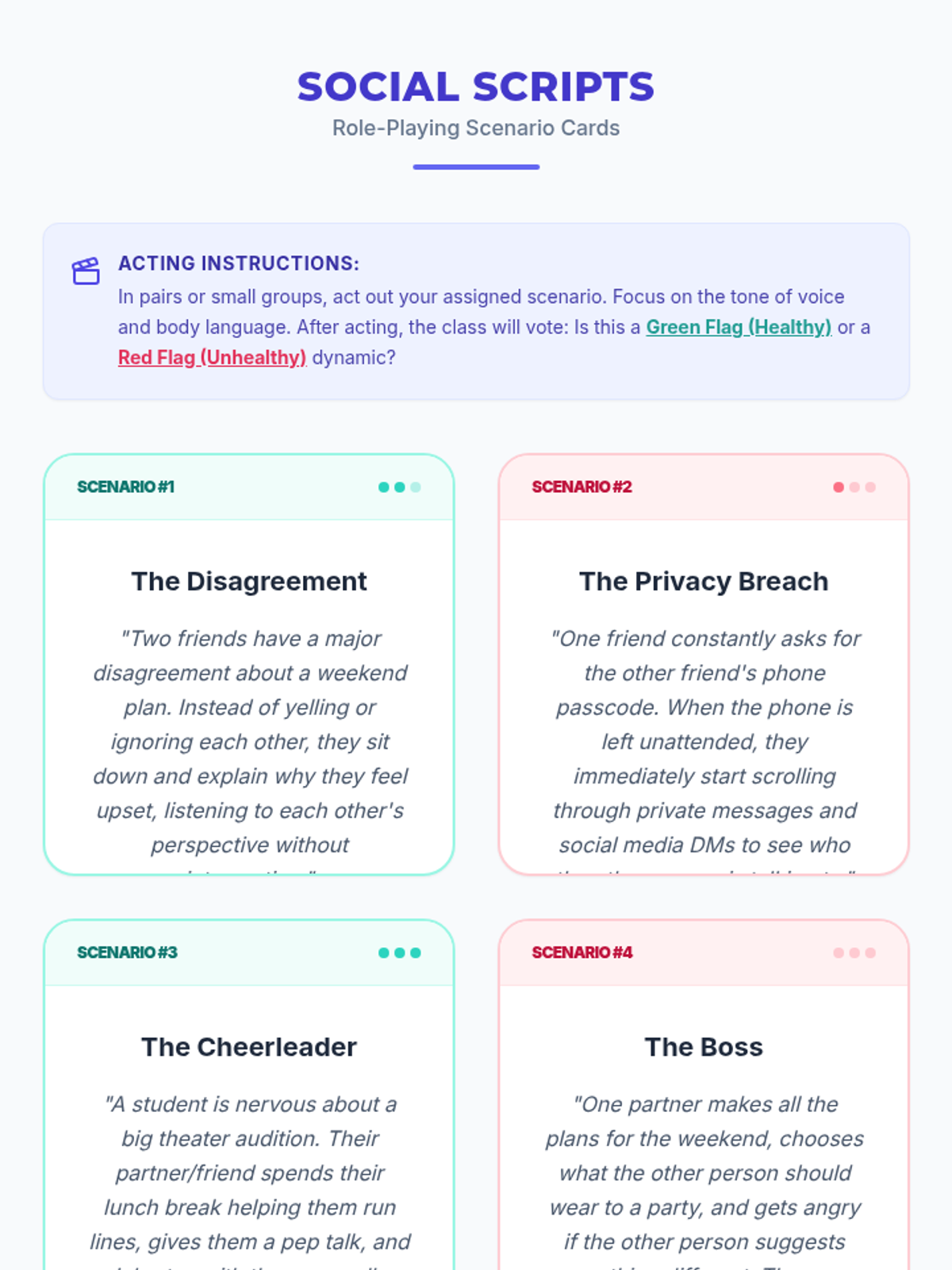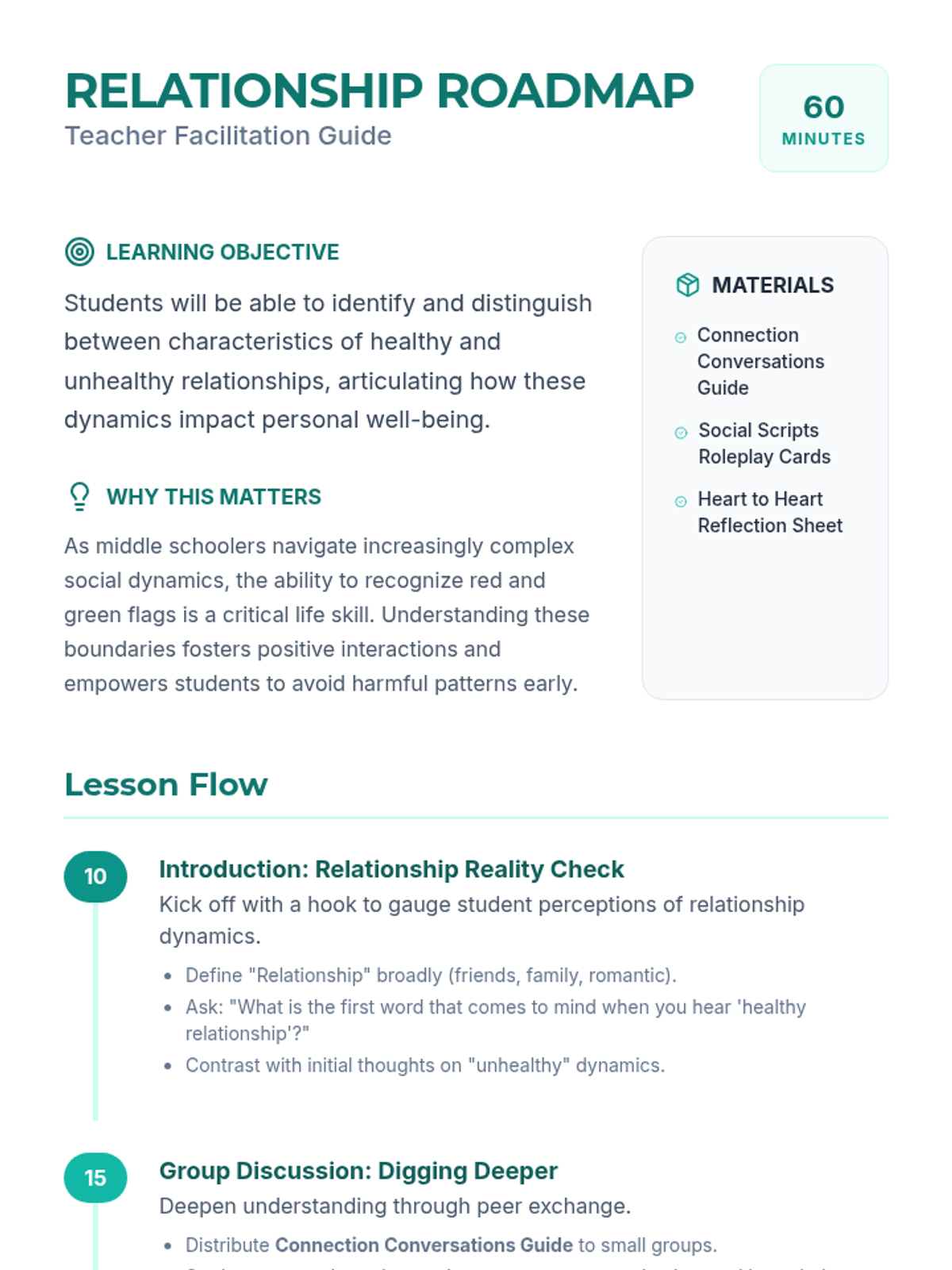 A comprehensive lesson for 8th-grade students to distinguish between healthy and unhealthy relationship dynamics through discussion, role-play, and personal reflection.