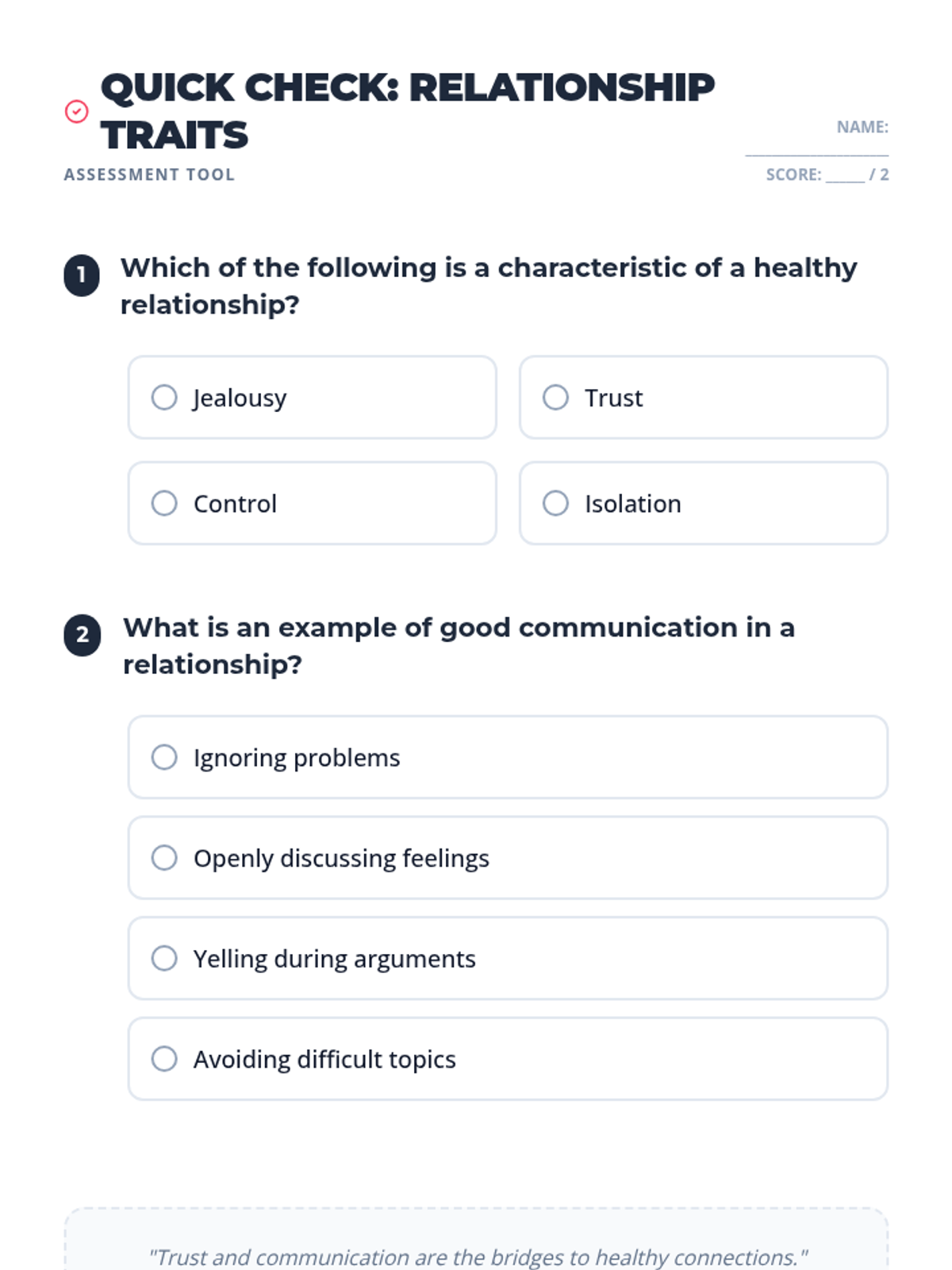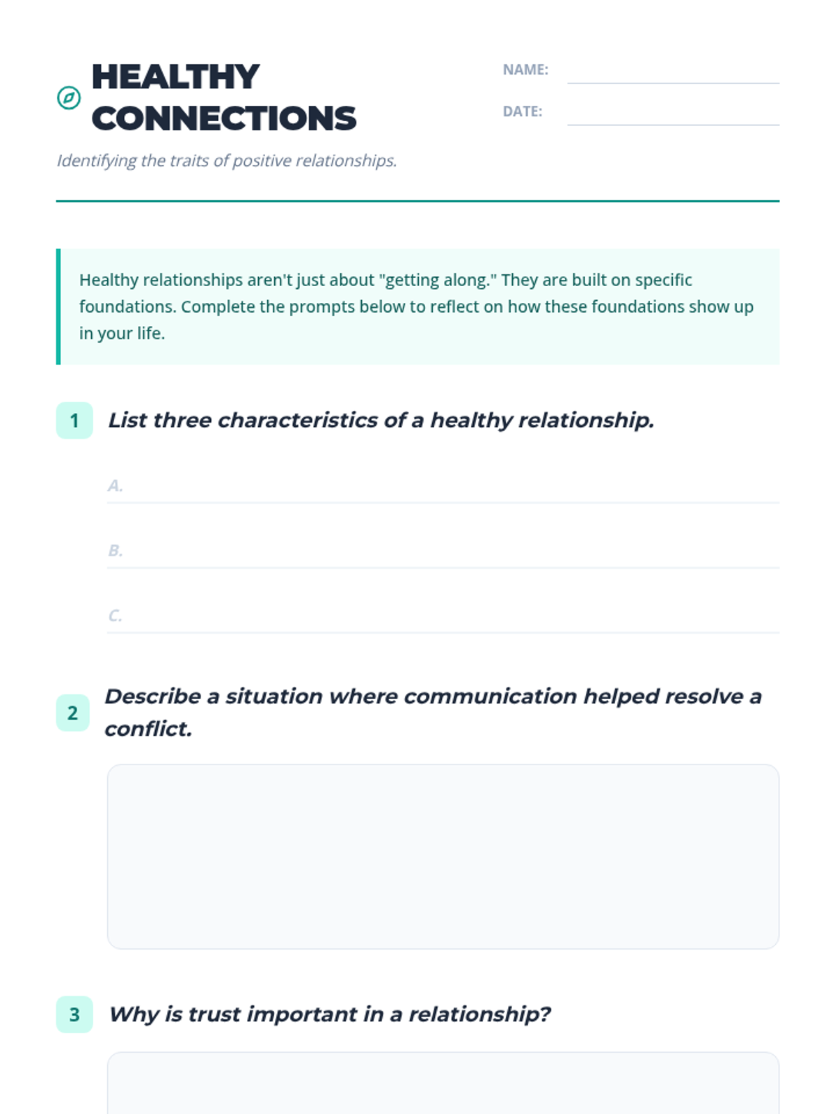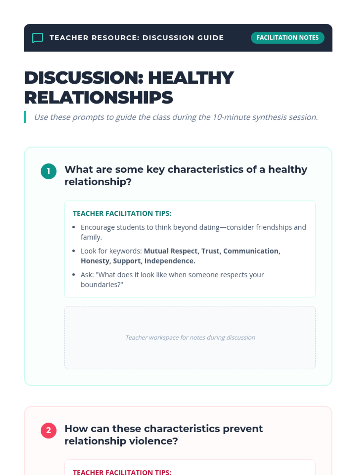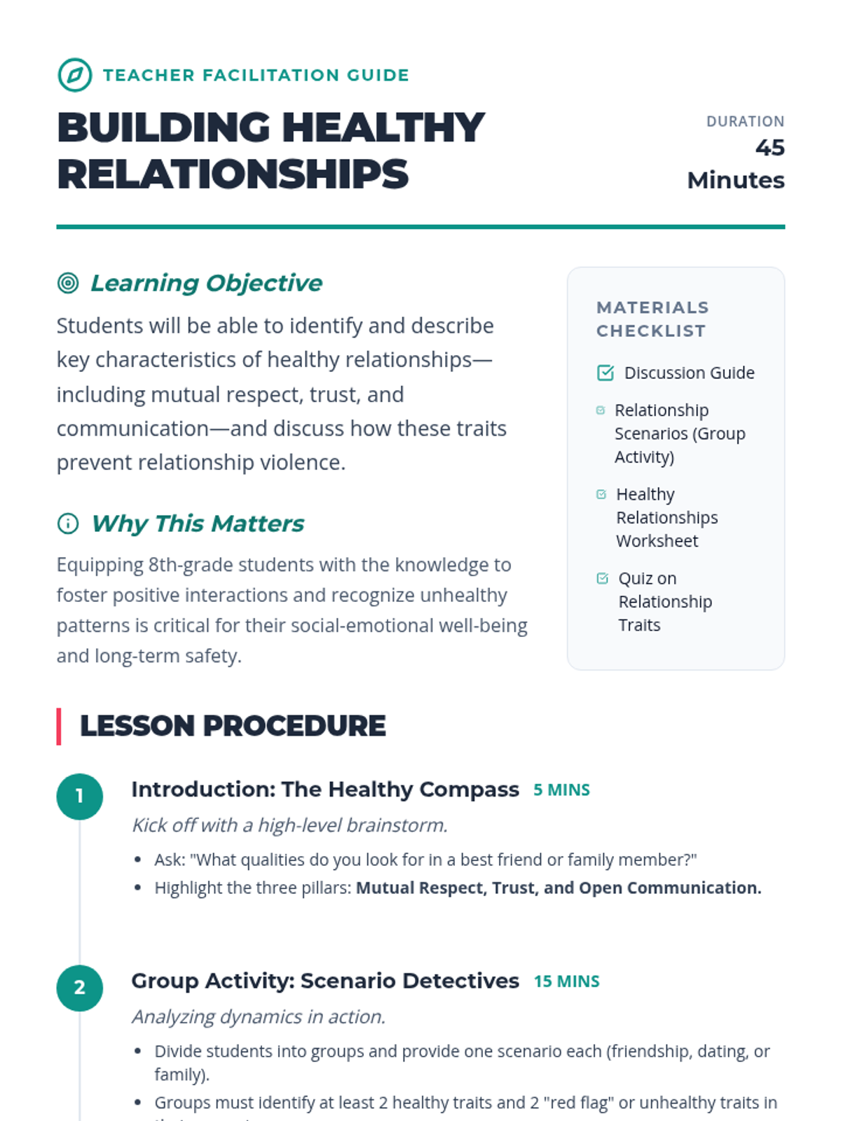 An 8th-grade lesson on identifying healthy relationship traits like trust, respect, and communication to promote well-being and prevent violence.