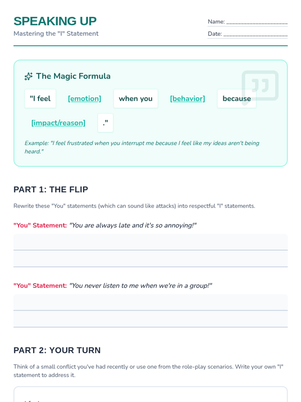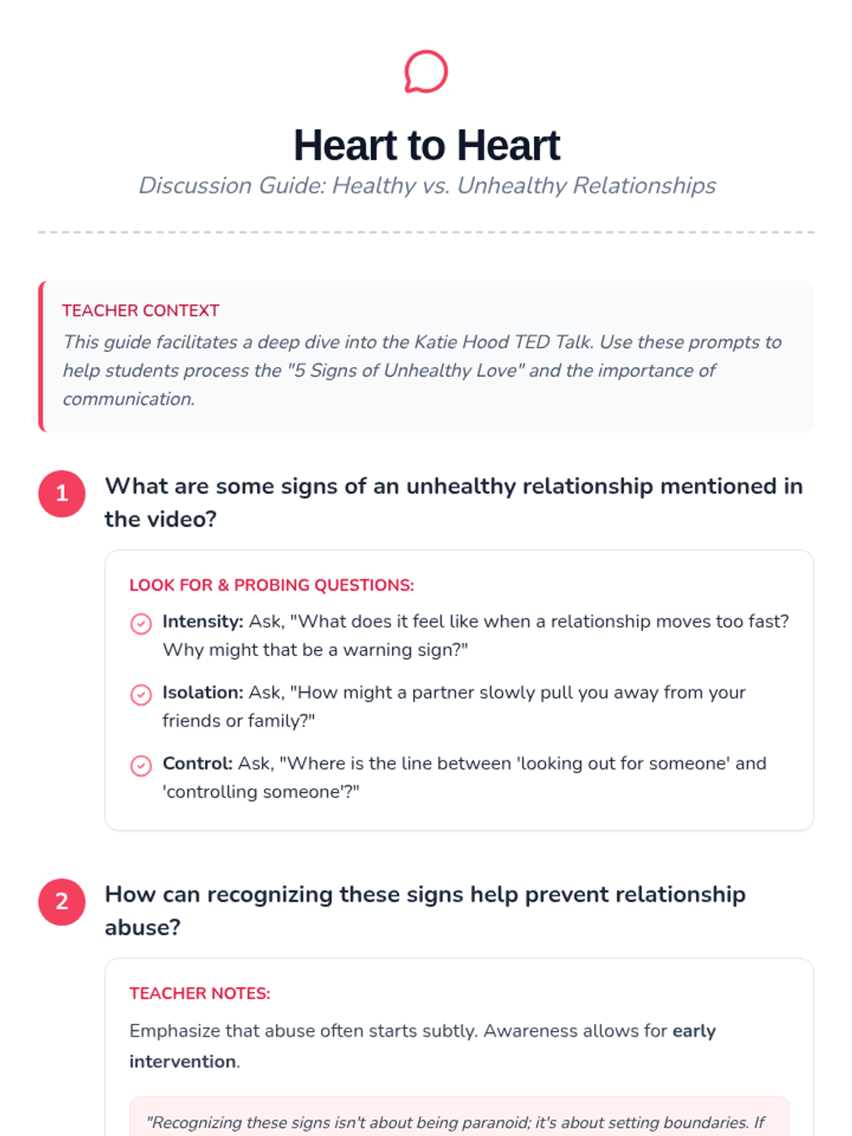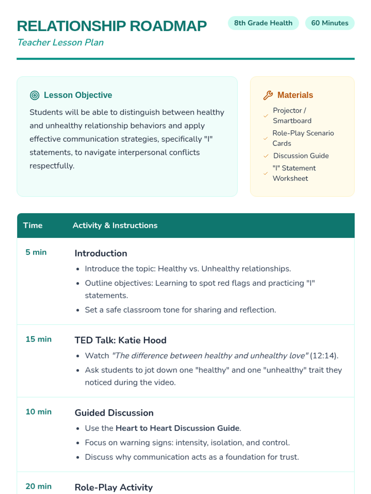 A comprehensive lesson for eighth-grade health education focused on identifying the characteristics of healthy versus unhealthy relationships and practicing effective communication skills. Students will analyze a TED talk by Katie Hood, engage in role-play scenarios, and master 'I' statements to build stronger, more respectful connections.