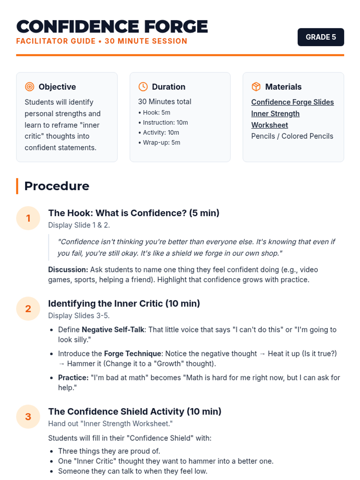 A 30-minute interactive lesson for 5th graders focused on identifying personal strengths, understanding negative self-talk, and building a toolkit for self-confidence.