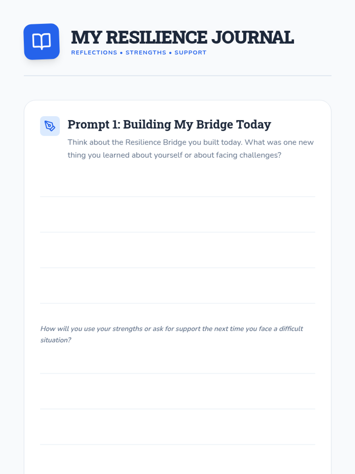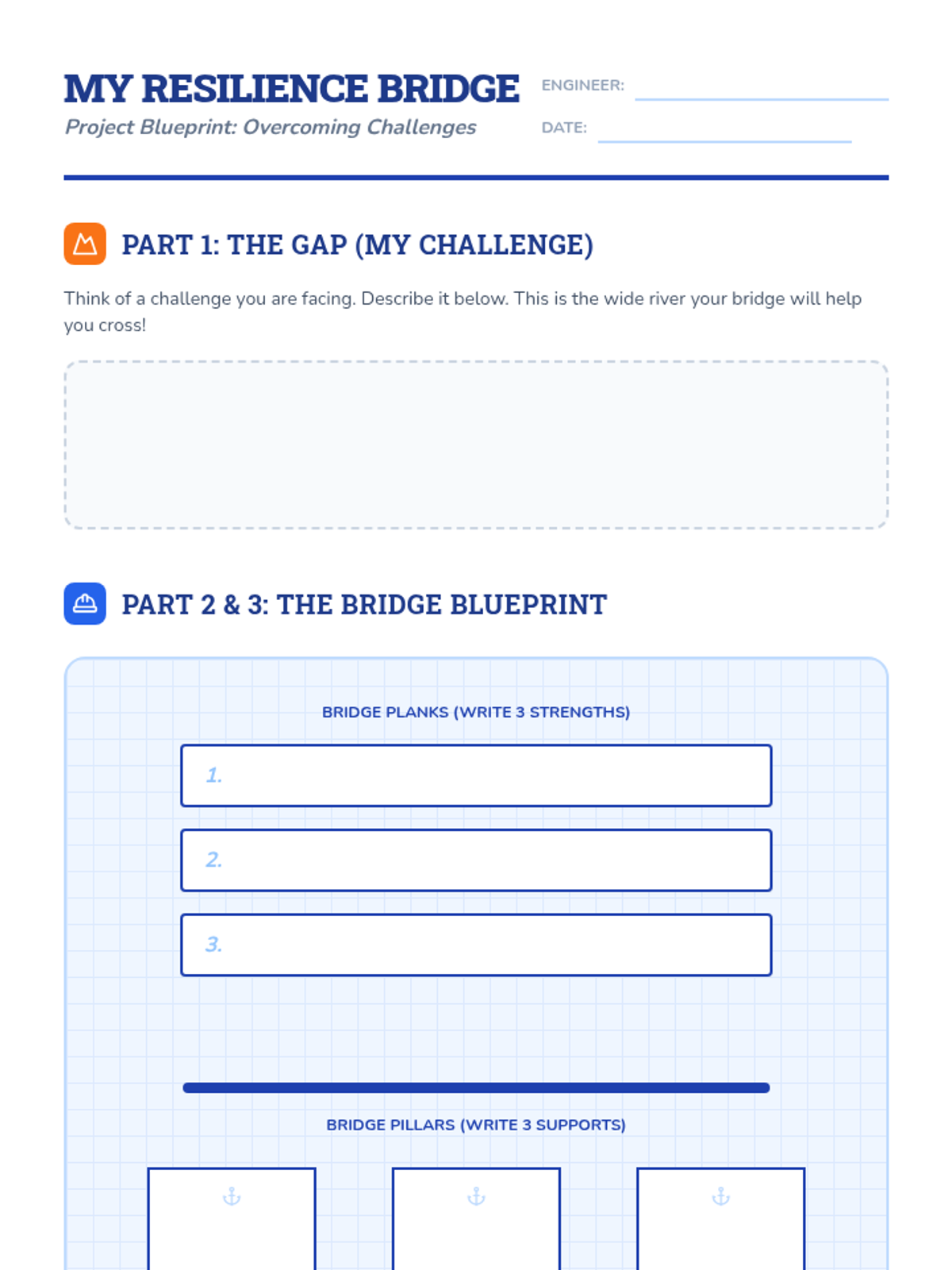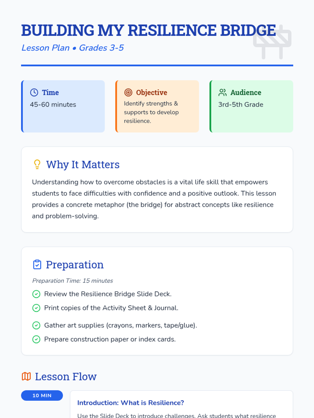 A 45-60 minute lesson for 3rd-5th graders focusing on developing resilience through the metaphor of building a bridge across challenges using personal strengths and support systems.