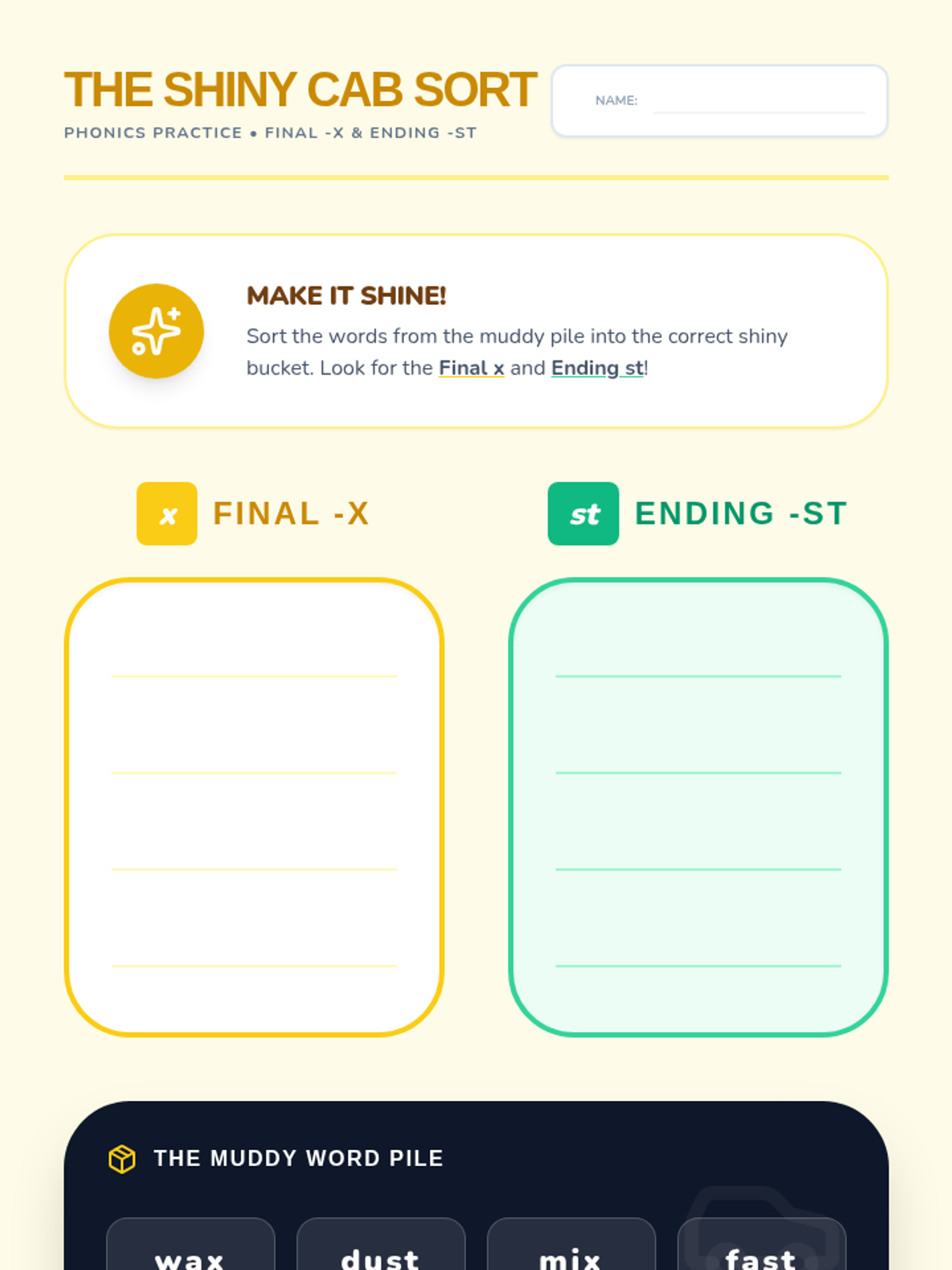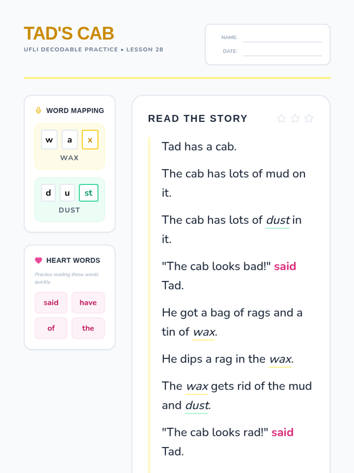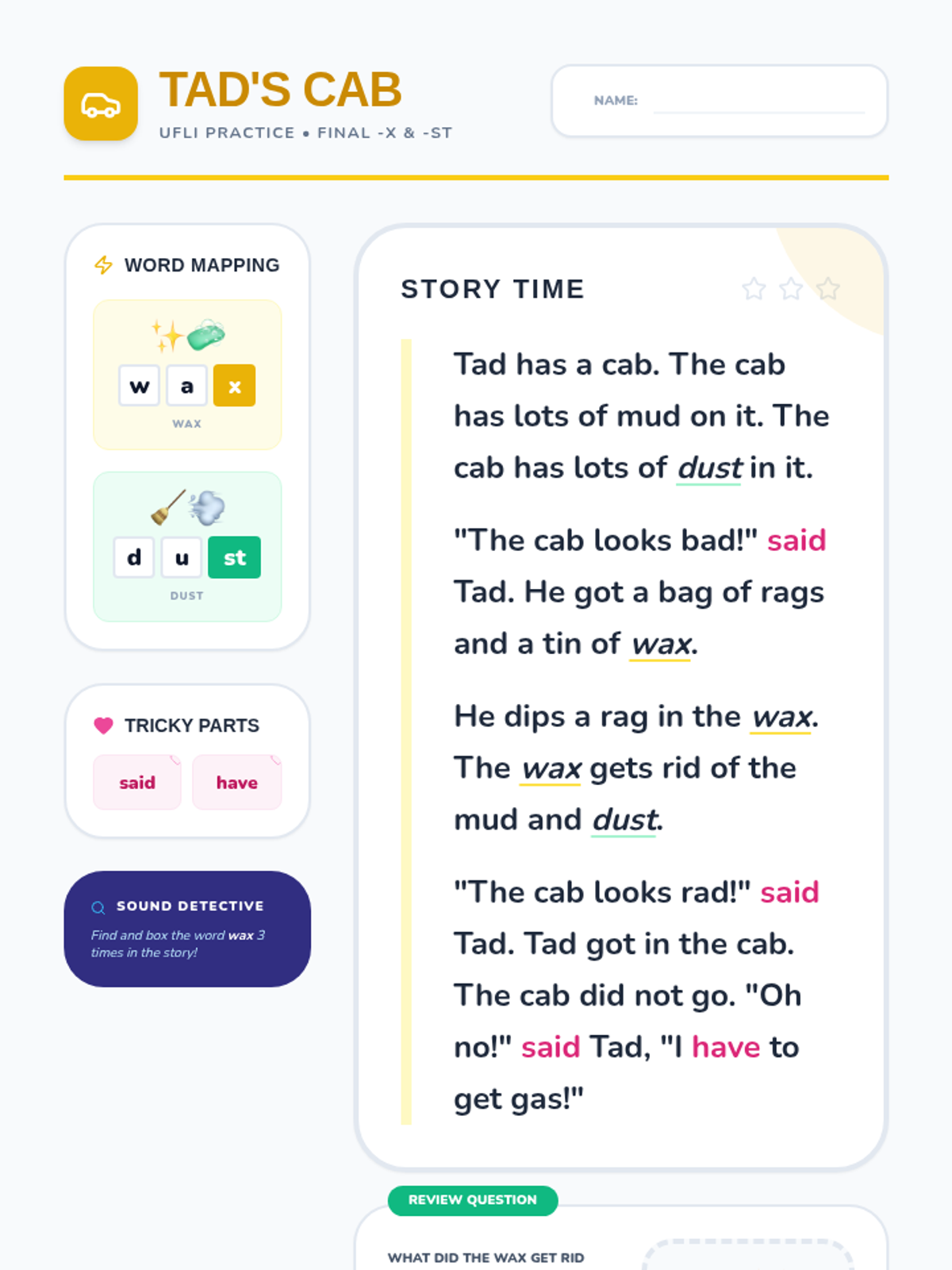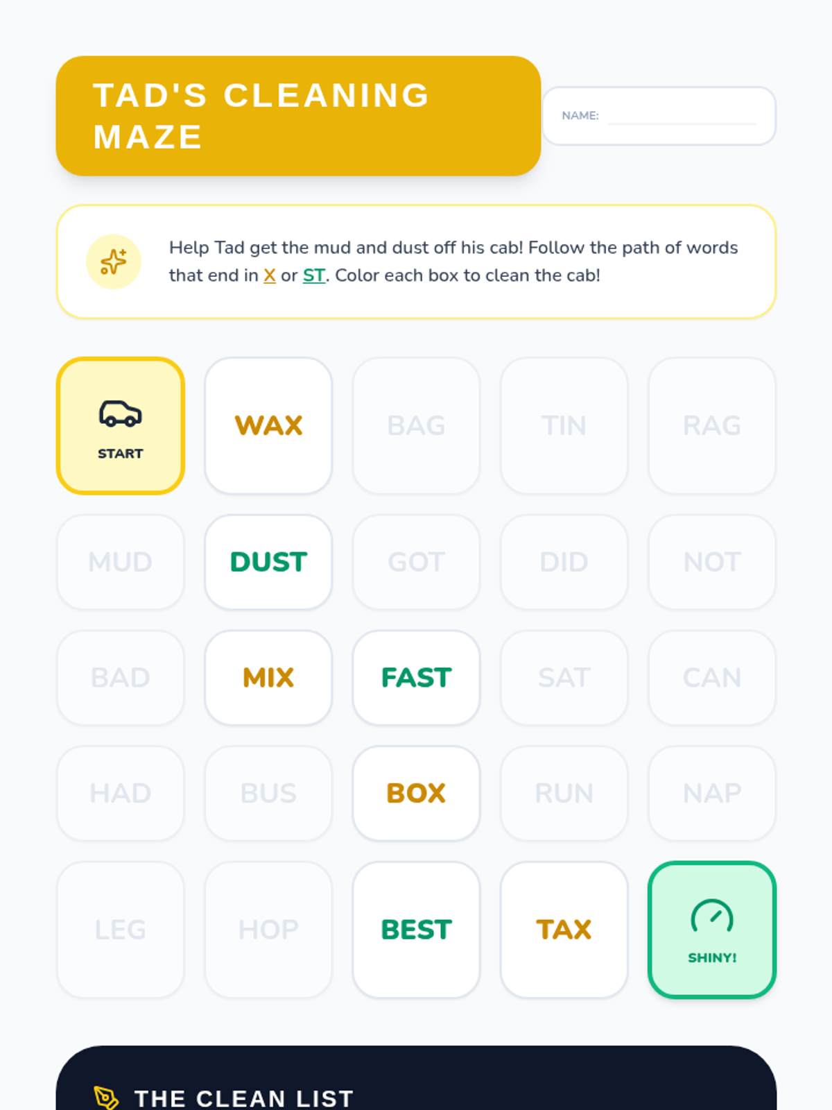 Focuses on short vowels, ending blends (-st), and the final -x sound. Students will read about Tad cleaning his muddy cab, incorporating words like 'dust', 'wax', and 'rags'.