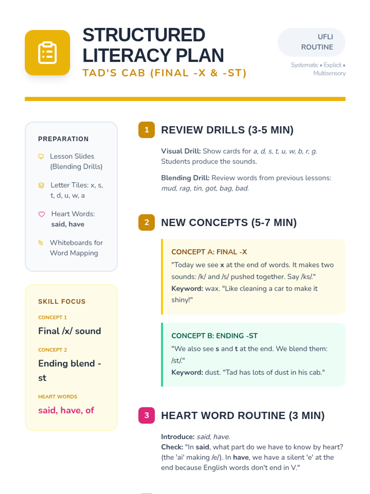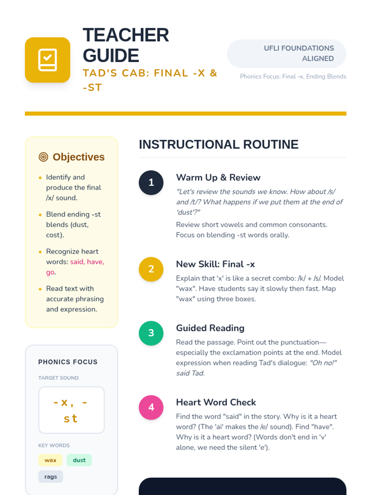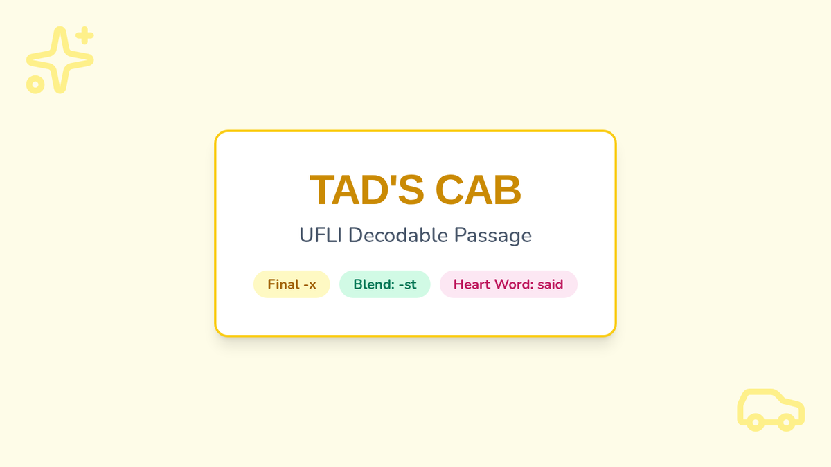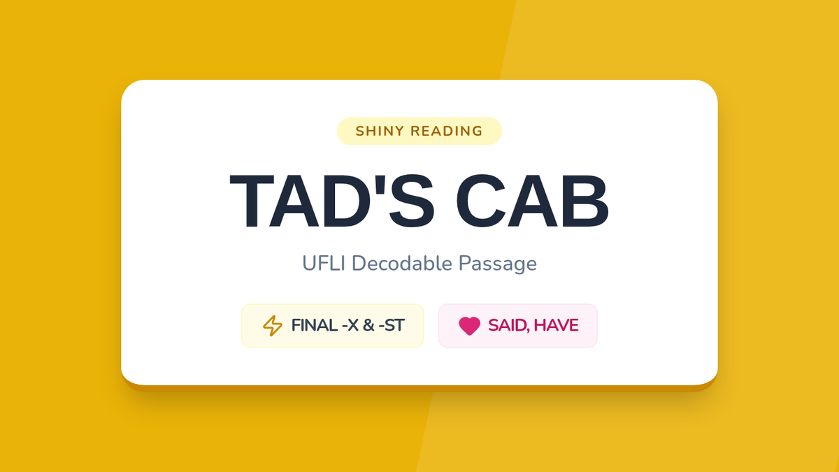 Focuses on short vowels, ending blends (-st), and the final -x sound. Students will read about Tad cleaning his muddy cab, incorporating words like 'dust', 'wax', and 'rags'.