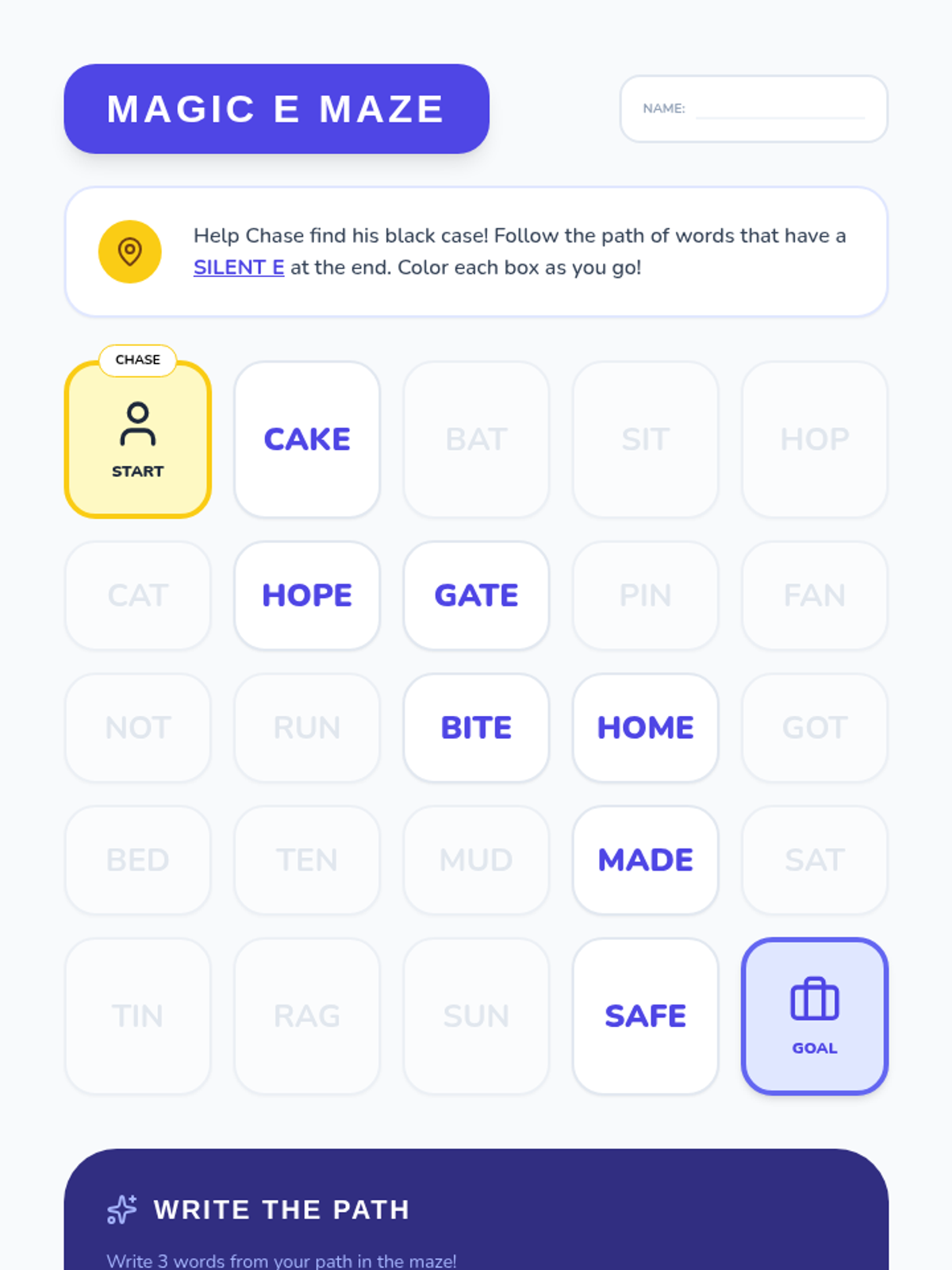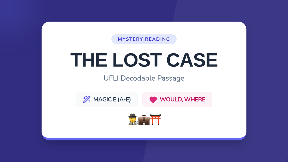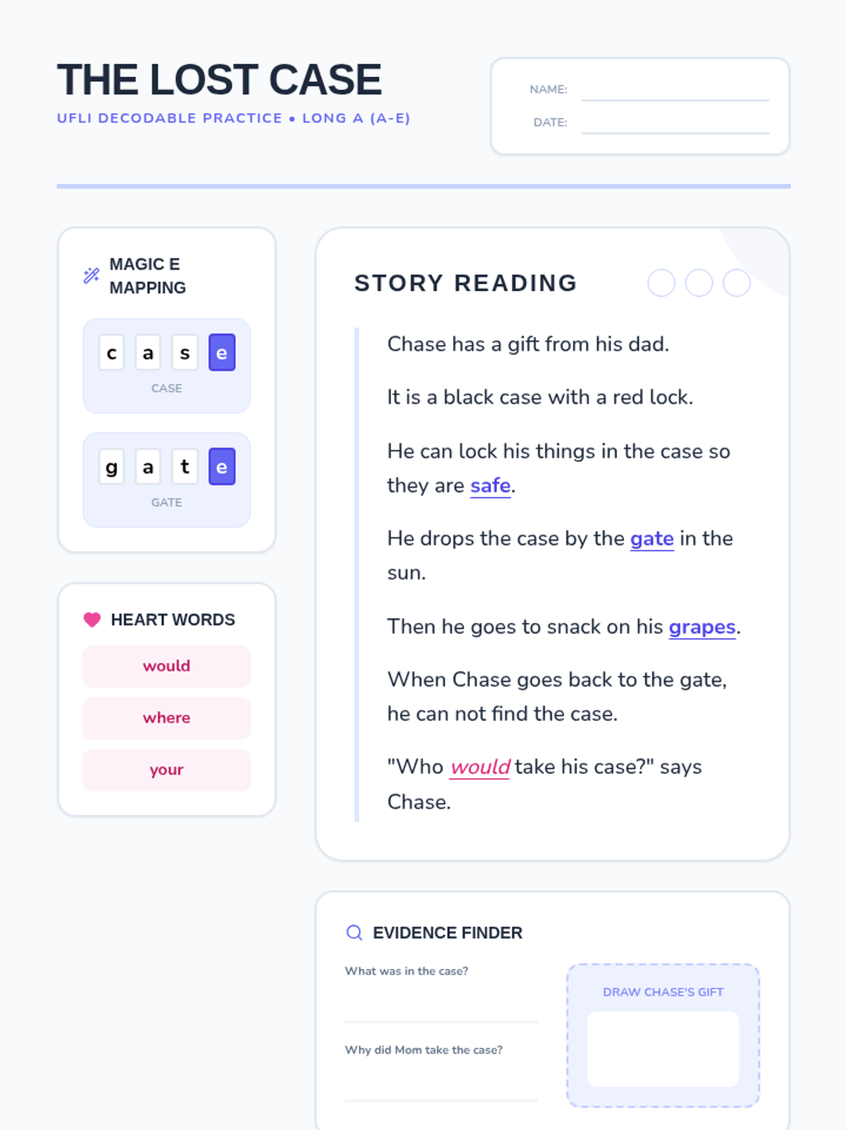 Focuses on the long 'a' vowel sound with the silent 'e' pattern (a-e). Students will read about Chase and his lost black case, practicing words like 'gate', 'safe', 'shade', and 'Mave'.