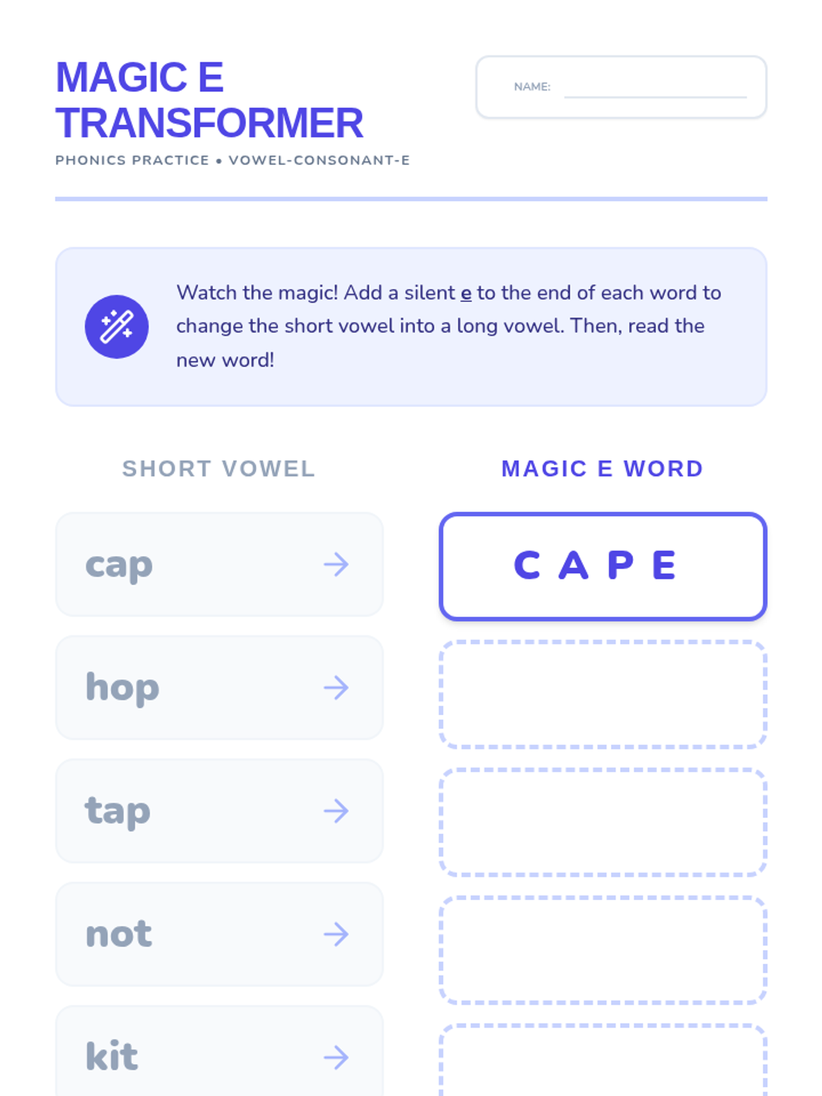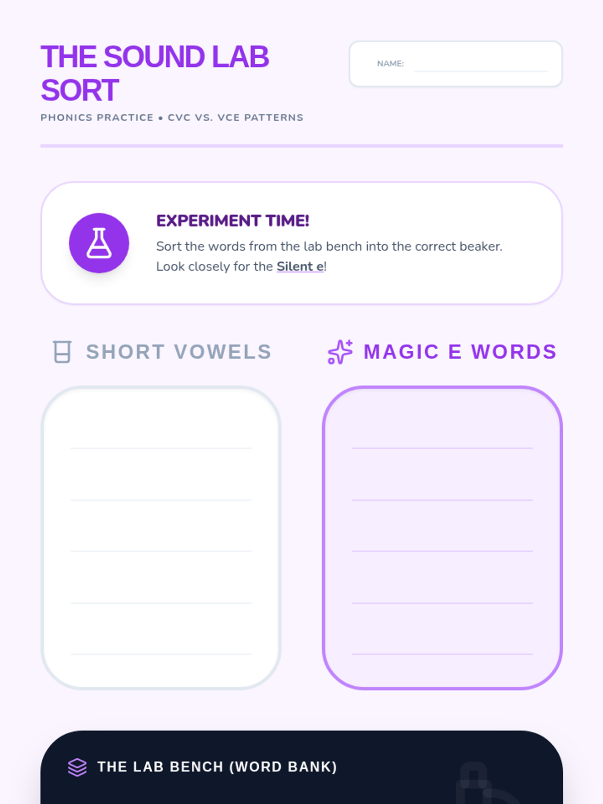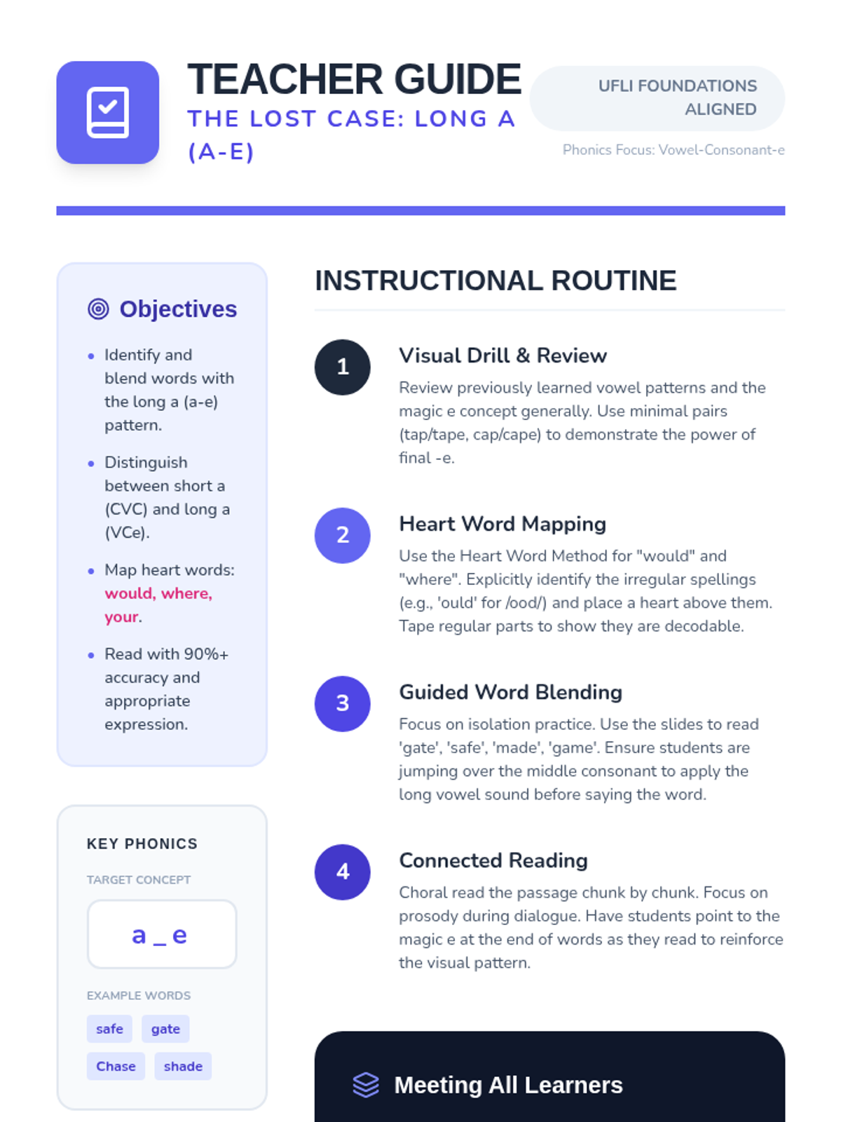 Focuses on discriminating between short /a/ (CVC) and long /a/ (VCe) patterns through phoneme-grapheme mapping and targeted decoding of an encrypted message text.