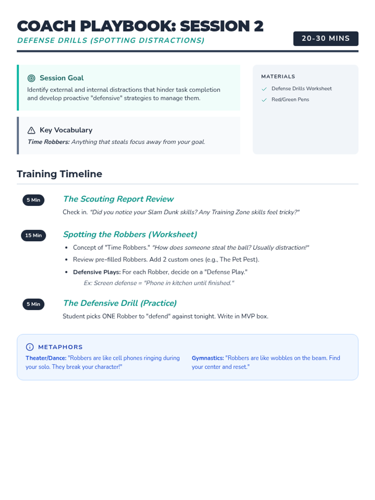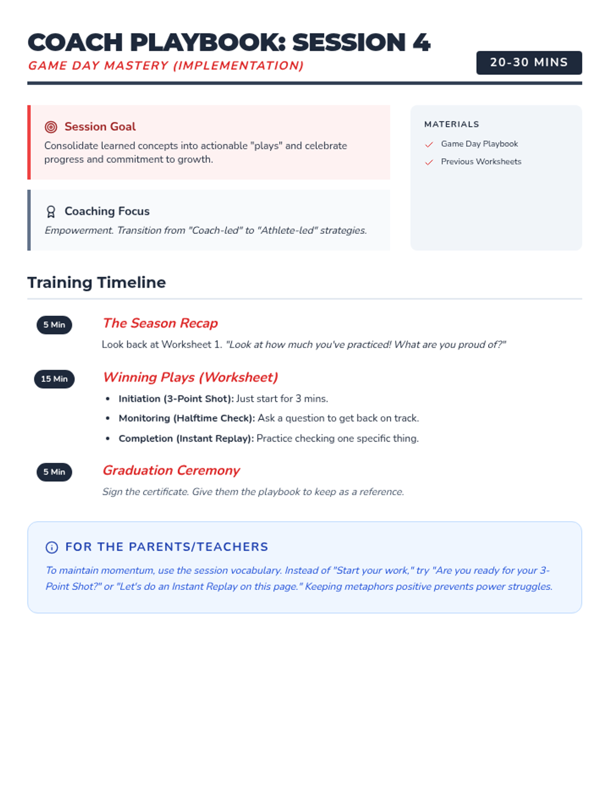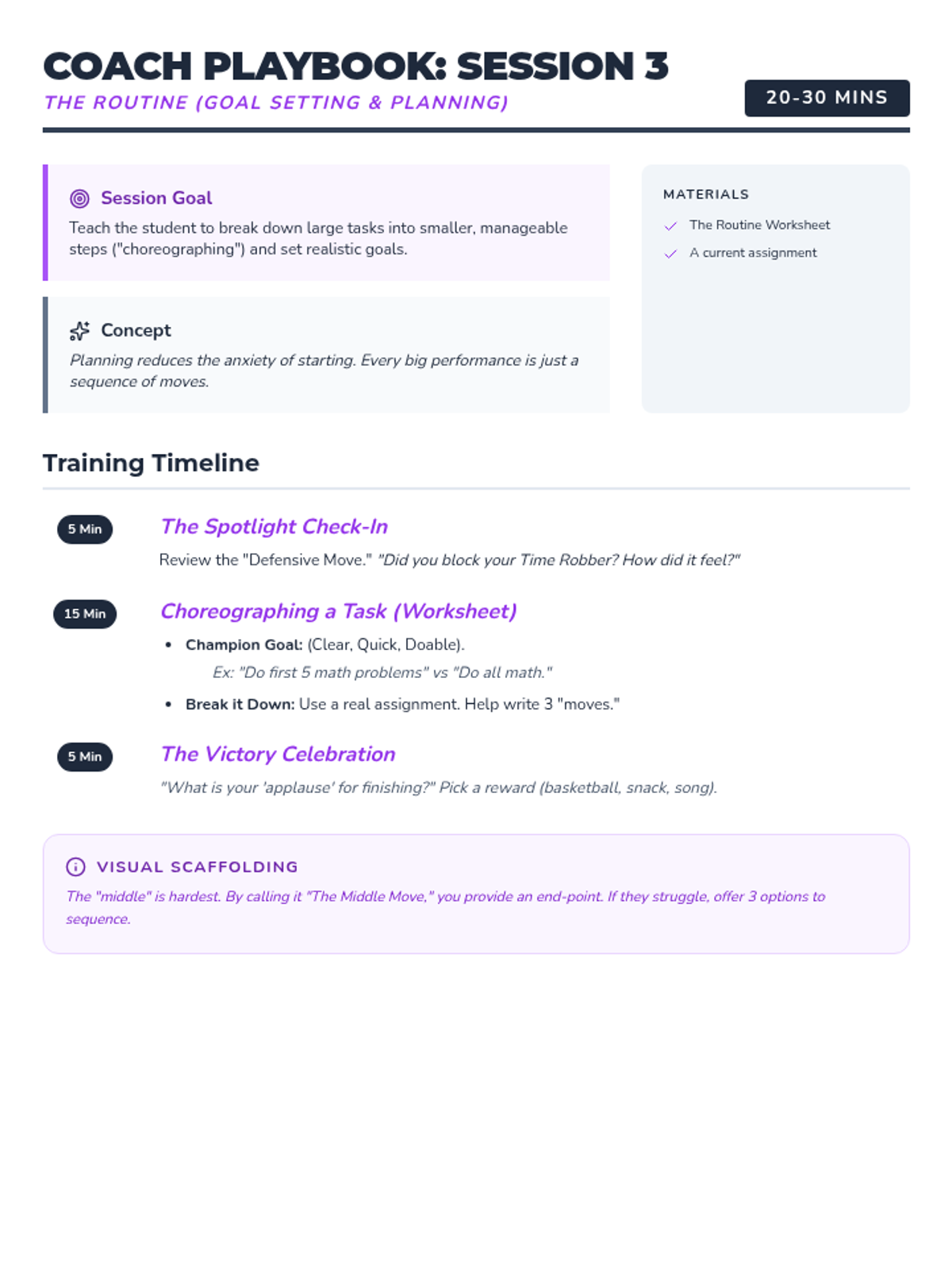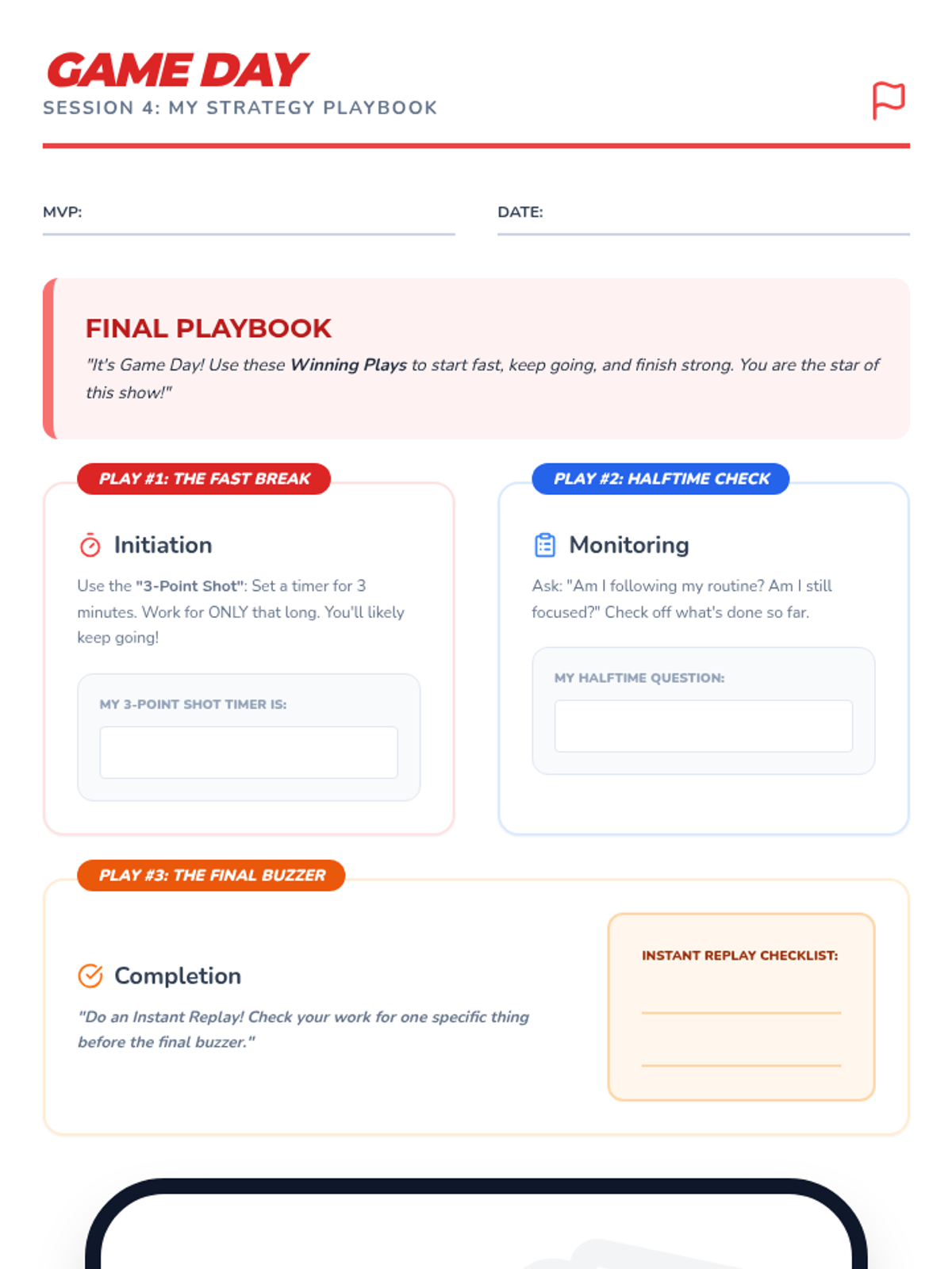 Students learn and practice specific strategies for task initiation, self-monitoring, and independence to finish their 'game' strong.