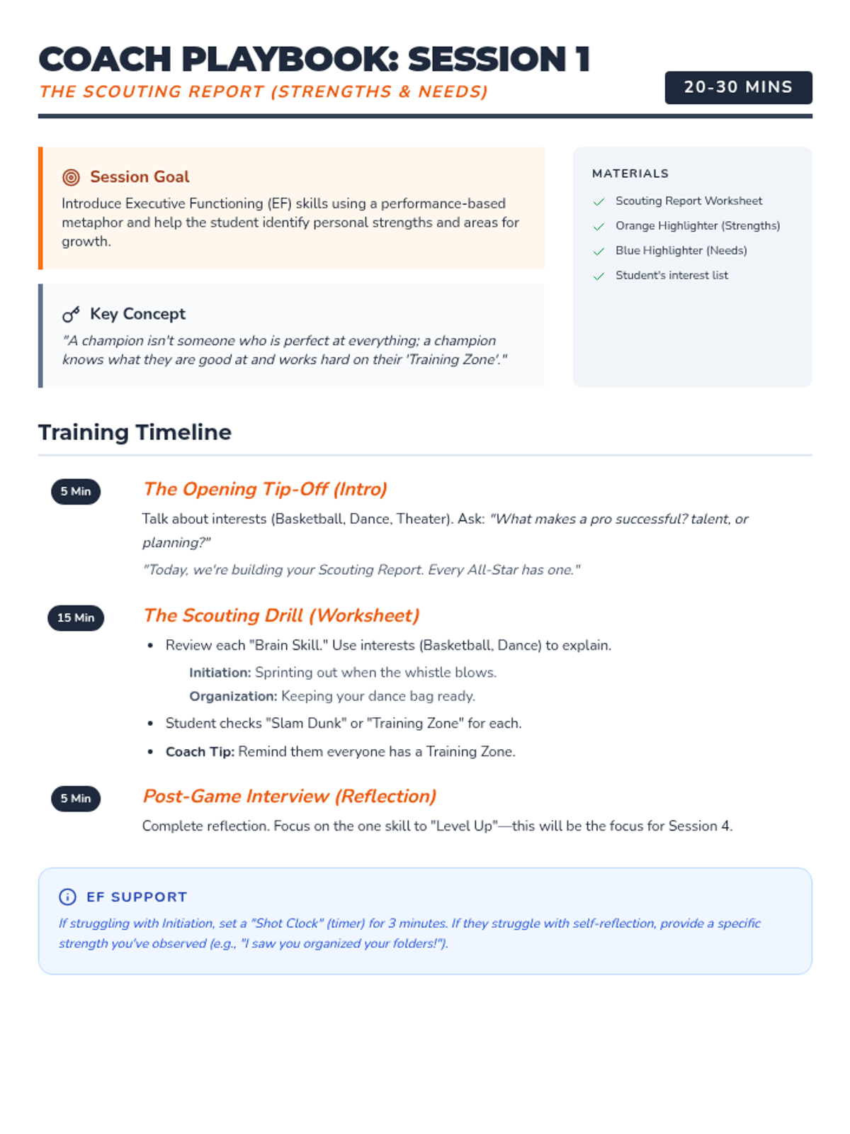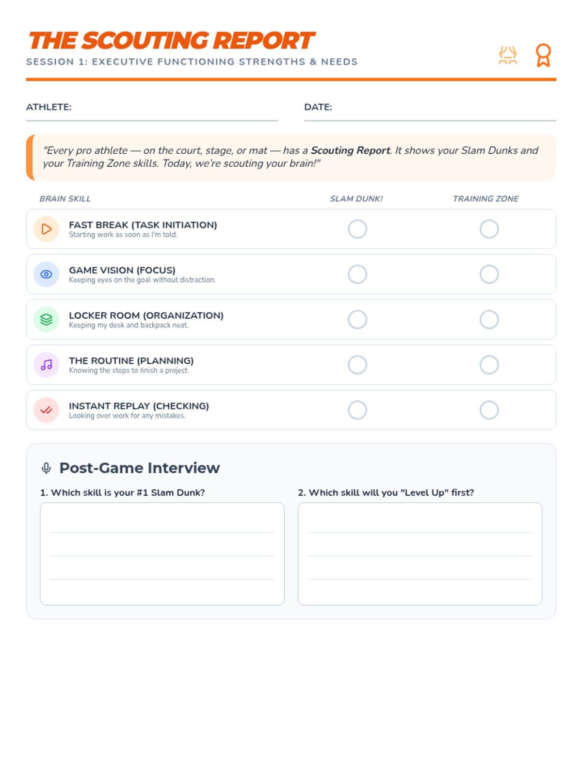 Students identify their executive functioning 'stats' by recognizing their strengths and areas for growth using a 'Scouting Report' metaphor.