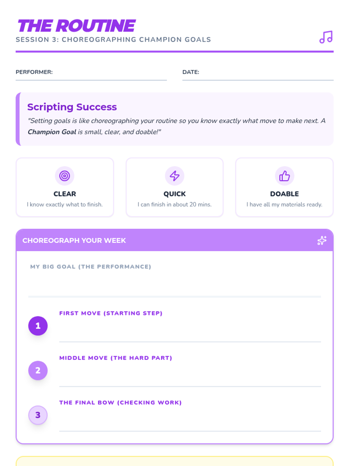 Students learn to choreograph their success by setting specific, manageable goals using dance and theater metaphors.