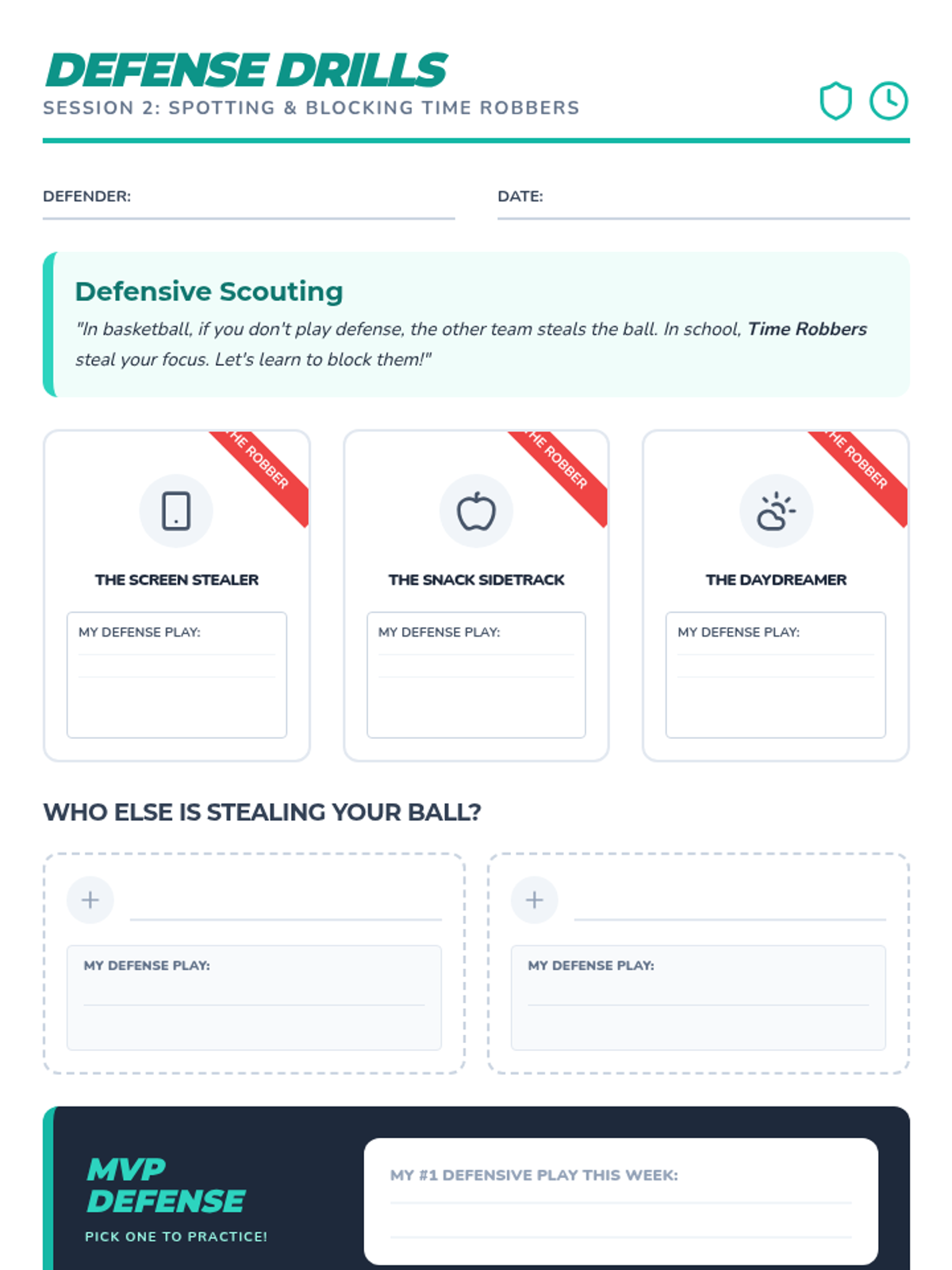 Students identify 'Time Robbers' (distractions) that interfere with work completion and develop defensive strategies to stay on task.