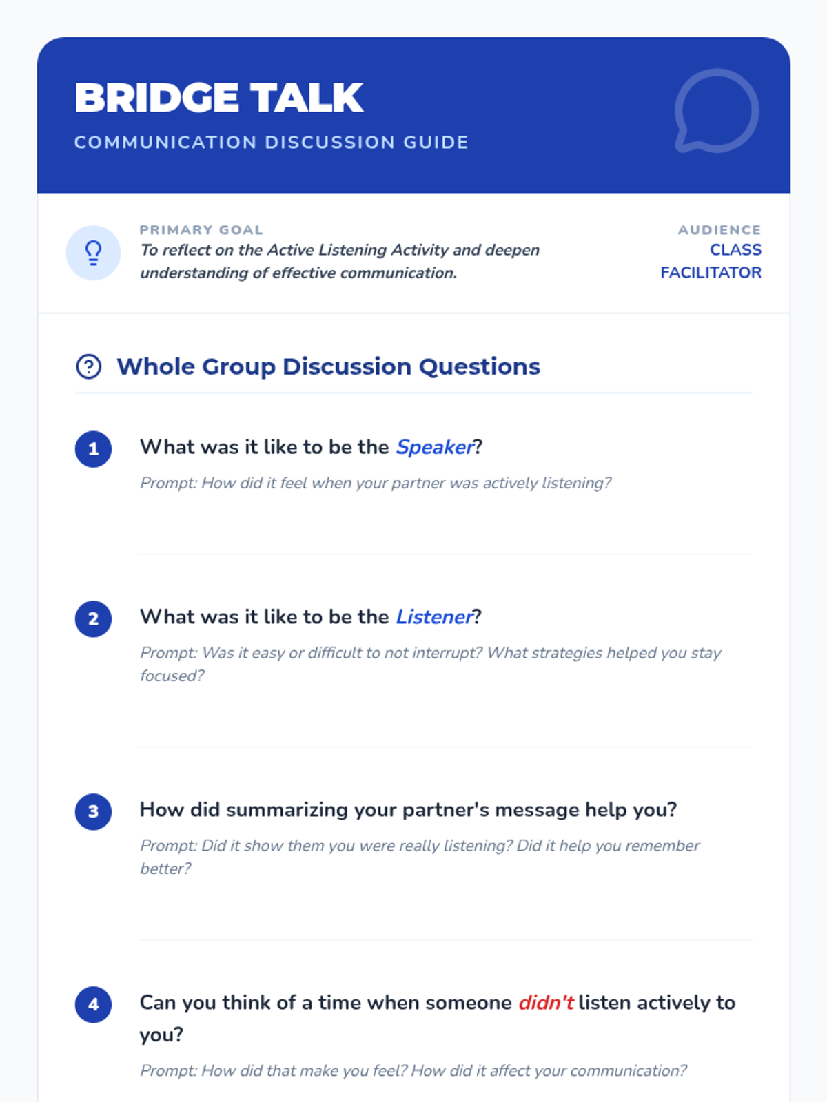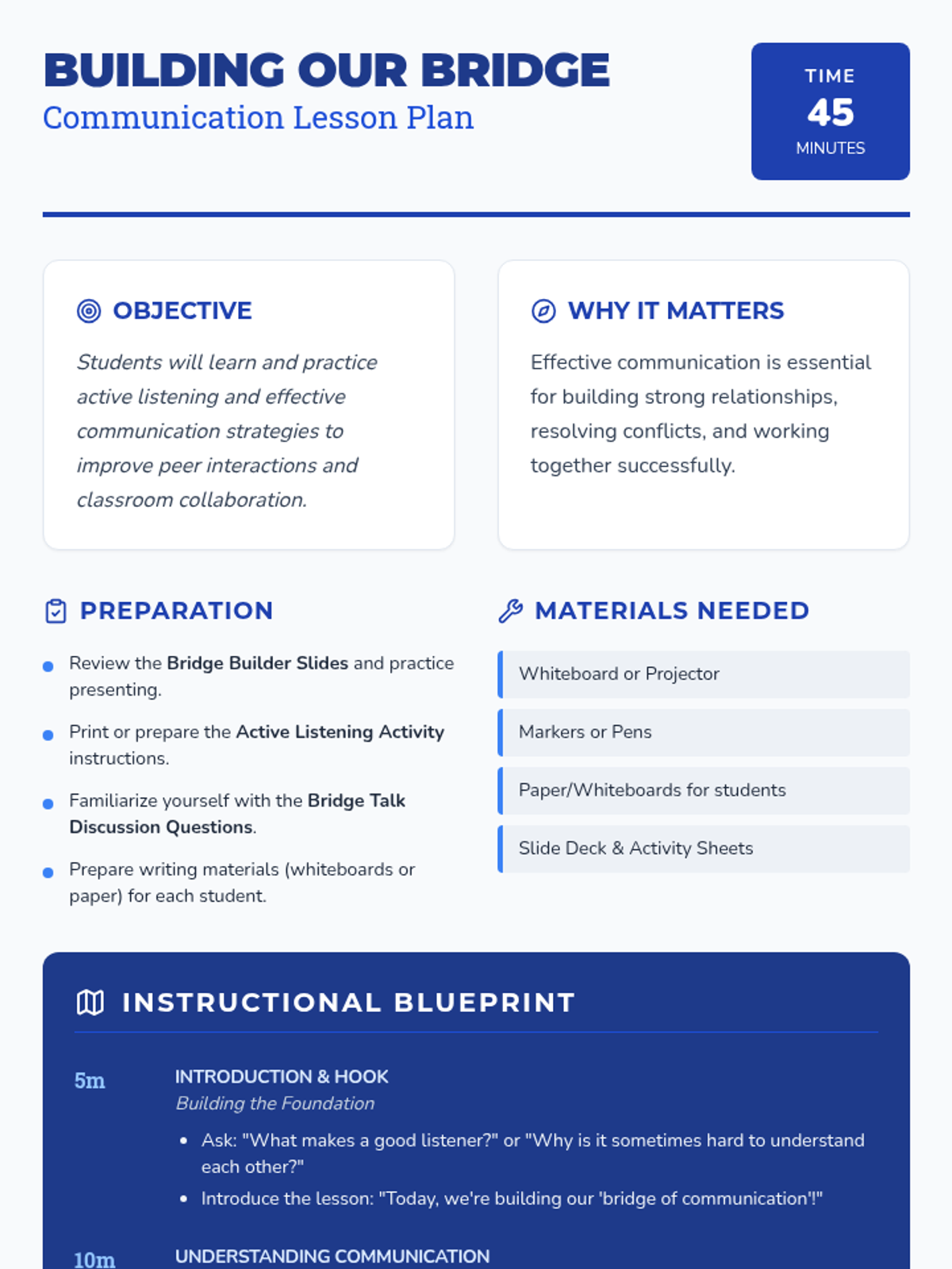 This lesson fosters stronger, more empathetic communication skills in 3rd-5th graders by focusing on active listening and effective communication strategies through a 'bridge-building' theme.