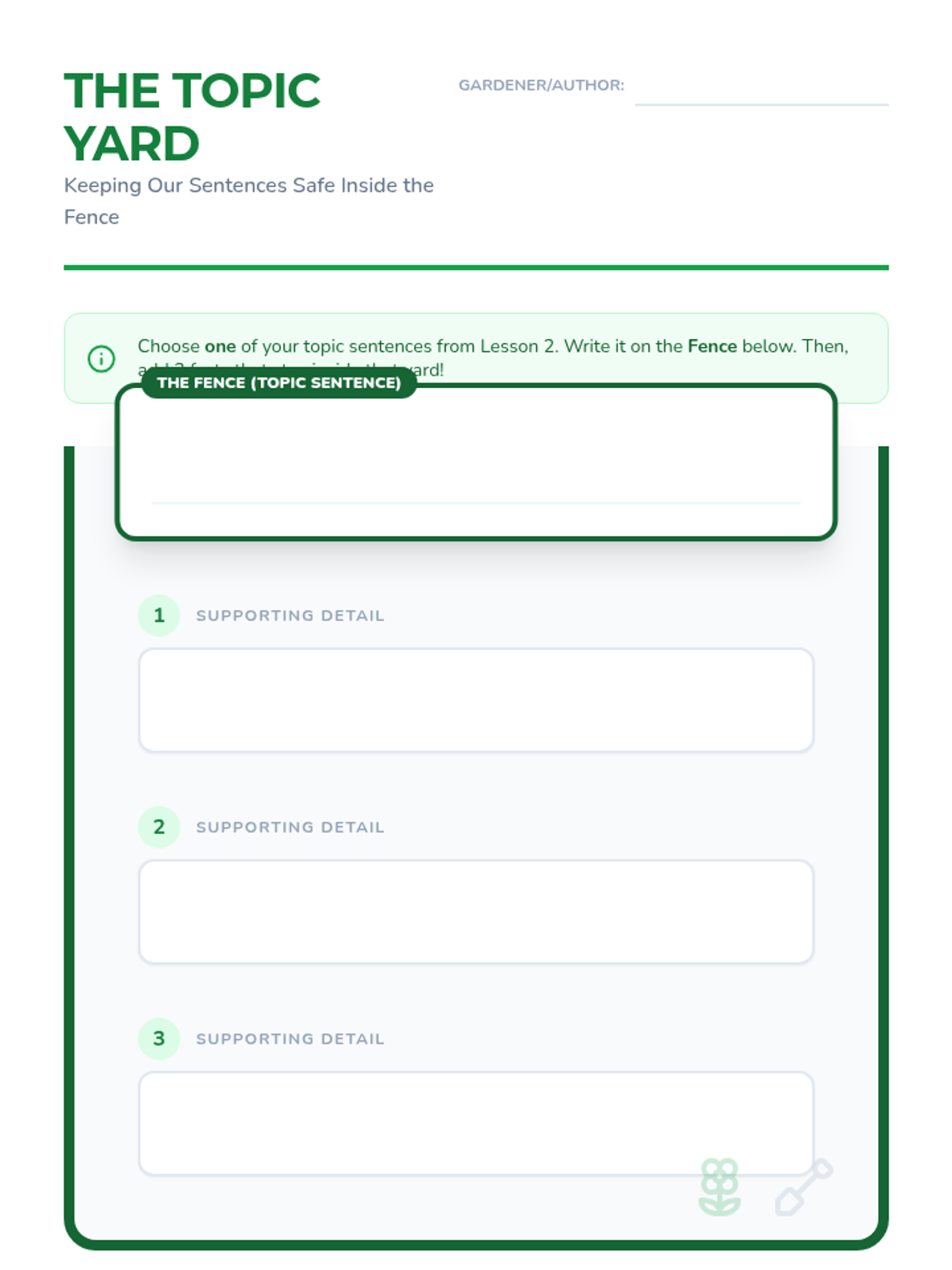 Focusing on elaboration, students add supporting details to their topic sentences. They use the 'Topic Fence' metaphor to ensure every sentence stays on track and supports the main idea of the paragraph.
