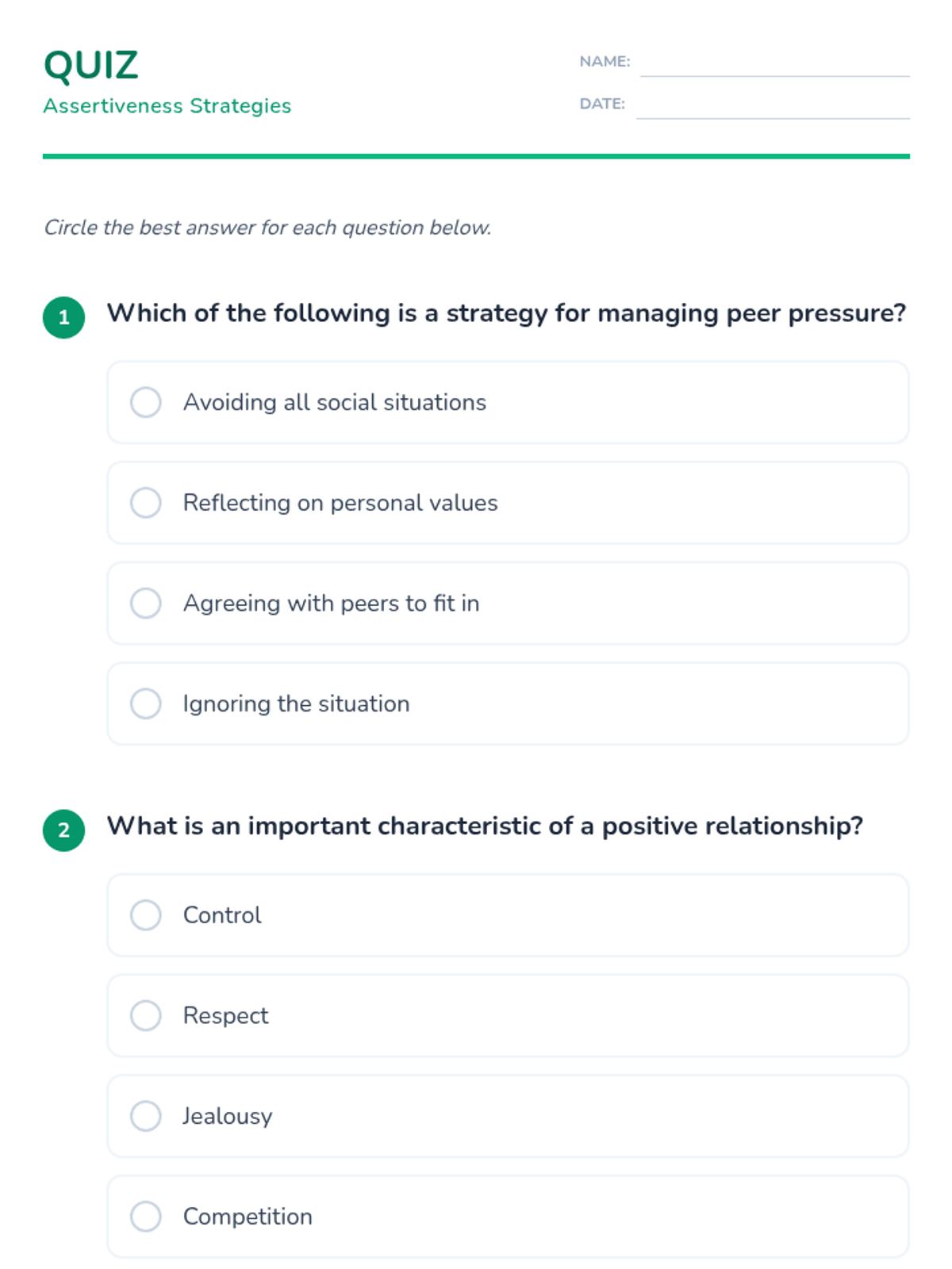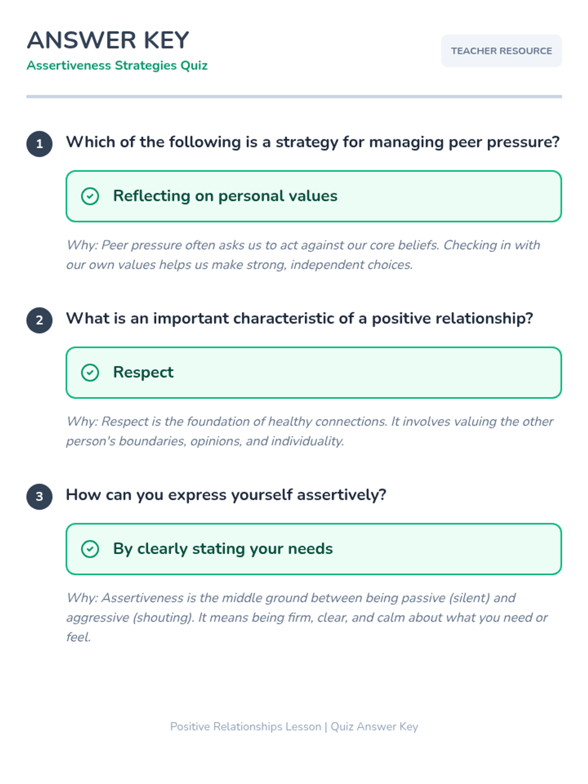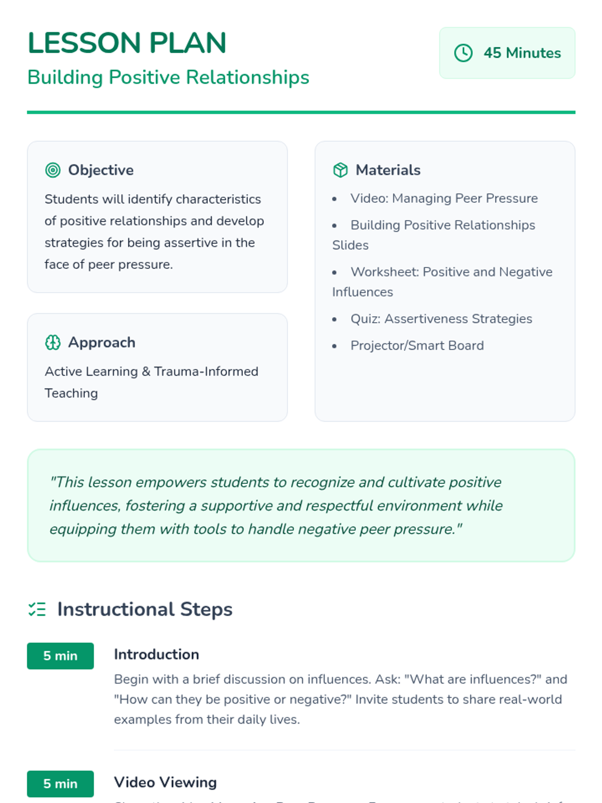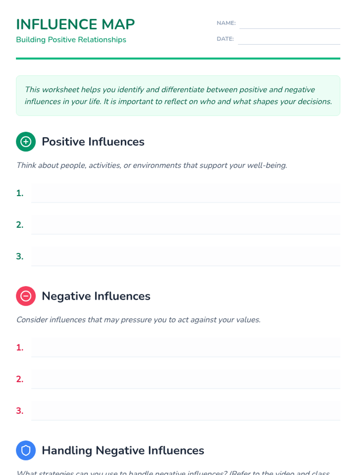 This lesson helps students identify characteristics of positive relationships and develop assertiveness strategies to navigate peer pressure. Students will explore positive and negative influences and practice making informed decisions for their well-being.