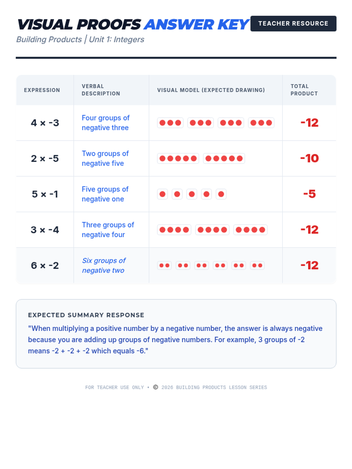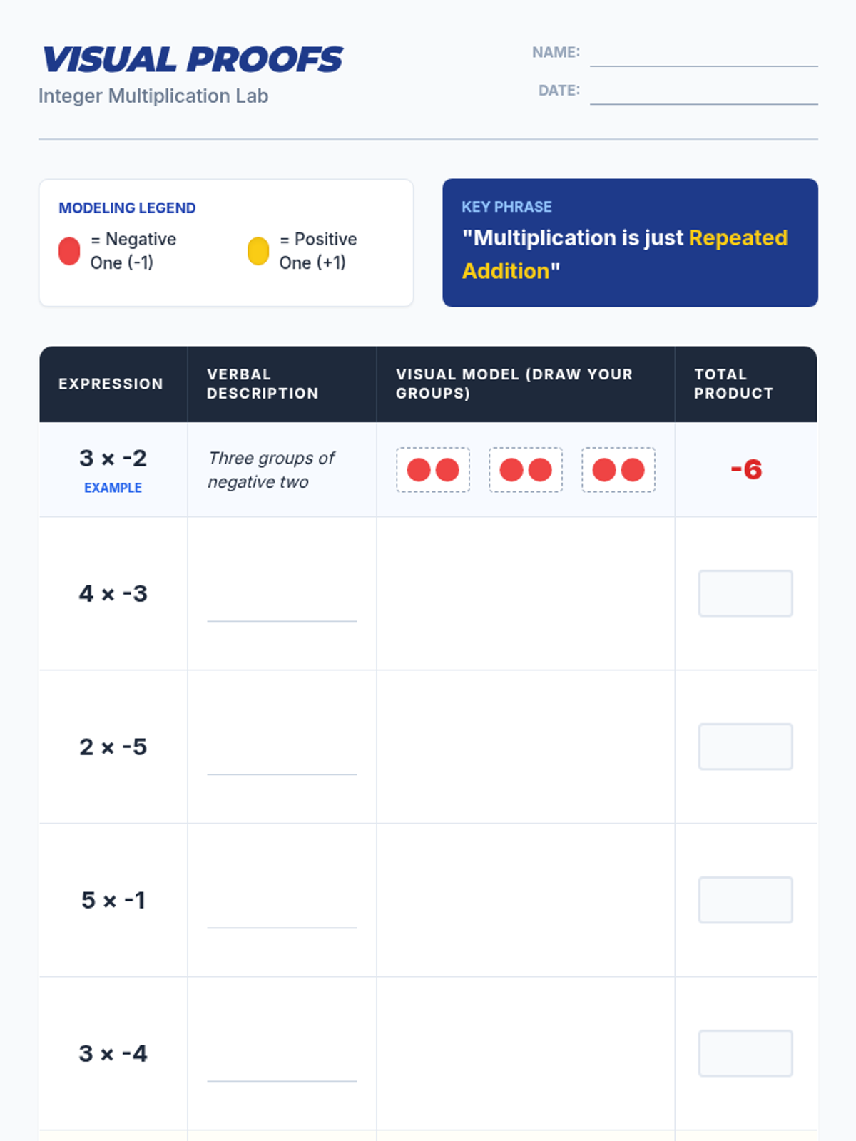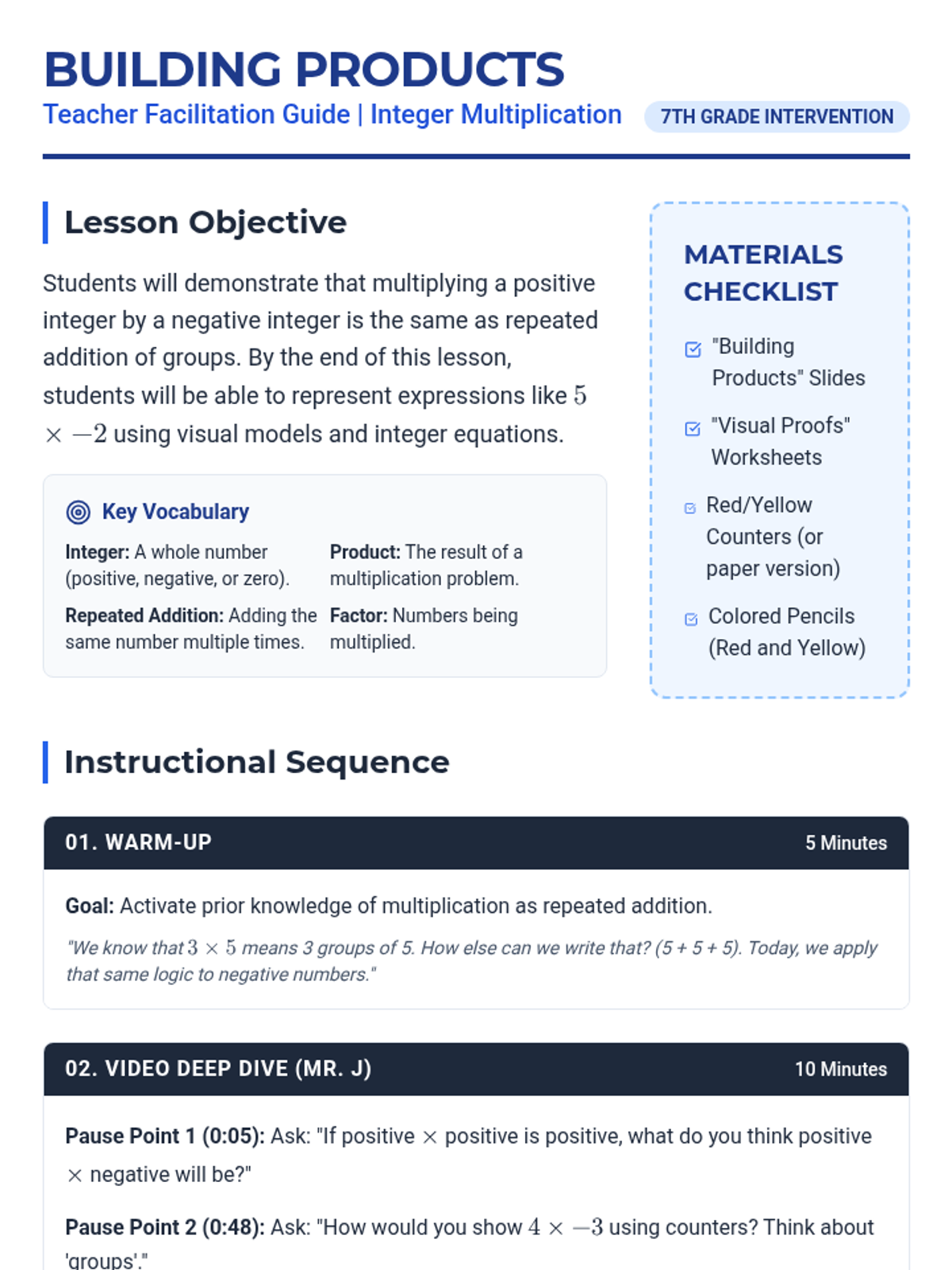 A remediation lesson for 7th-grade students focused on understanding the multiplication of positive and negative integers through the lens of repeated addition and visual counter models.