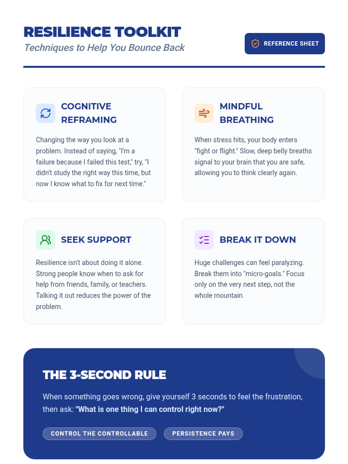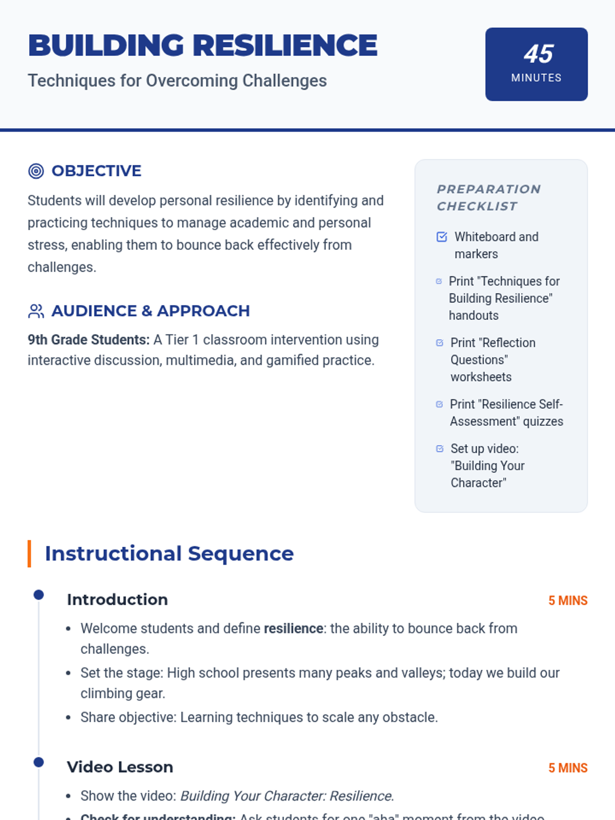 This lesson helps 9th-grade students develop resilience by teaching them techniques to manage stress and overcome challenges. It includes a video, interactive discussion, a game, and self-reflection activities.