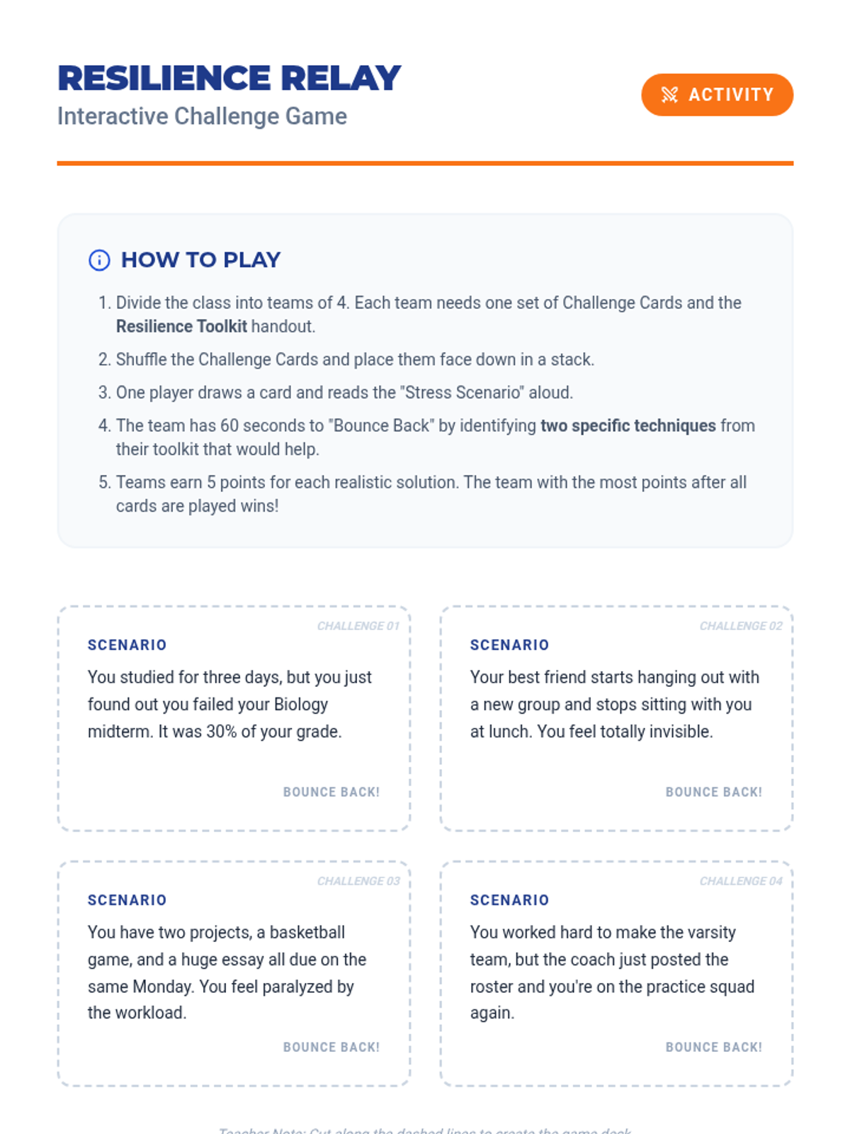 Practical team-based synergy challenges to apply collaborative problem-solving skills.