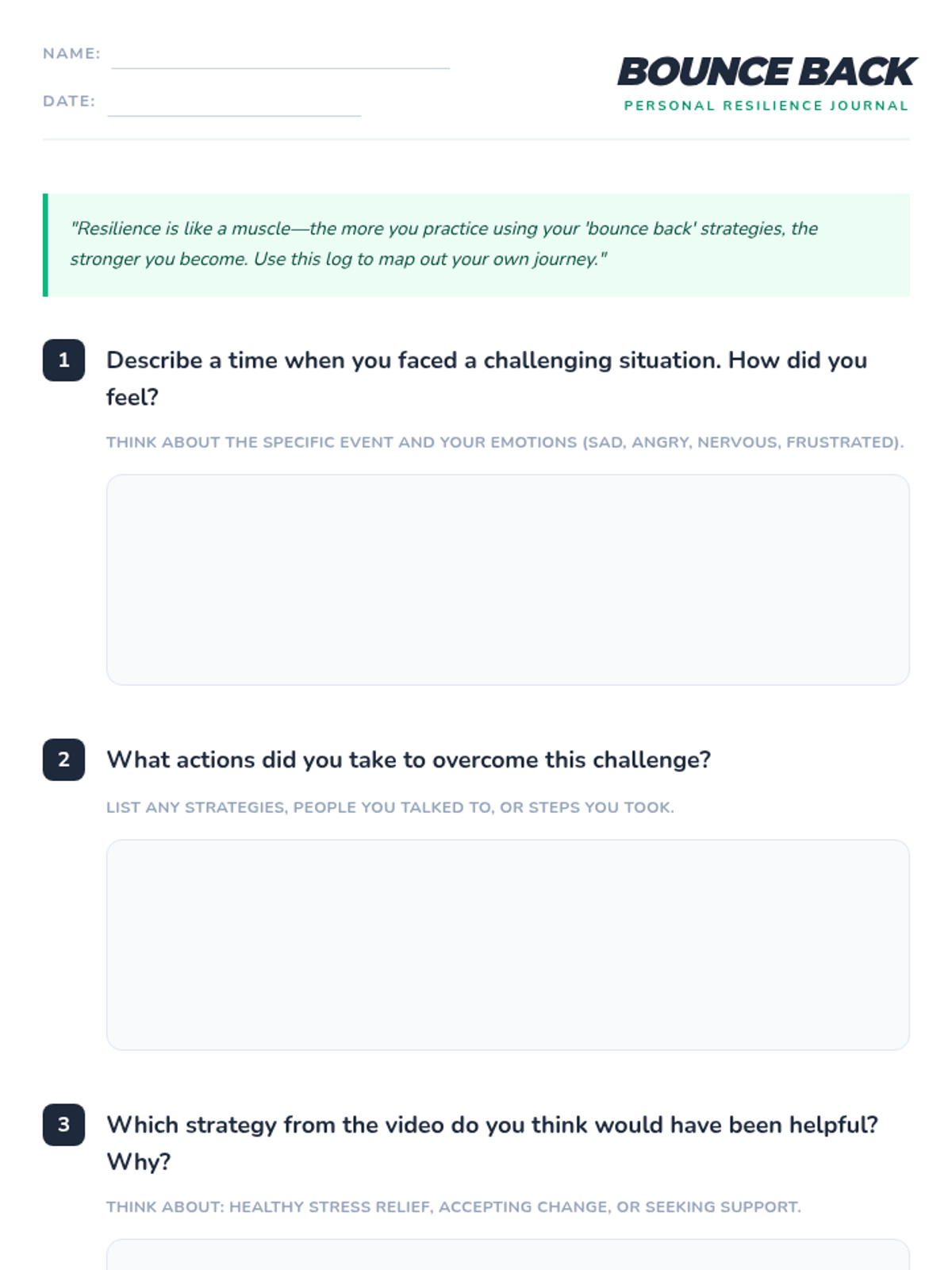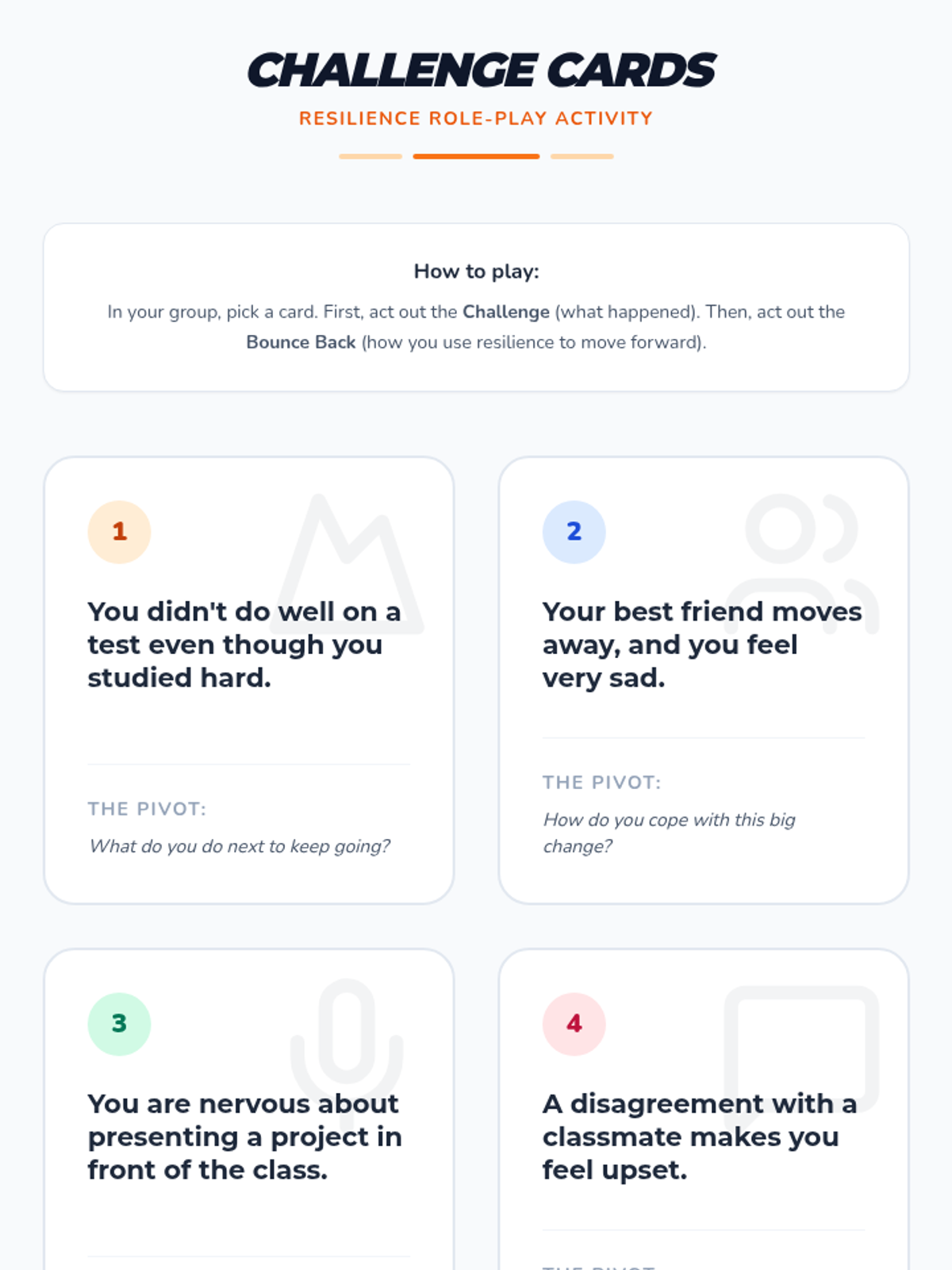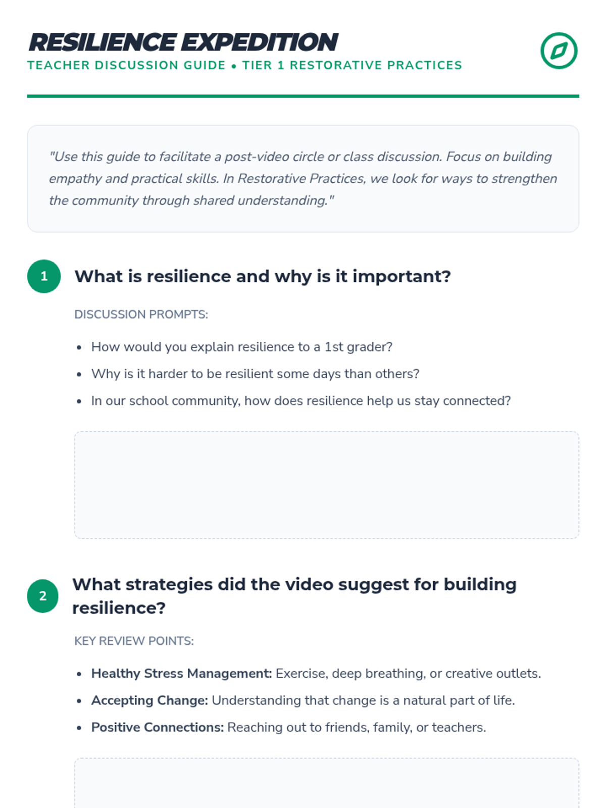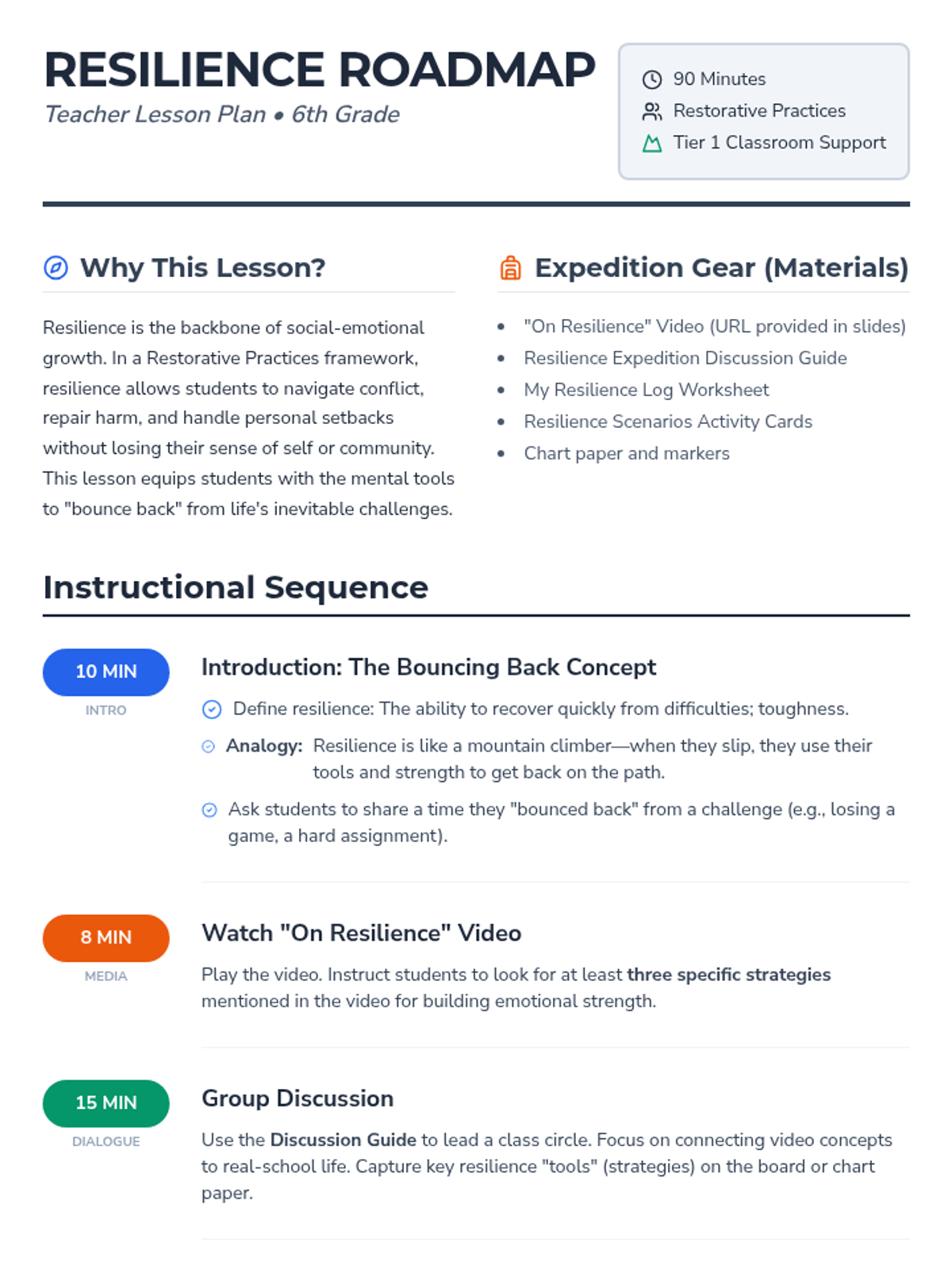 A 90-minute lesson for 6th grade students focused on developing resilience through Restorative Practices. Students explore coping strategies, watch a video, engage in role-playing, and reflect on personal challenges to build emotional strength.