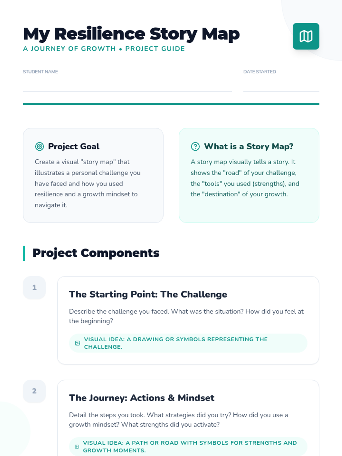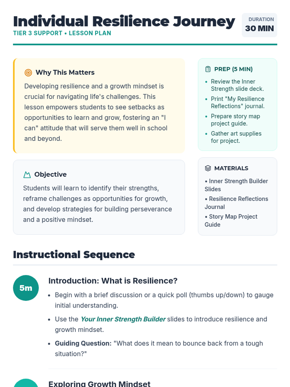A 30-minute individual Tier 3 lesson for 9th graders focused on developing resilience and a growth mindset. Students learn to reframe setbacks as opportunities for growth through guided reflection and a visual story-mapping project.
