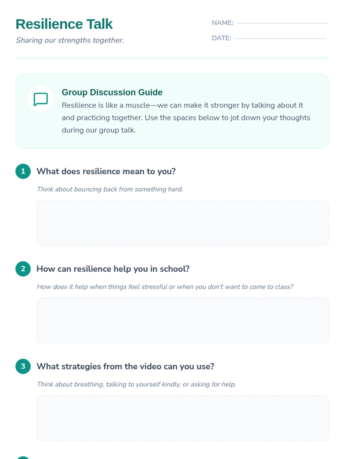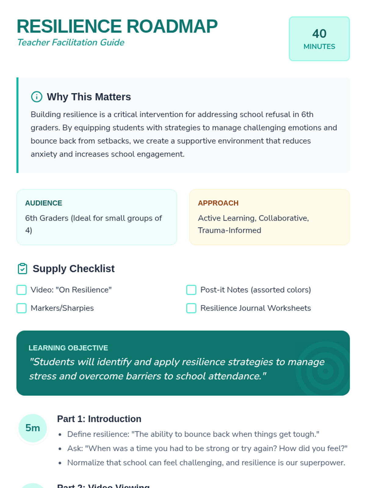 A lesson designed for 6th graders to build resilience as a tool to combat school refusal, featuring interactive discussions, a video component, and reflective journaling.