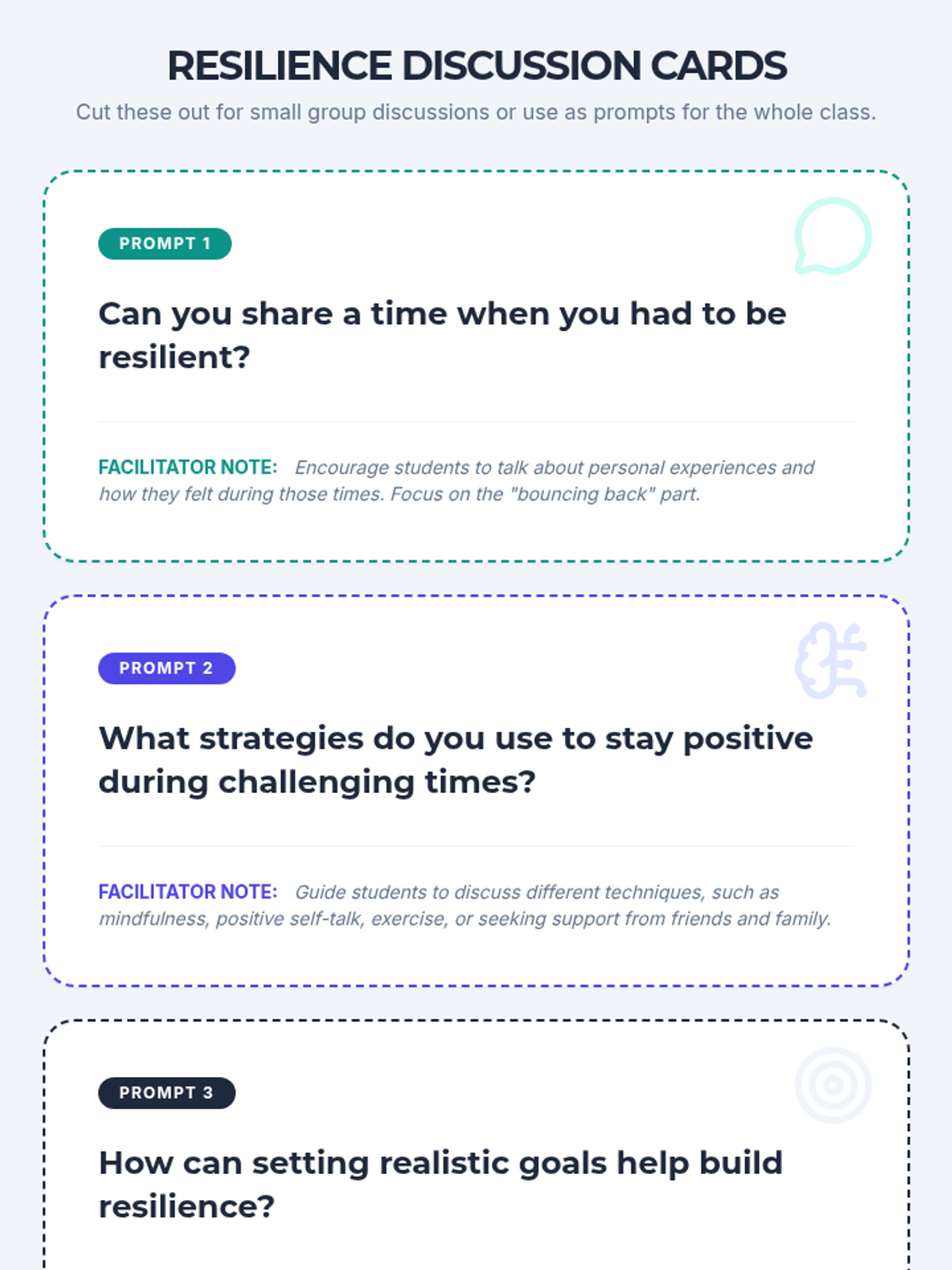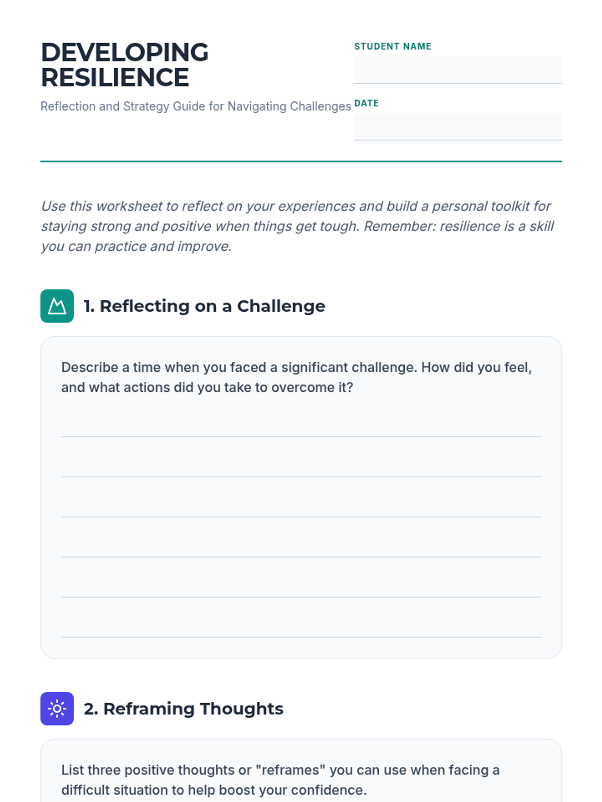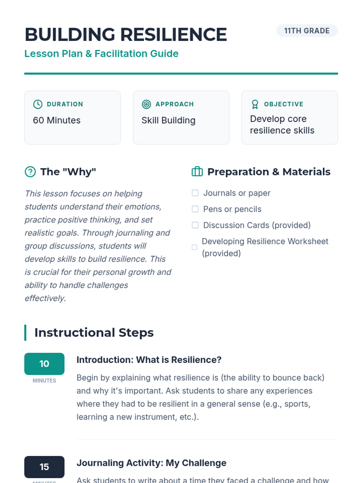 A comprehensive lesson designed for 11th-grade students to understand emotions, practice positive thinking, and set resilience-building goals through journaling and discussion.