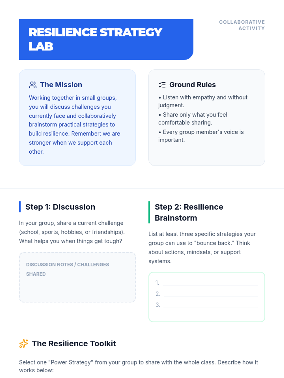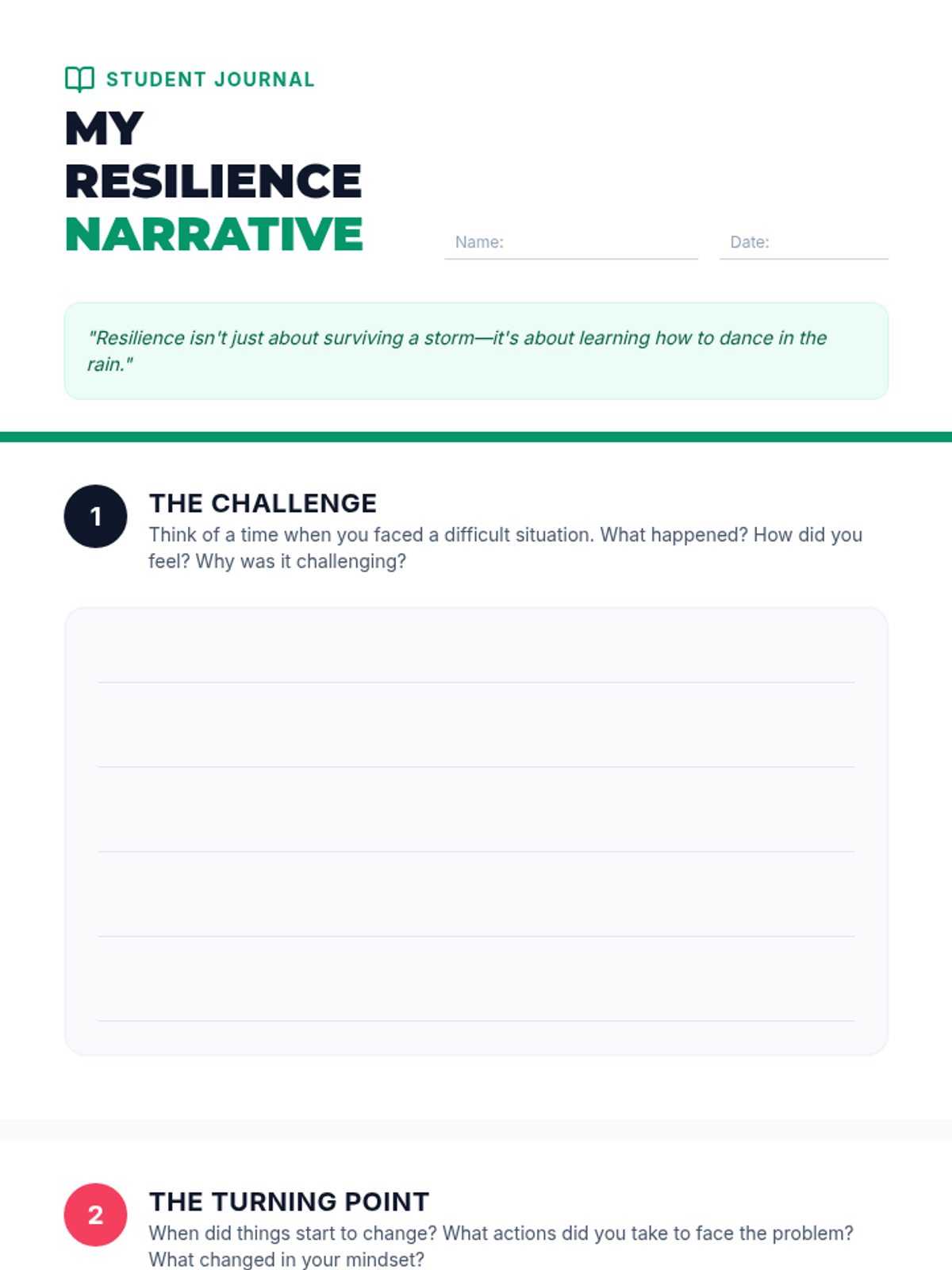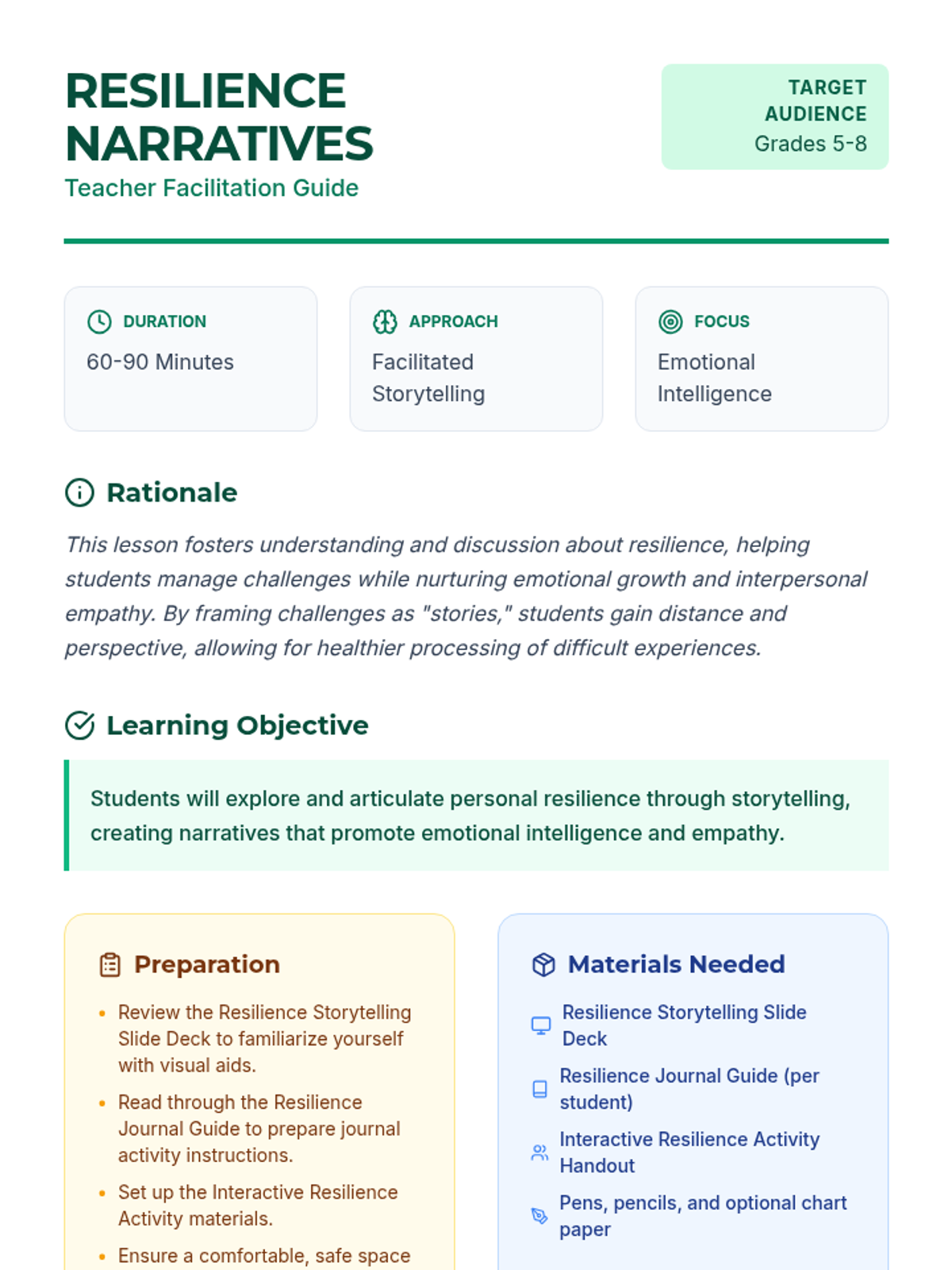 A lesson designed for grades 5-8 that uses the power of narrative to teach resilience and emotional intelligence. Students will explore personal challenges, draft their own stories of overcoming obstacles, and collaboratively brainstorm resilience strategies.