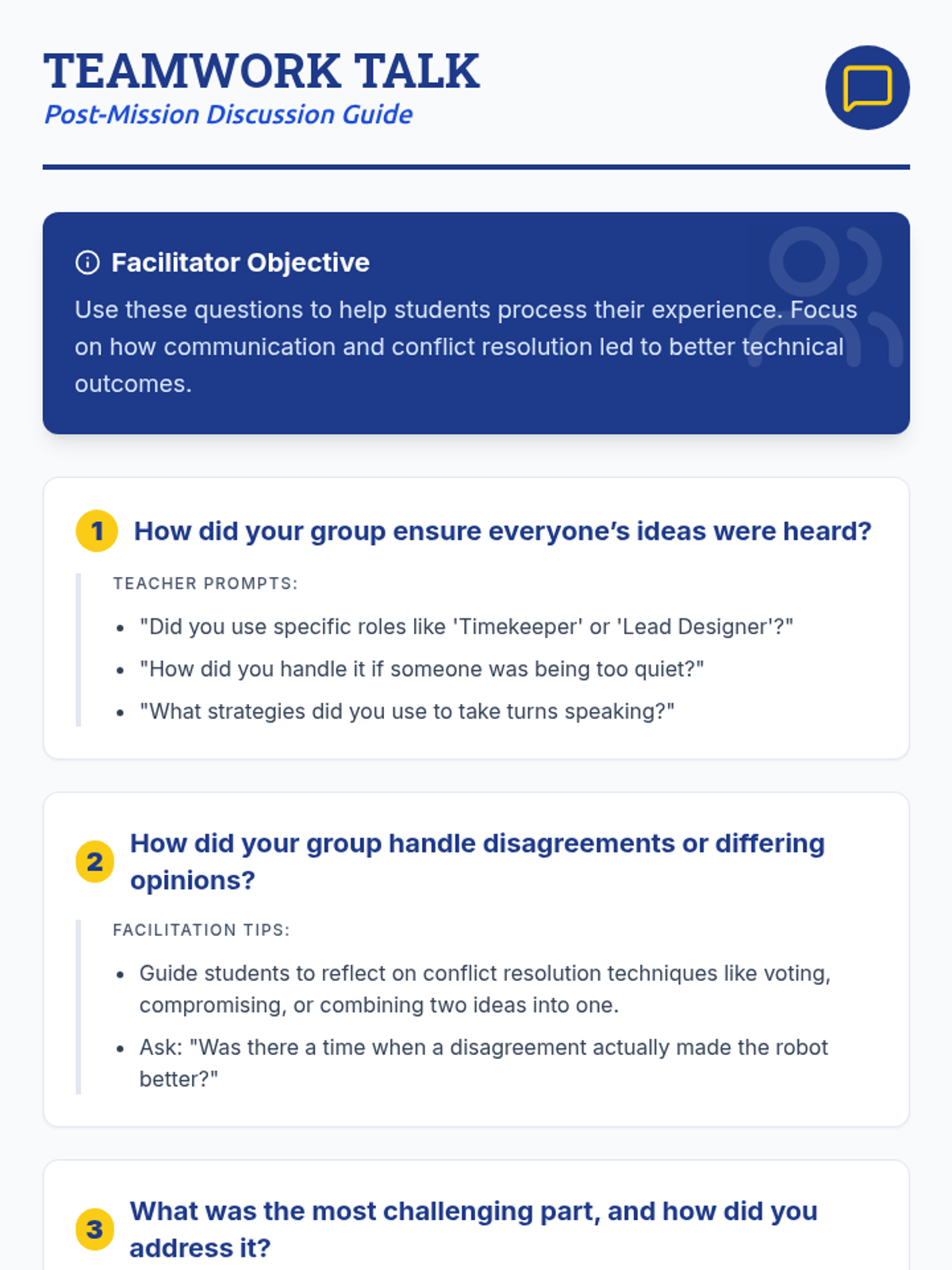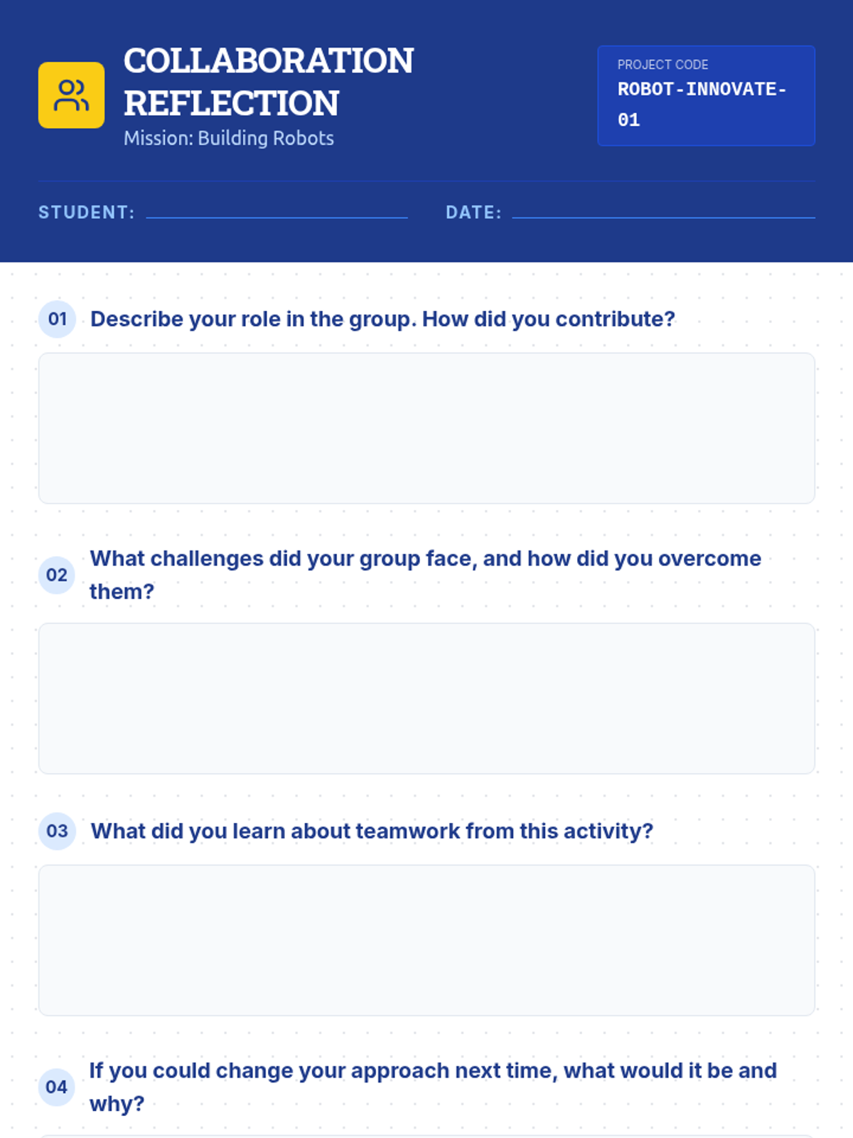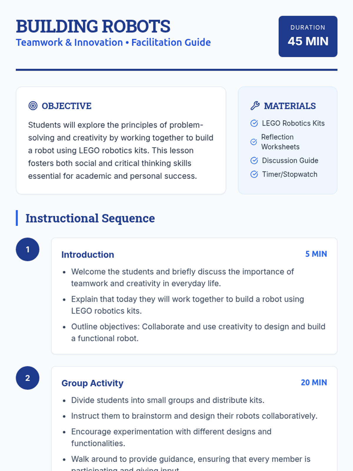 A hands-on LEGO robotics lesson where students collaborate to design and build functional robots, focusing on teamwork, creative problem-solving, and iterative design.