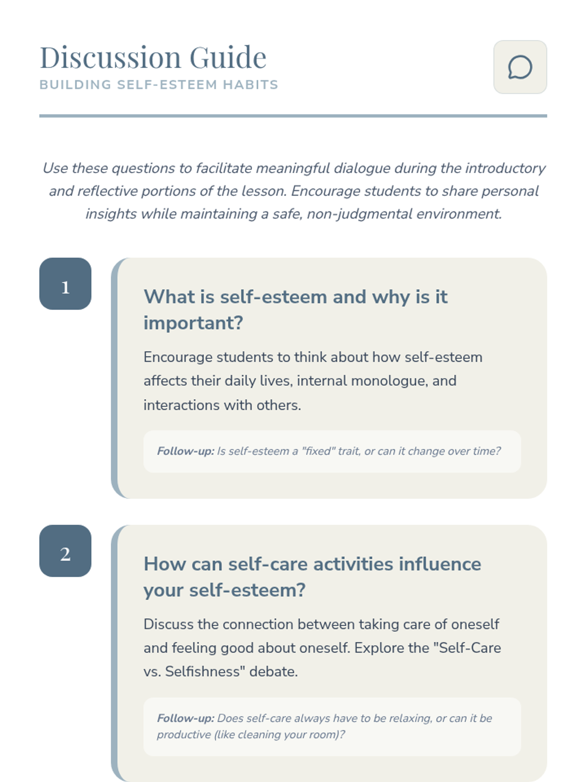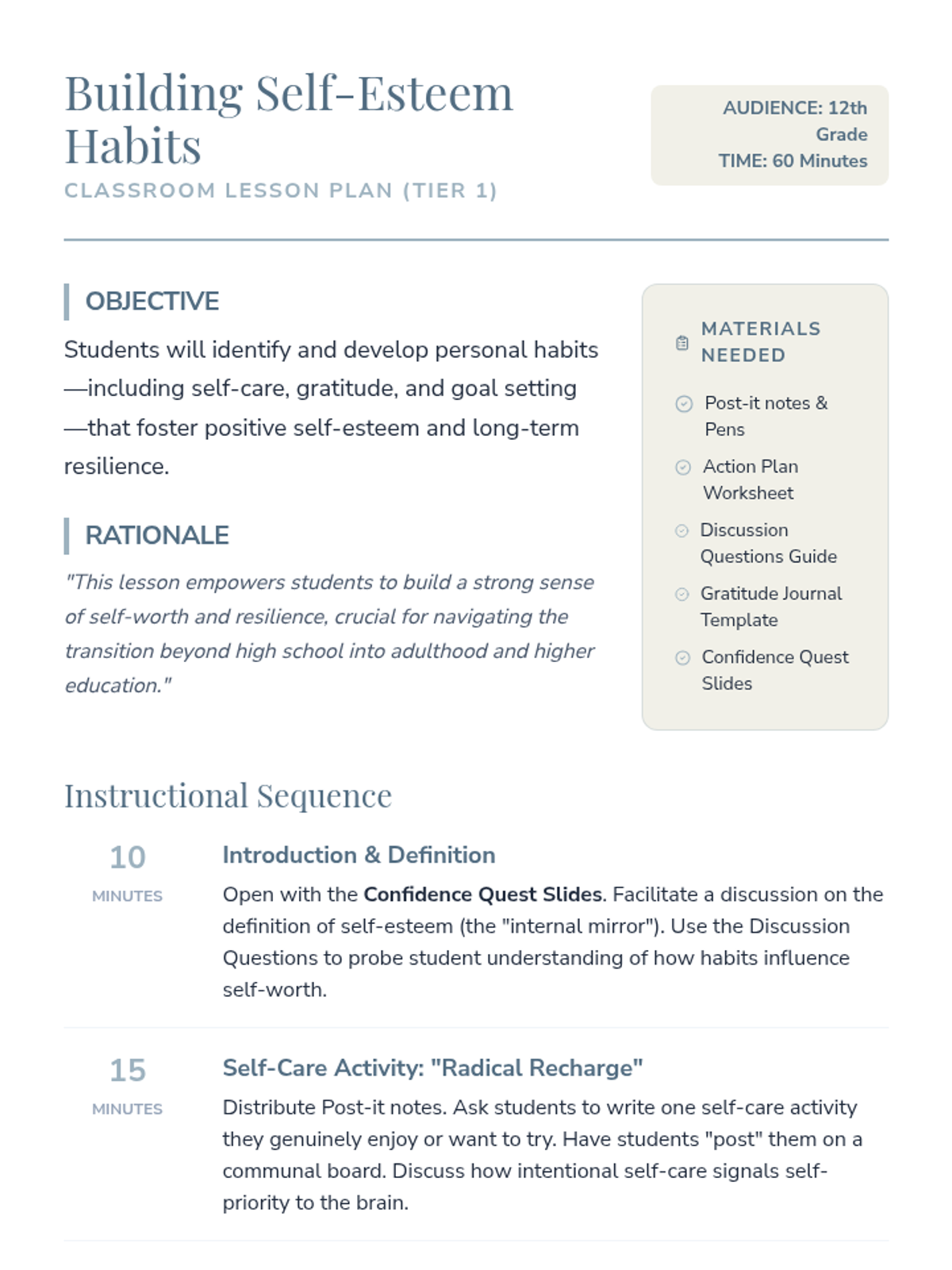 A comprehensive lesson for 12th graders focused on cultivating positive self-esteem through self-care, gratitude, and goal setting. Students will create a personalized action plan to build resilience and self-worth.