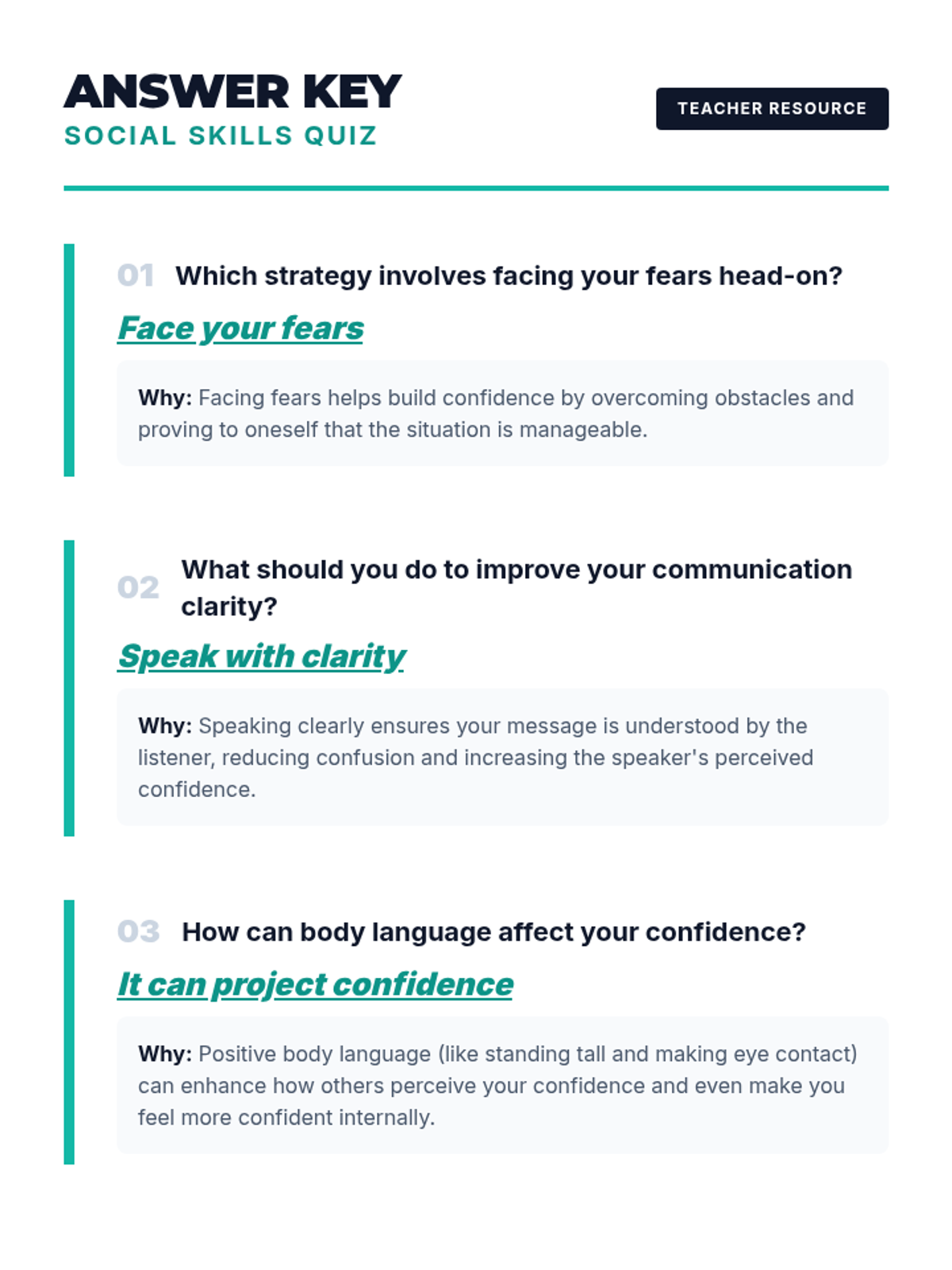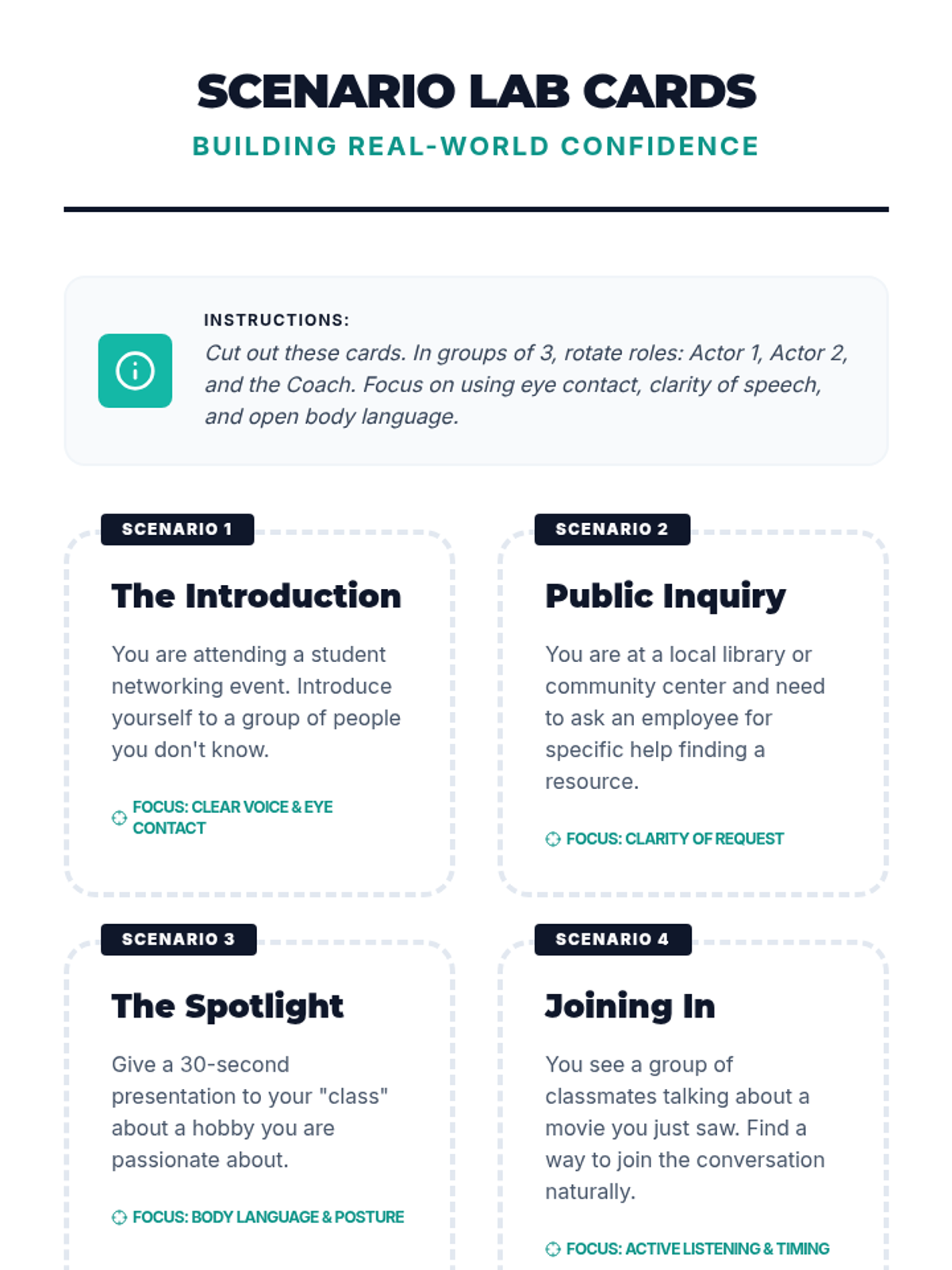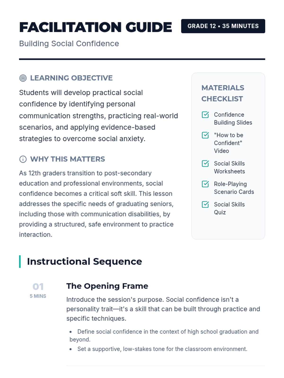 A comprehensive lesson for 12th graders focused on building social confidence through video reflection, role-playing, and personal goal-setting. Students learn practical communication strategies to navigate personal and professional environments.
