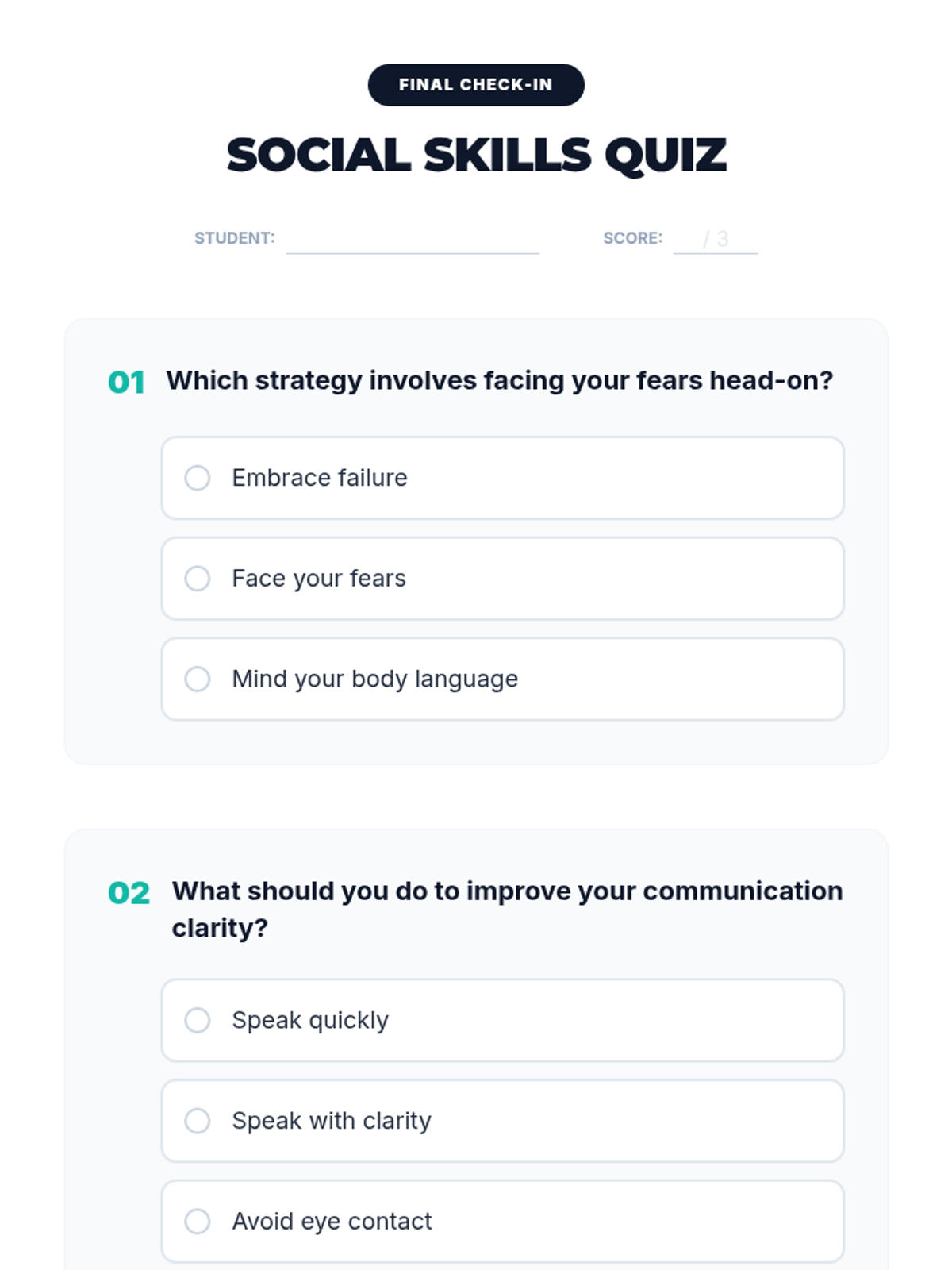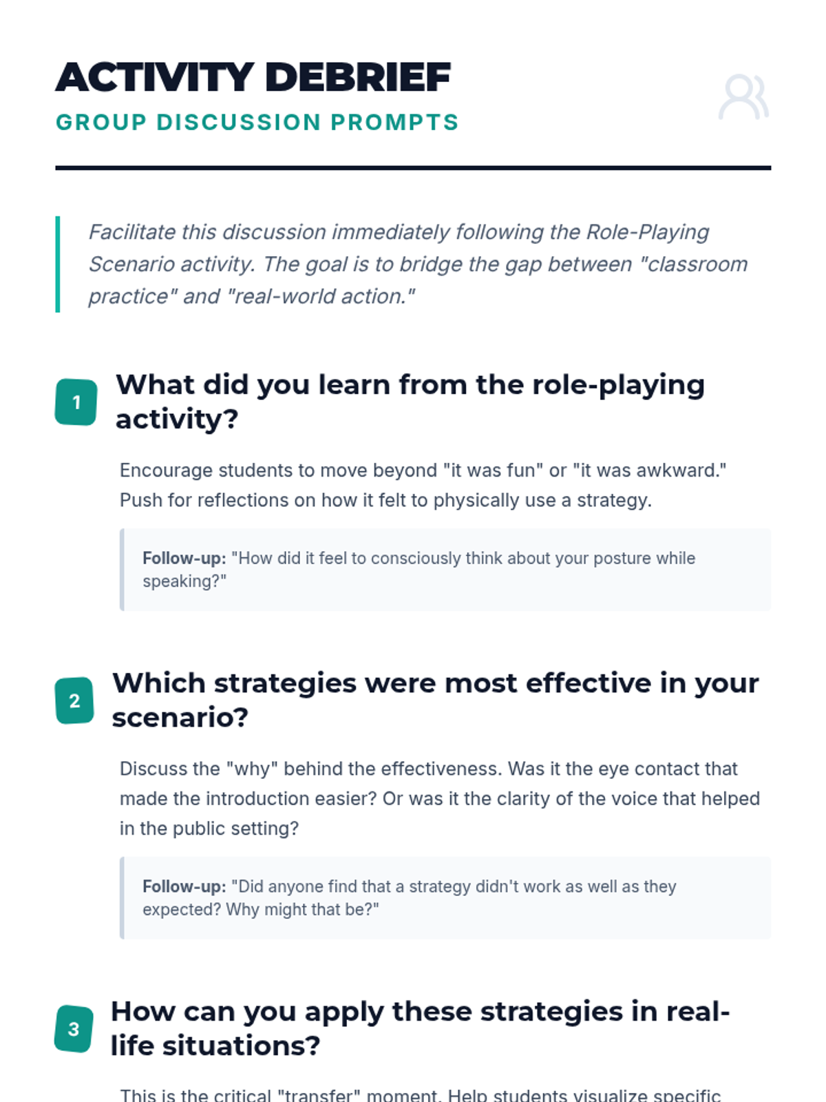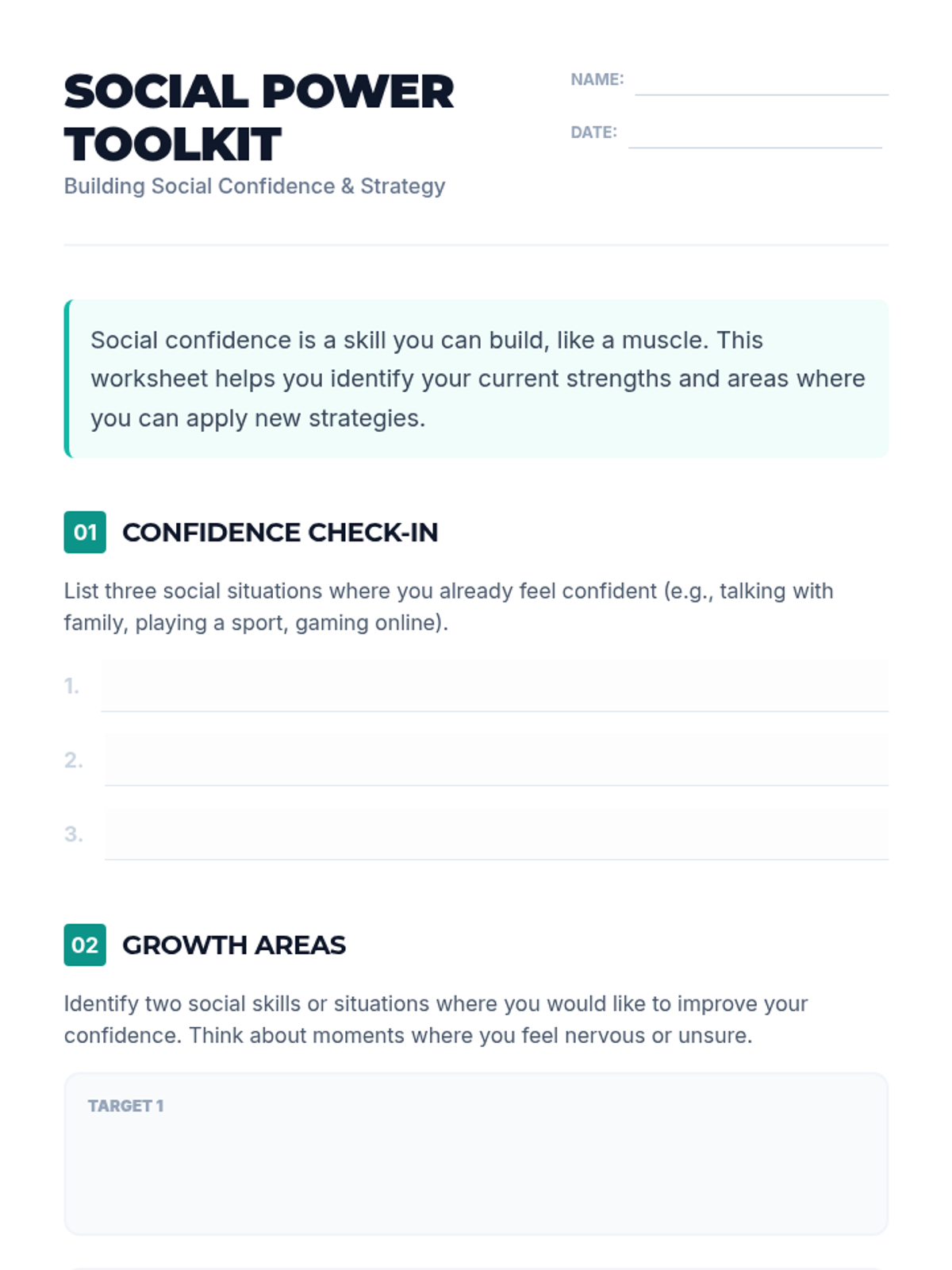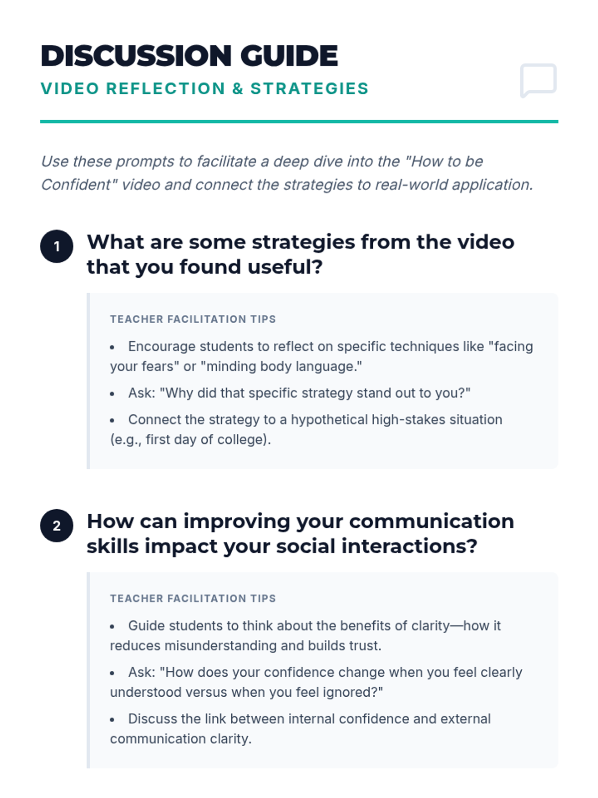 A comprehensive lesson for 12th graders focused on building social confidence through video reflection, role-playing, and personal goal-setting. Students learn practical communication strategies to navigate personal and professional environments.